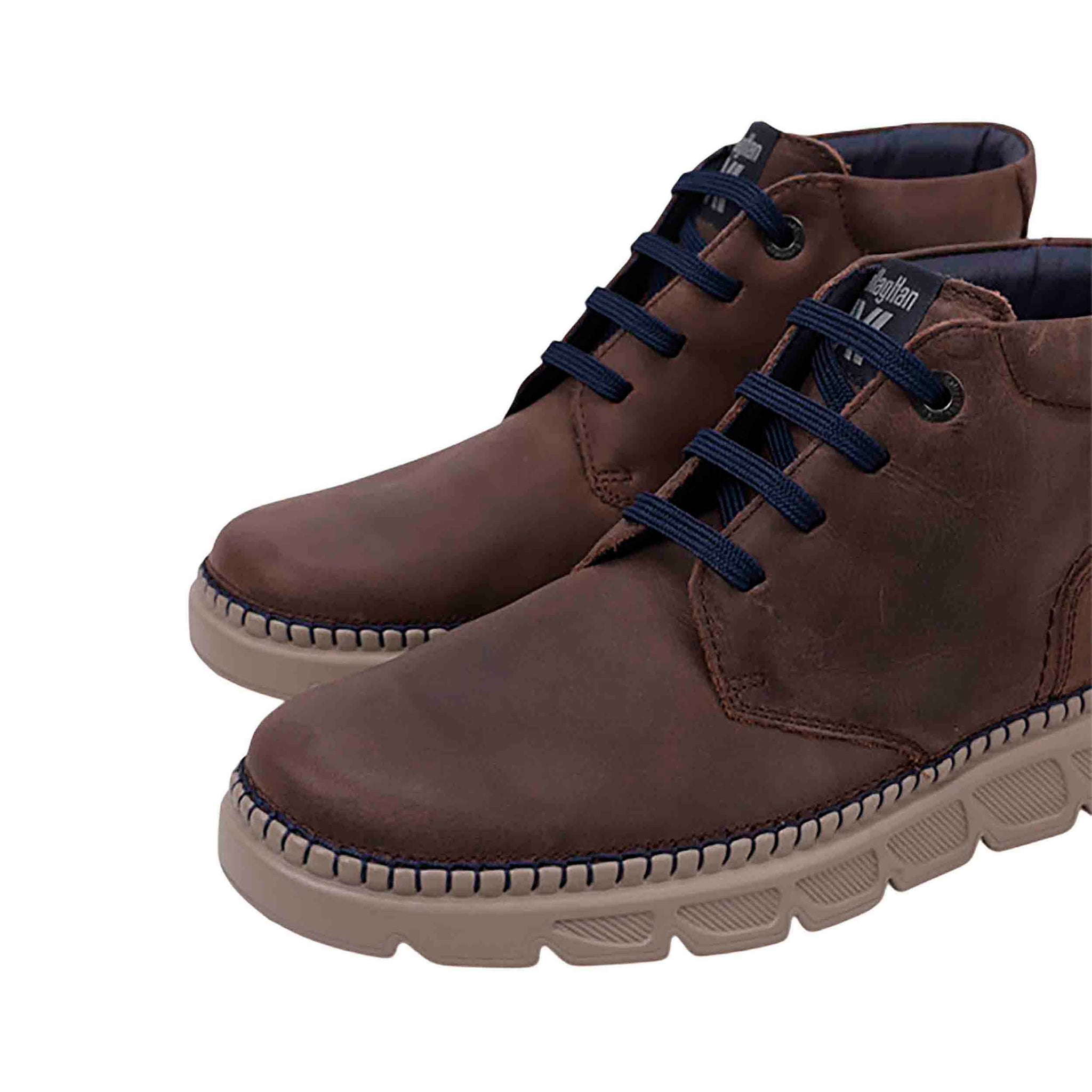 Diseño con líneas sobrias en marrón y detalles azul aporta un estilo elegante pero discreto, combinando bien con vaqueros o pantalones de vestir. La altura del tacón, alrededor de 3,5 4 cm, ofrece un apoyo ligero sin perjudicar la estética ni la estabilidad. El cierre mediante cordones asegura un ajuste firme al empeine, mientras que la estructura general brinda soporte en el tobillo propio de un botín.