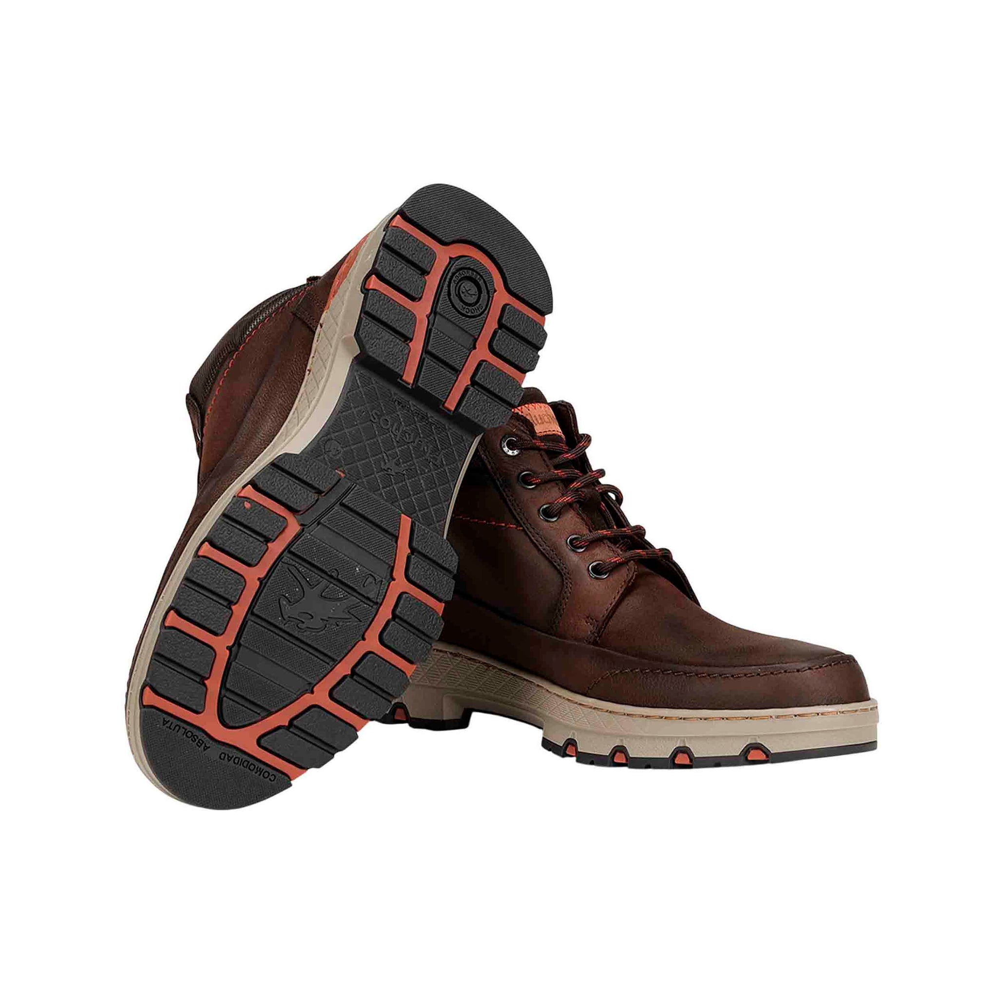 El diseño de corte medio y caña ligeramente elevada incluye una zona del tobillo acolchada que mitiga fricciones y mejora la sensación durante jornadas prolongadas. El cierre por cordones ajusta el botín al pie, asegurando sujeción incluso en terrenos irregulares. El cuero engrasado confiere un aspecto sobrio, natural y ligeramente patinado con el uso, aportando carácter y versatilidad para combinar con prendas casual o de estilo outdoor.