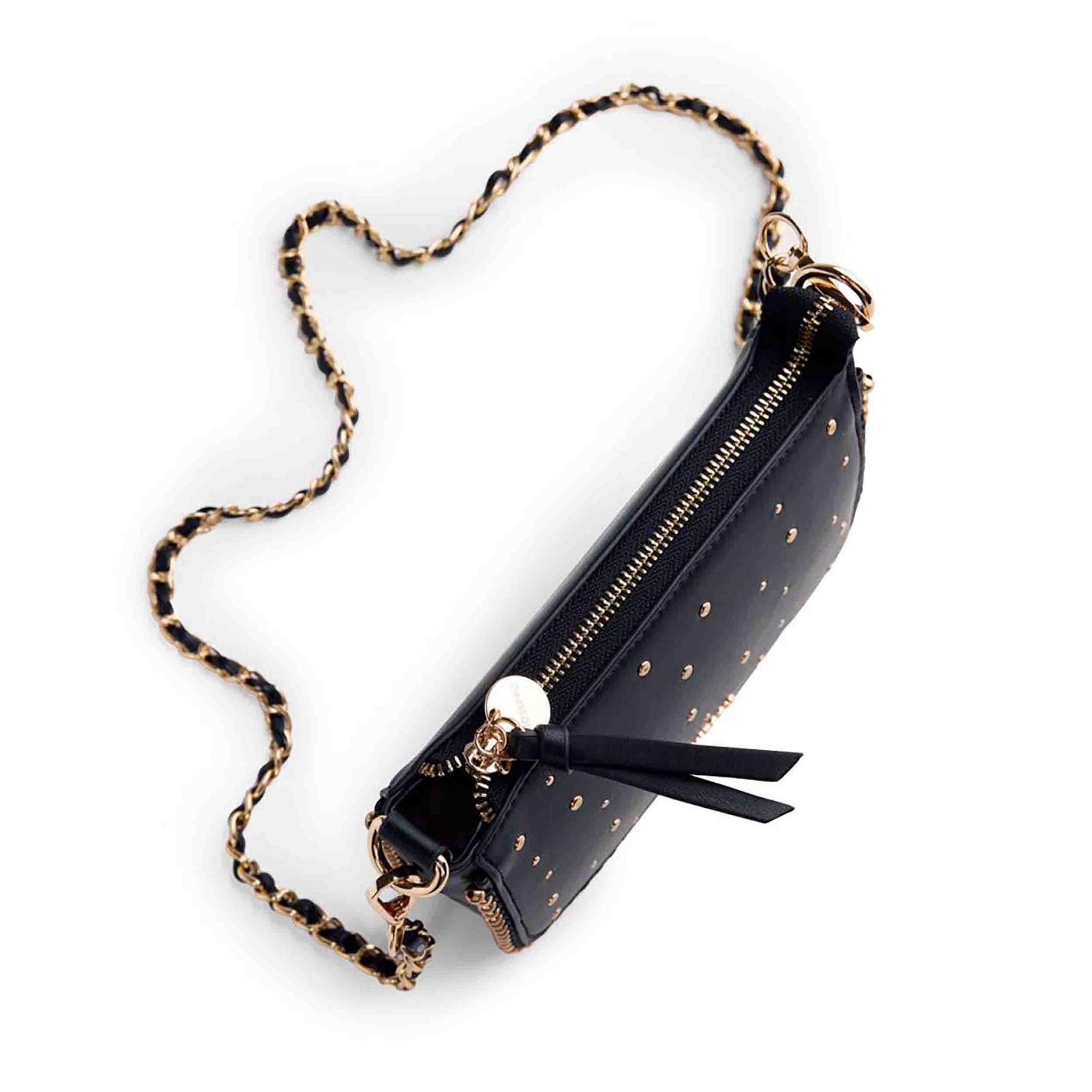 Su diseño compacto y estructurado incluye detalles de tachuelas que aportan personalidad sin restar sofisticación, convirtiéndolo en un accesorio versátil que combina con zapatillas, botines o incluso looks más formales. La silueta rígida asegura que el bolso conserve su forma, mientras que el cierre superior con cremallera protege tus pertenencias en todo momento.