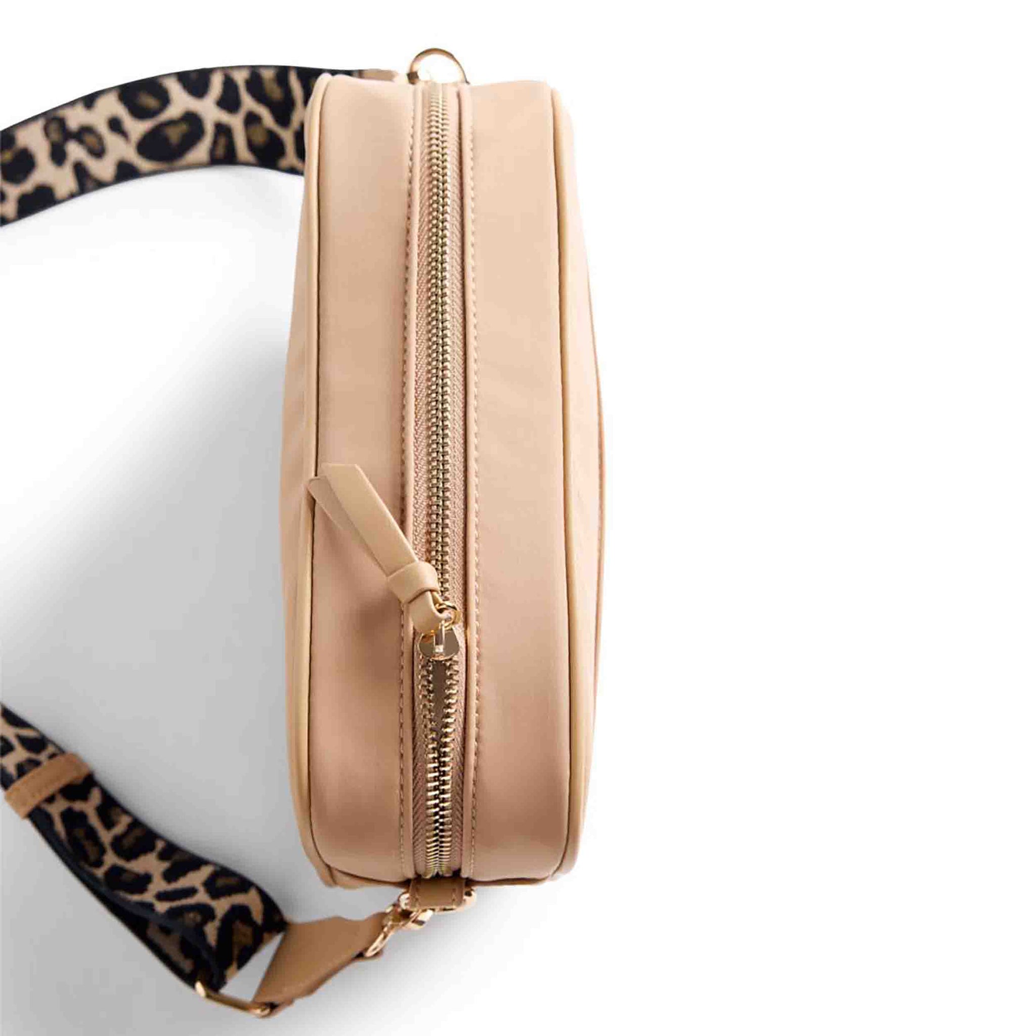El diseño incorpora un asa larga con estampado animal que funciona como bandolera ajustable, permitiéndote llevarlo cruzado o al hombro según la ocasión. El cierre principal y los detalles frontales (bolsillo exterior con cierre magnético y acabados metálicos con logo dorado) ofrecen acceso rápido y un punto de estilo cuidado que añade presencia sin sobrecargar el conjunto. Estas funcionalidades hacen que el bolso sea práctico tanto para el día como para salidas informales.