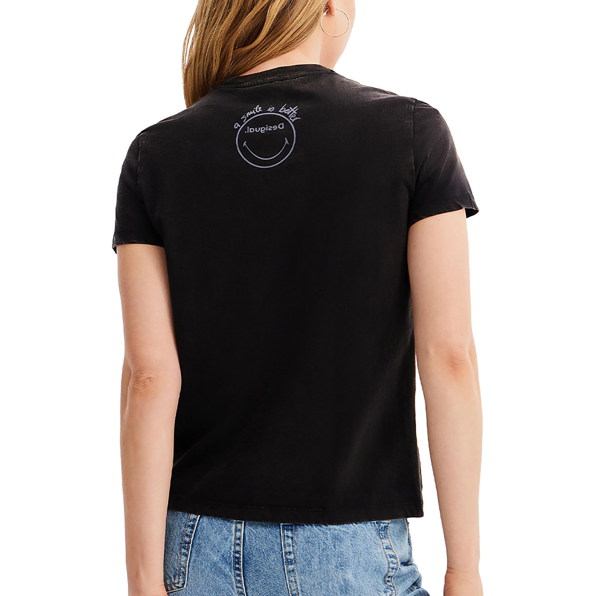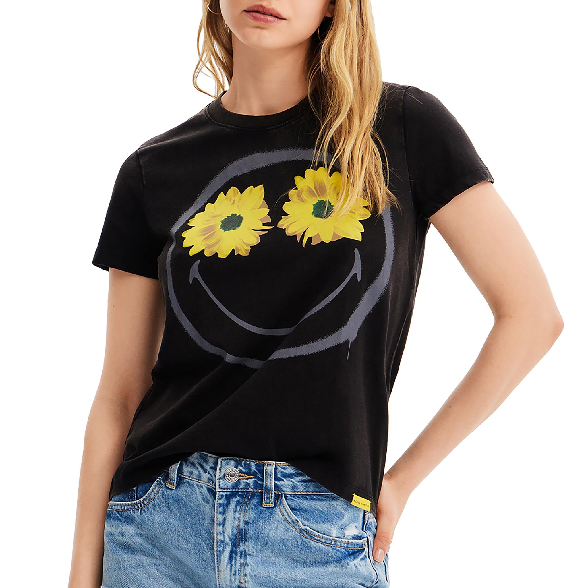 Camiseta de manga corta Smiley® con detalle de flor en la parte delantera y mensaje en la espalda.