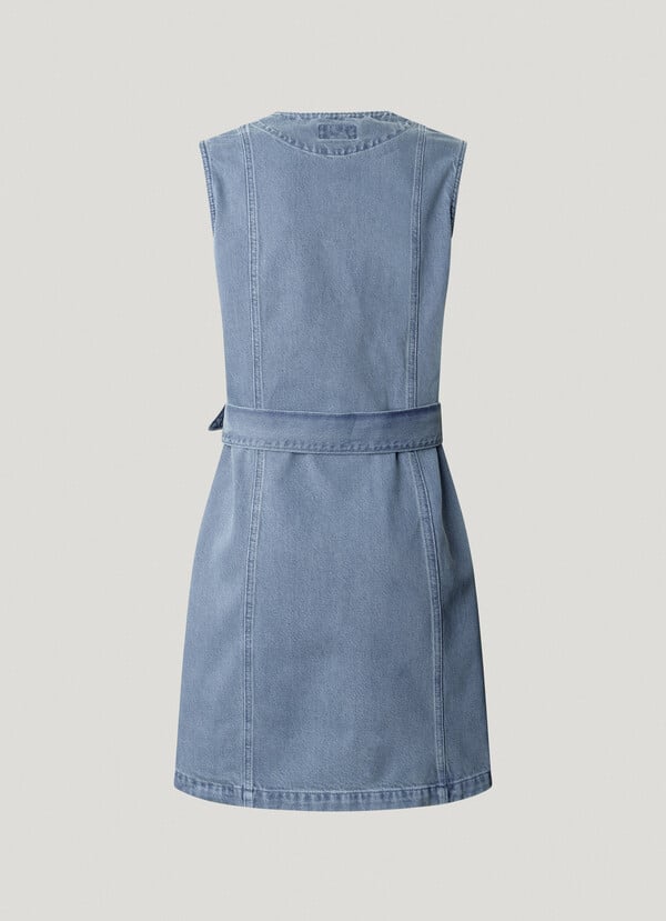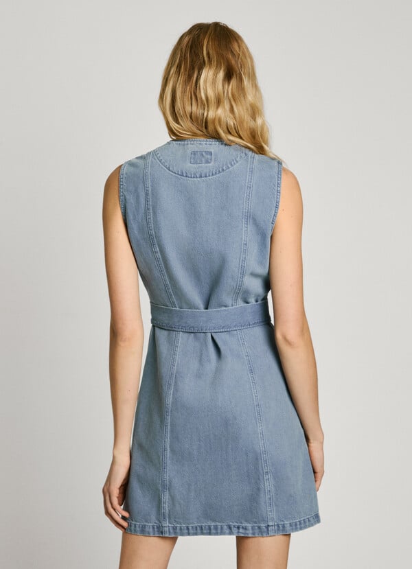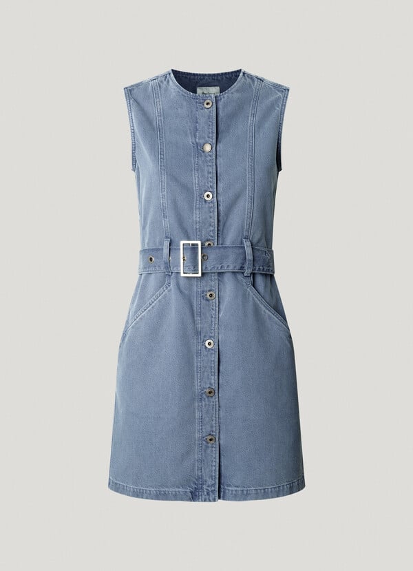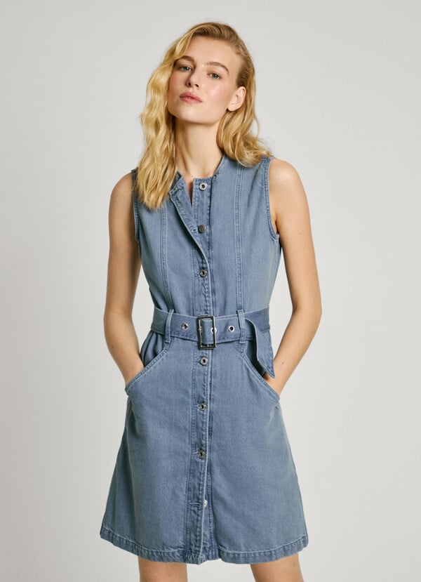 Este vestido sin mangas presenta un diseño de corte recto con cuello redondo, adaptándose al cuerpo sin resultar ajustado gracias a su fit regular. El cierre frontal abotonado añade un detalle funcional y estético, mientras que el cinturón del mismo tejido con hebilla metálica permite ajustar la prenda a la figura, realzando la silueta femenina. Los bolsillos laterales en diagonal aportan un toque práctico y moderno, completando el diseño con un aire desenfadado y urbano.