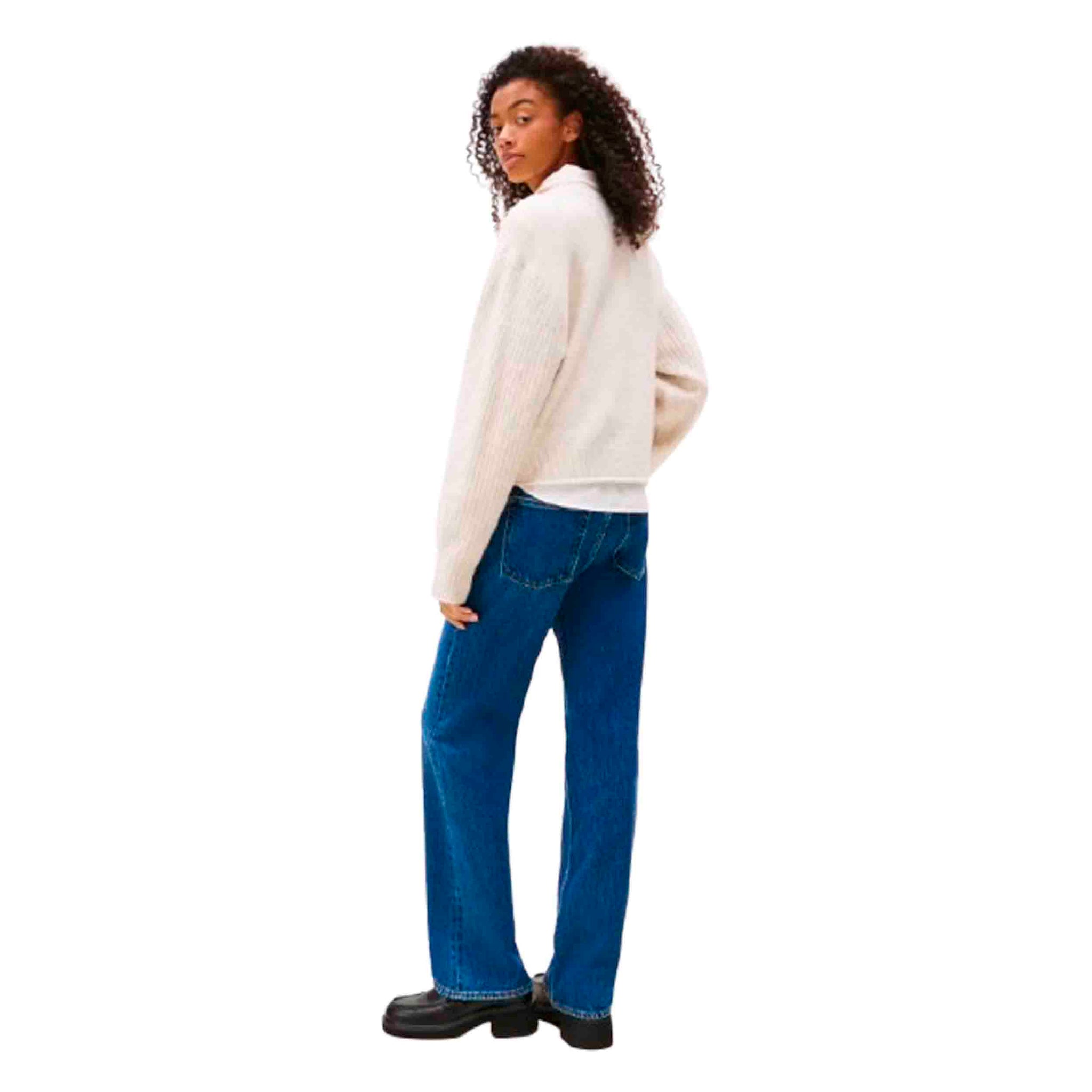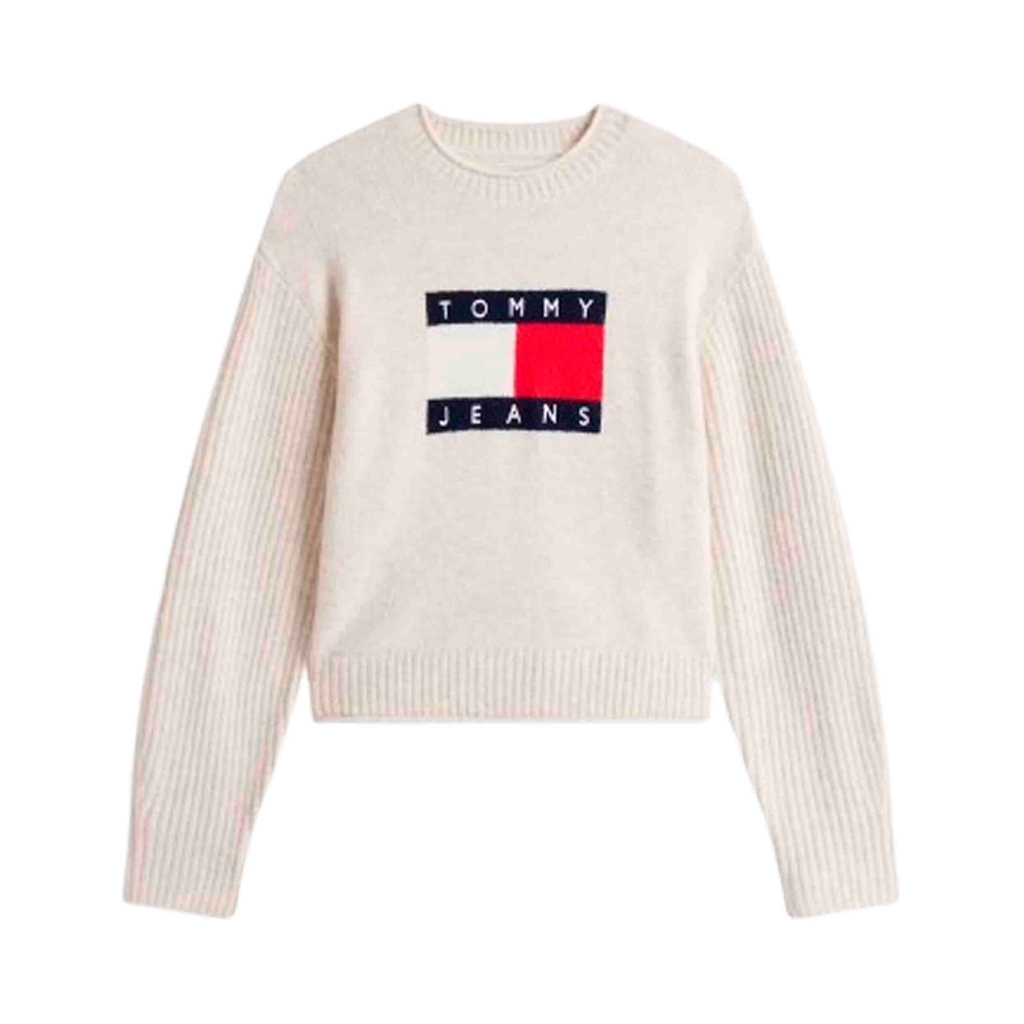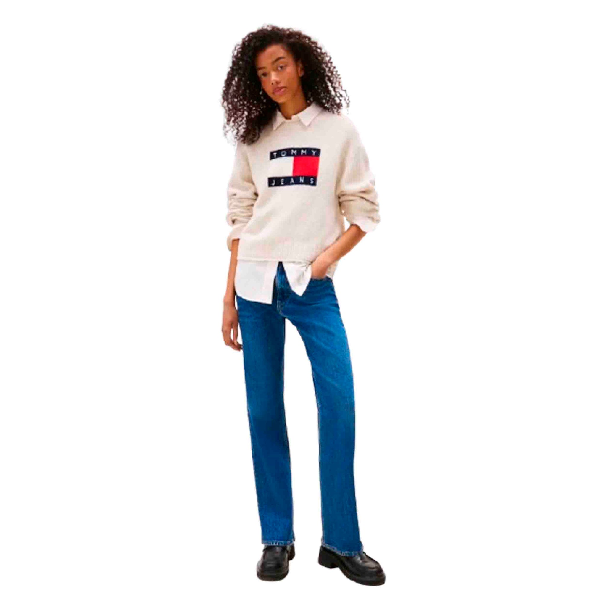 El detalle distintivo de este jersey es el logo de Tommy Jeans en intarsia en el pecho, que aporta un toque de identidad y estilo a la prenda. El color blanco lo convierte en una opción versátil que combina fácilmente con una amplia gama de colores y estilos, desde jeans hasta faldas, adaptándose tanto a looks casuales como más sofisticados.