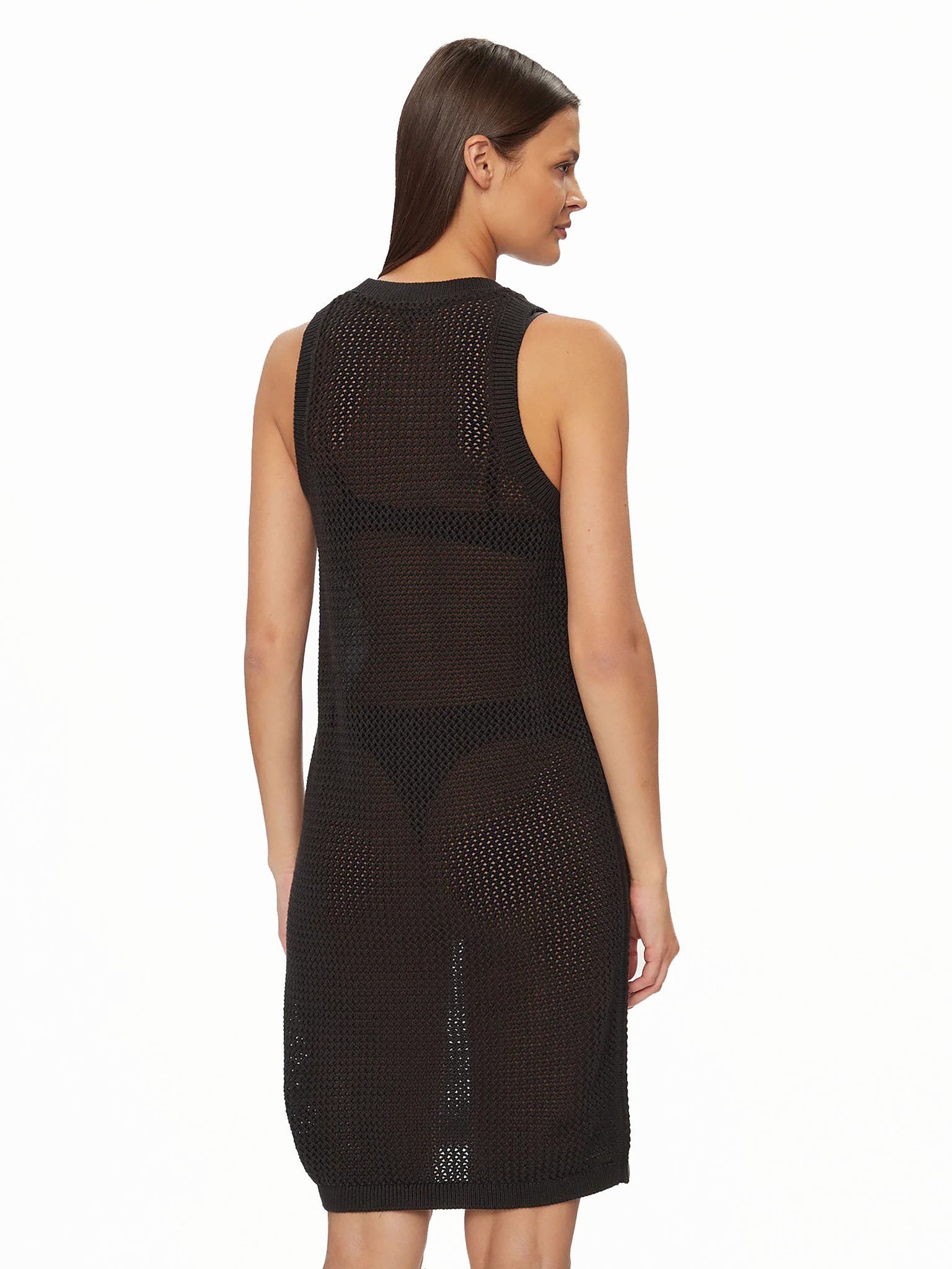 Da un toque noventero a tu estilo con este vestido de punto calado que luce detalles distintivos tonales en la parte delantera.