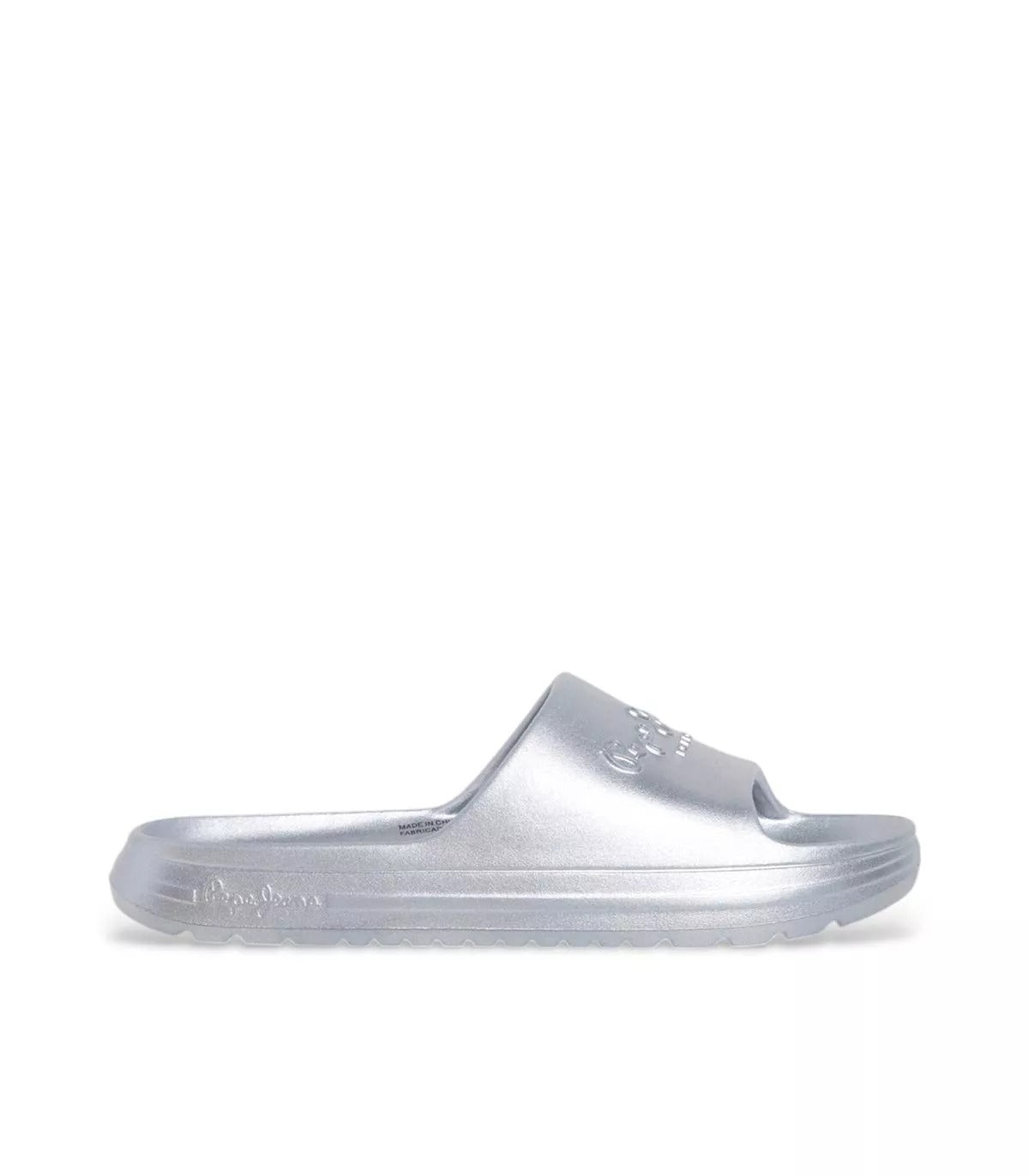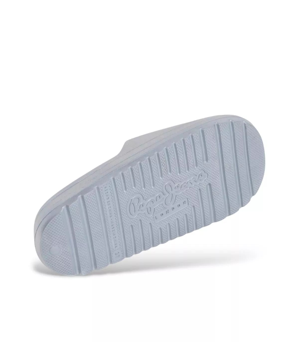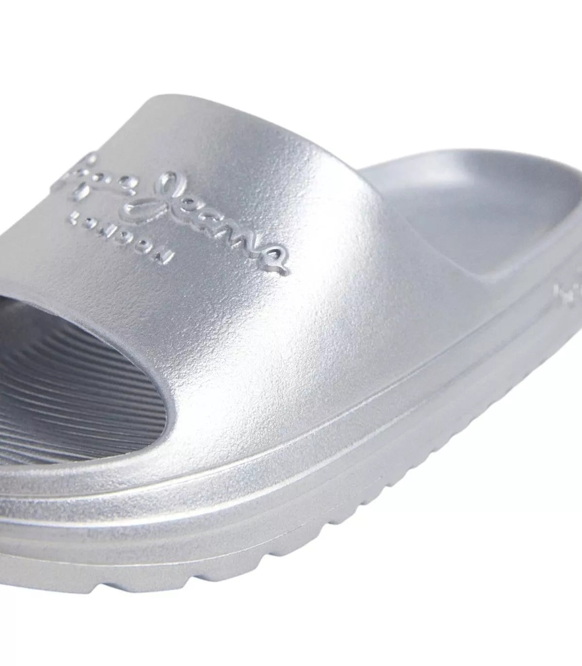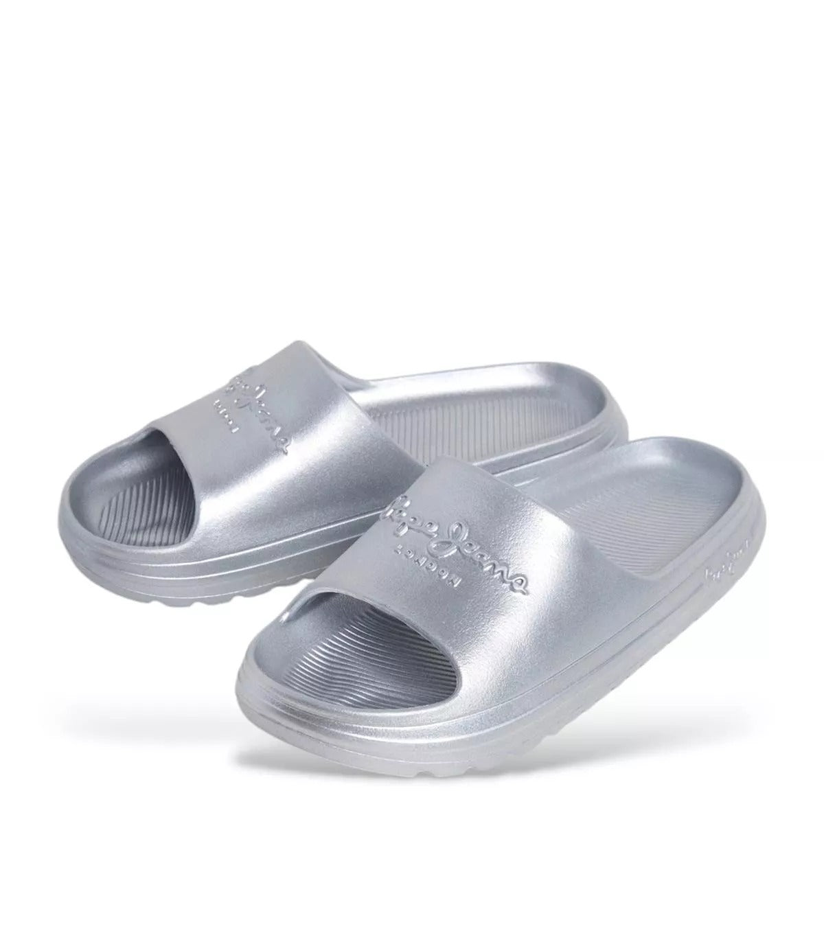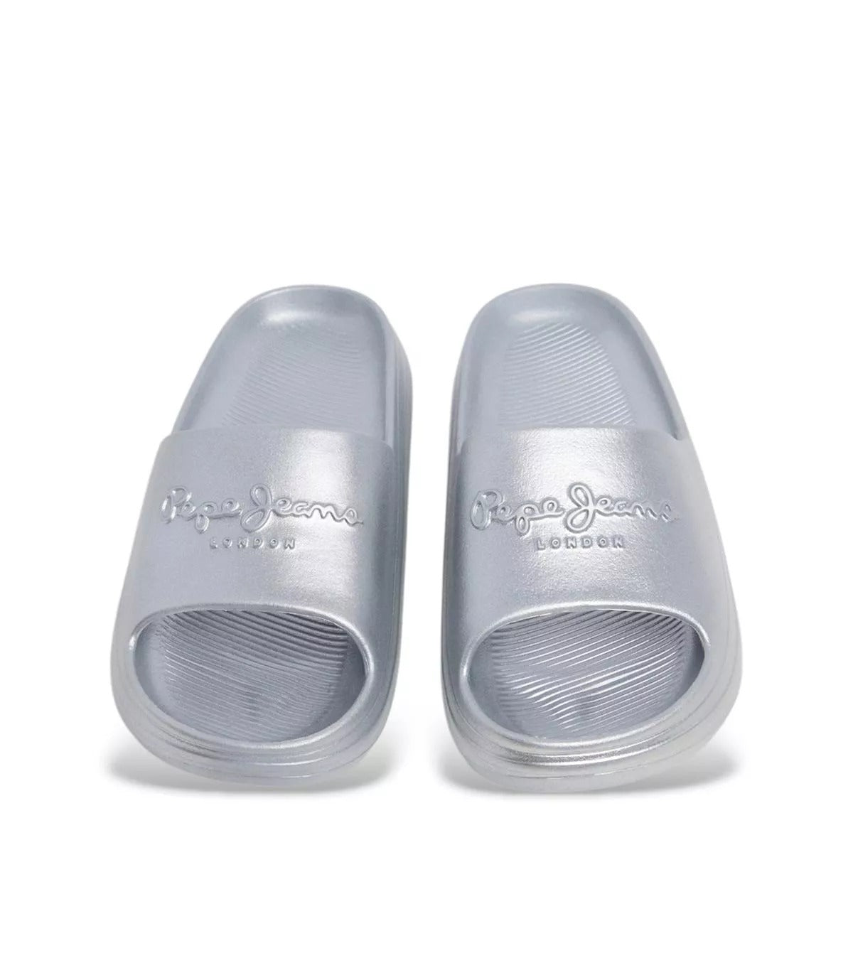 La pala ancha, que cubre el empeine, está decorada con el logotipo de Pepe Jeans en relieve, aportando un toque distintivo y moderno. La suela, también de material sintético, es antideslizante, lo que proporciona mayor seguridad al caminar sobre superficies mojadas. Además, su color plata metálico añade un toque de elegancia y versatilidad, permitiéndote combinarlas con una amplia variedad de atuendos veraniegos.