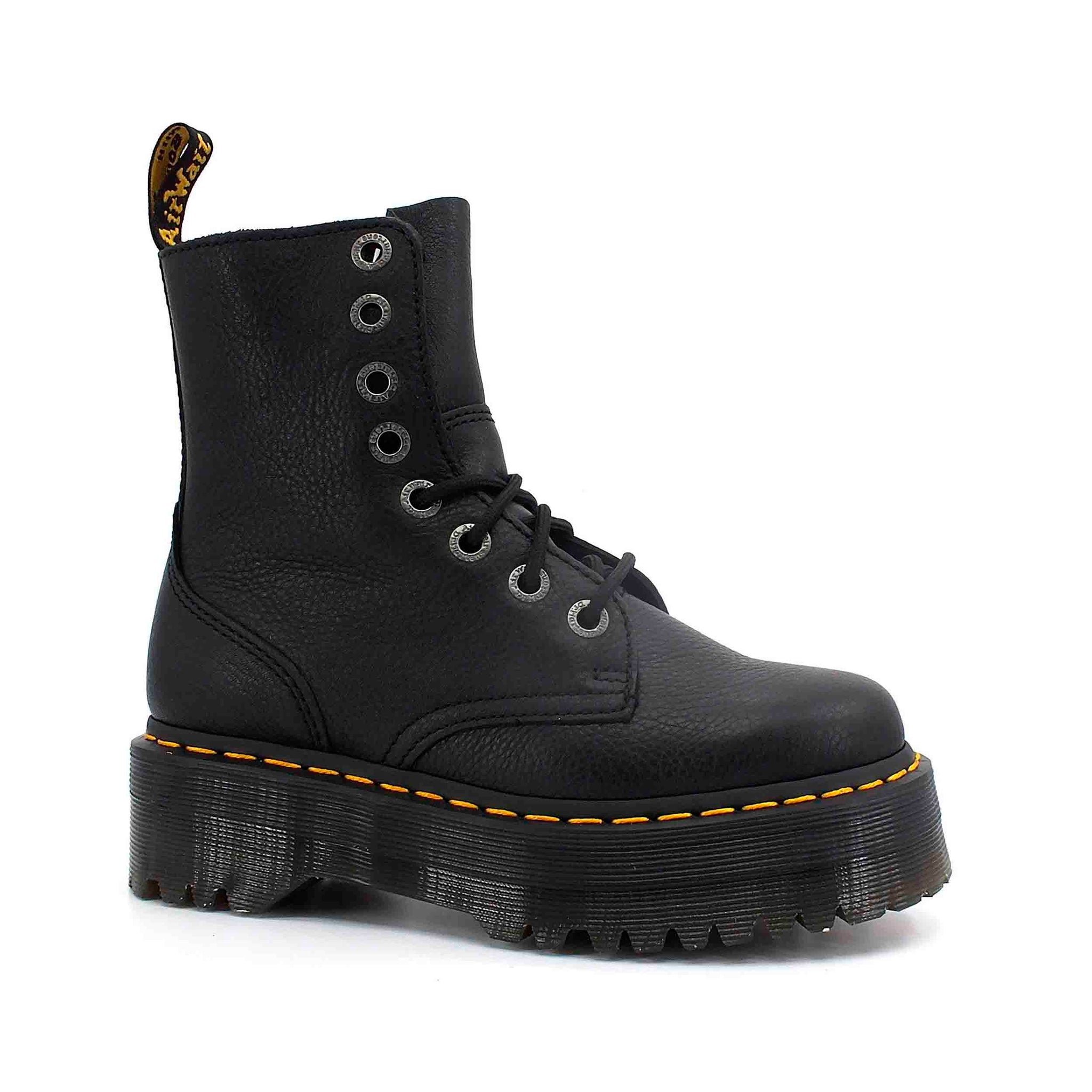 Fabricada en piel Pisa, aporta una textura granulada suave y agradable al tacto, con un acabado encerado que combina elegancia y carácter. La construcción emplea técnica Goodyear welt termosellada, sellando el corte y la suela con resistencia al desgaste y asegurando una durabilidad prolongada. Integra una cerradura de ocho ojales junto con una cremallera interior que facilita el calce sin renunciar al ajuste tradicional de los cordones. La plataforma tipo “Quad” de PVC eleva la silueta con una altura aproximada de 1,5 pulgadas (alrededor de 3,8 cm), mientras que el tacón alcanza las 2 pulgadas (aprox. 5 cm), combinando presencia y amortiguación. En el interior, mezcla de materiales como el cuero y el textil para ofrecer ventilación y confort continuo. La emblemática costura amarilla visible y el tirador trasero “AirWair” refuerzan su identidad reconocible al instante.