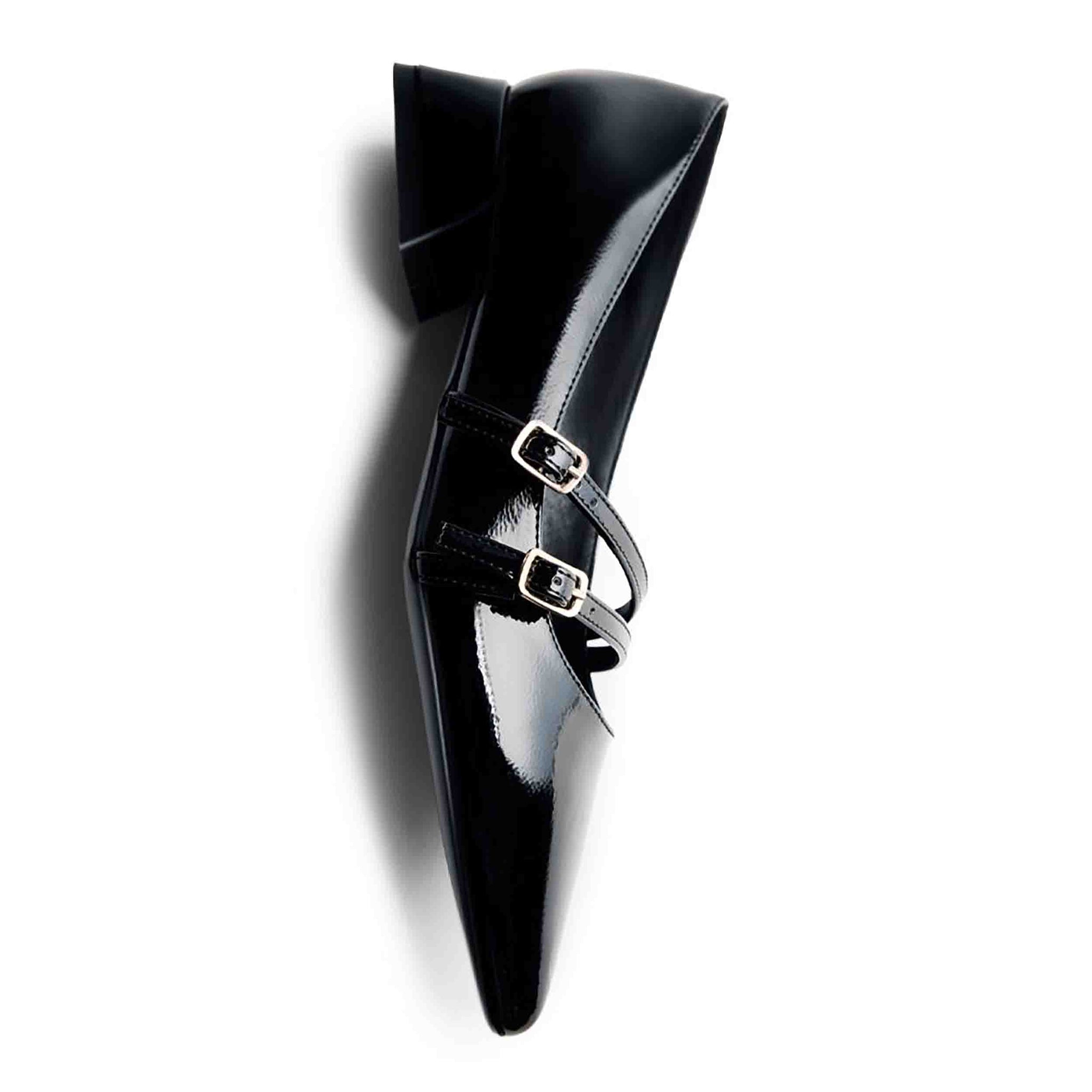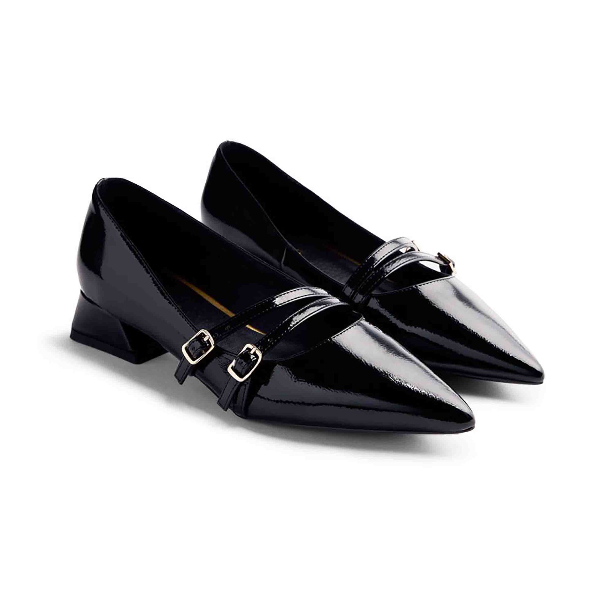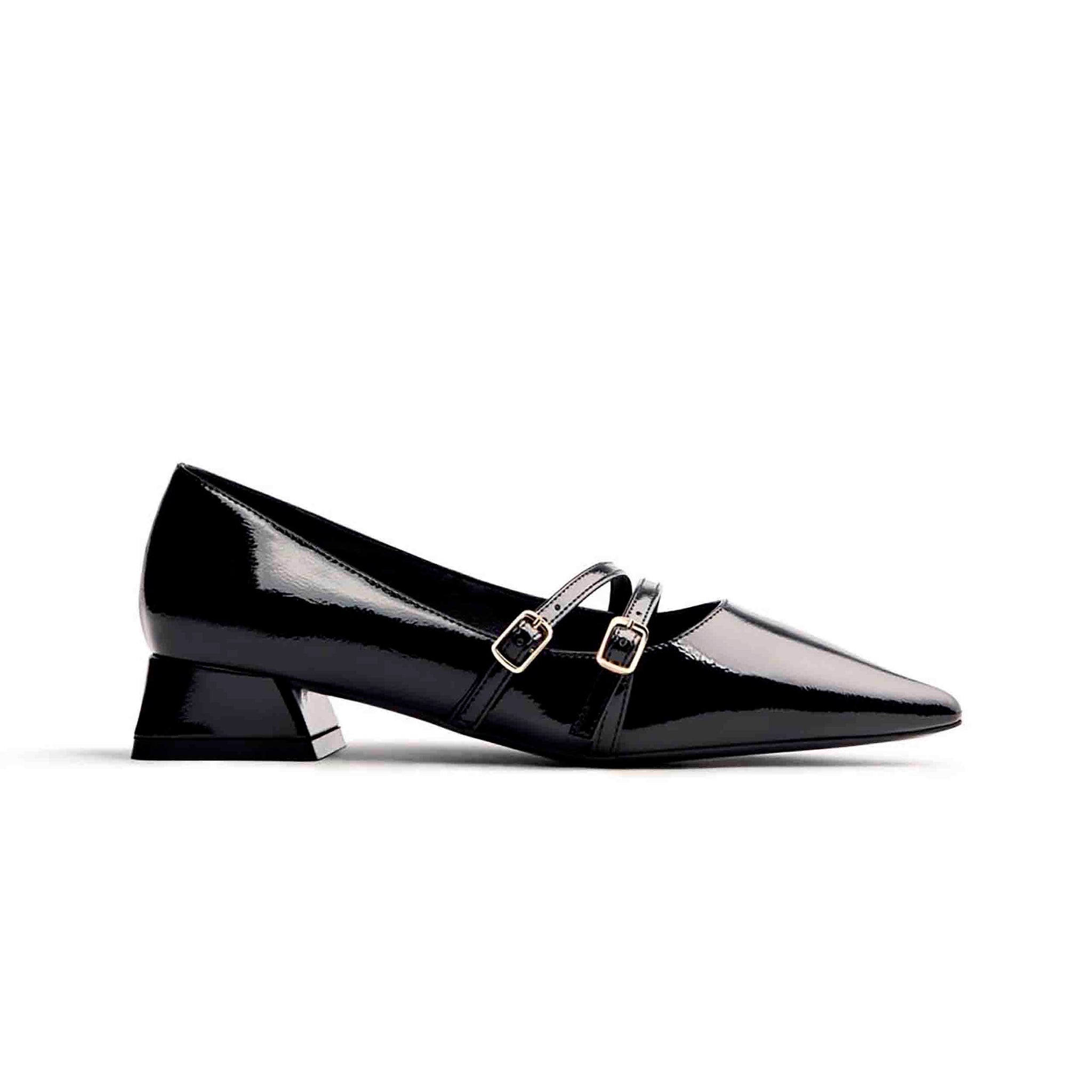 Su diseño presenta una punta afilada que estiliza la figura del pie, mientras que el tacón bajo tipo bloque, de aproximadamente 3 cm, proporciona estabilidad y confort durante todo el día. La plantilla acolchada mejora la pisada y reduce la fatiga en jornadas prolongadas. Además, el cierre ajustable en el empeine permite un ajuste personalizado, asegurando una sujeción óptima.