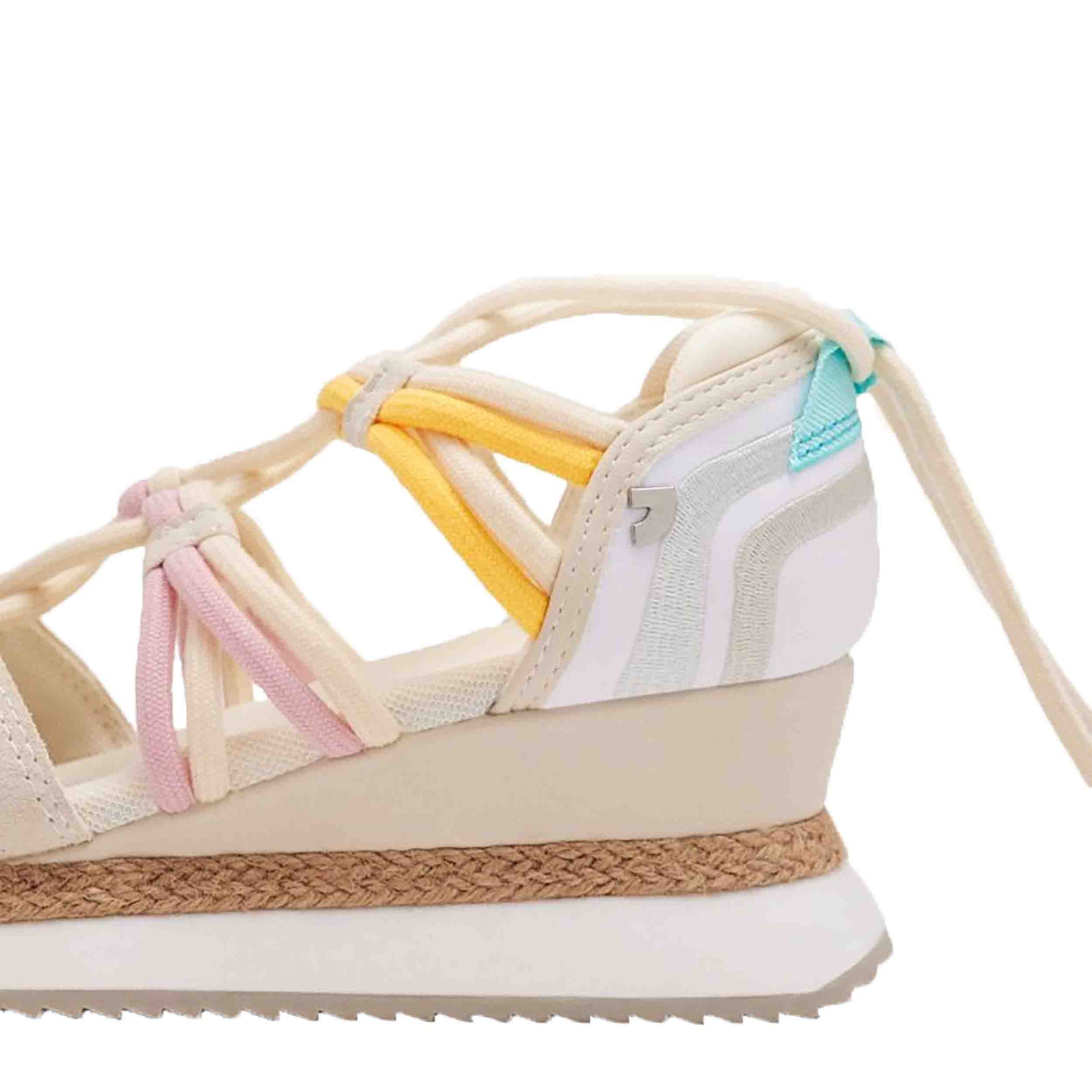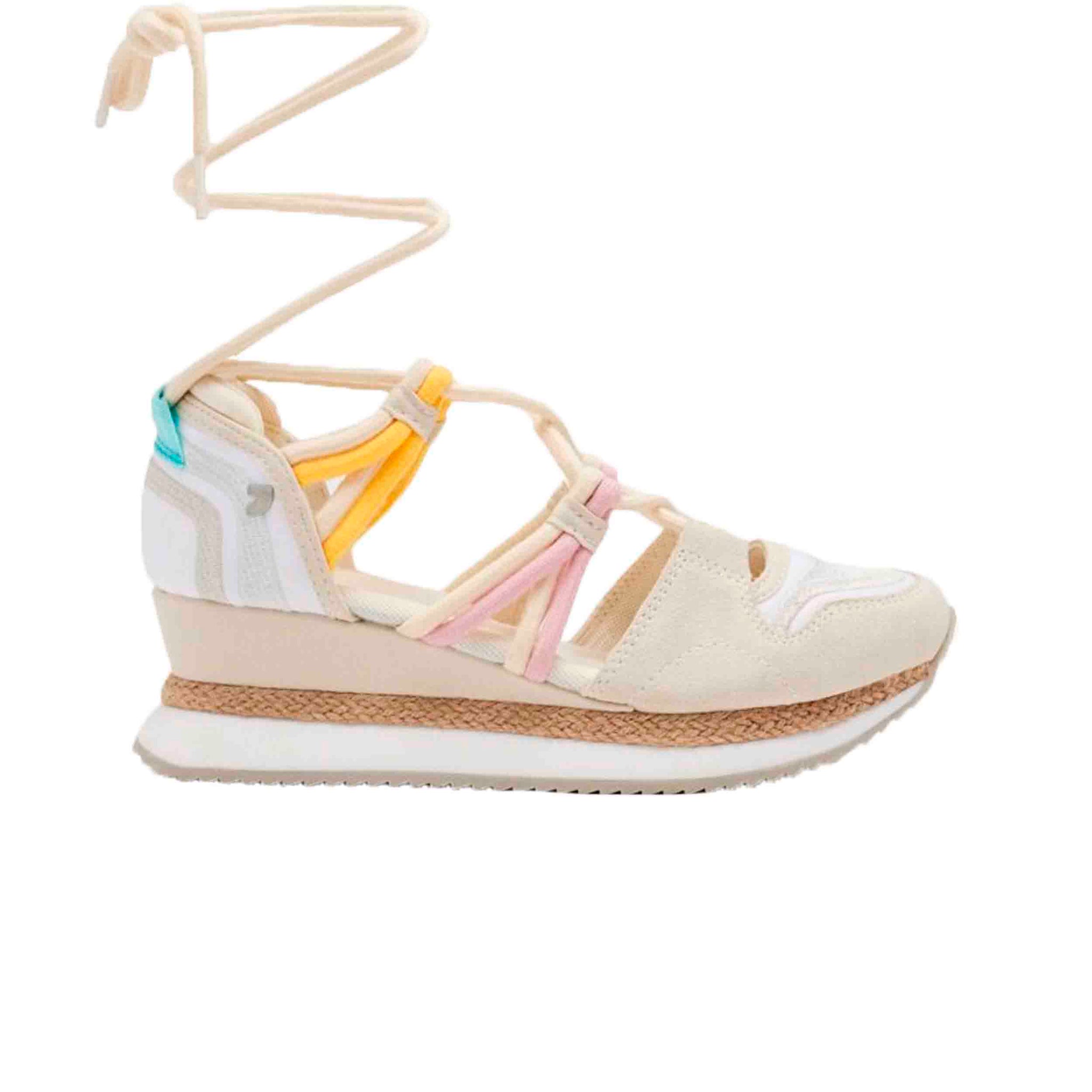 La cuña está elaborada en rafia, con una altura de 5,5 cm, que estiliza tu figura sin comprometer la comodidad. La suela de goma antideslizante garantiza una pisada firme y segura en distintas superficies.