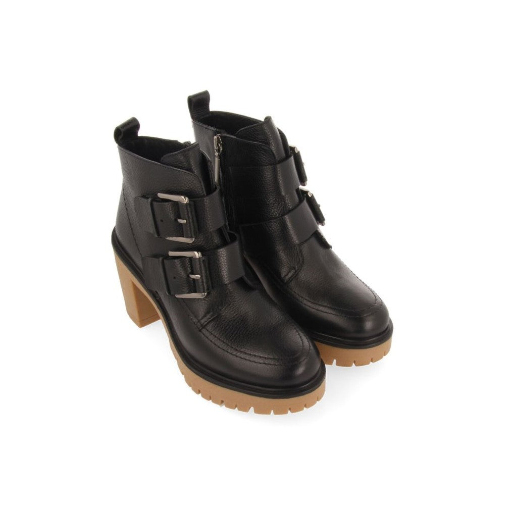 El botín más rompedor de la temporada está aquí. Botín con doble hebilla ajustable en piel de color negro. Con piso track y con el tacón ancho efecto crepé. Planta y vista de forro en piel LWG, muy acolchada con planta de látex. Forro en poliéster reciclado. Planta hecha con fibras naturales. Piso de caucho TPR.