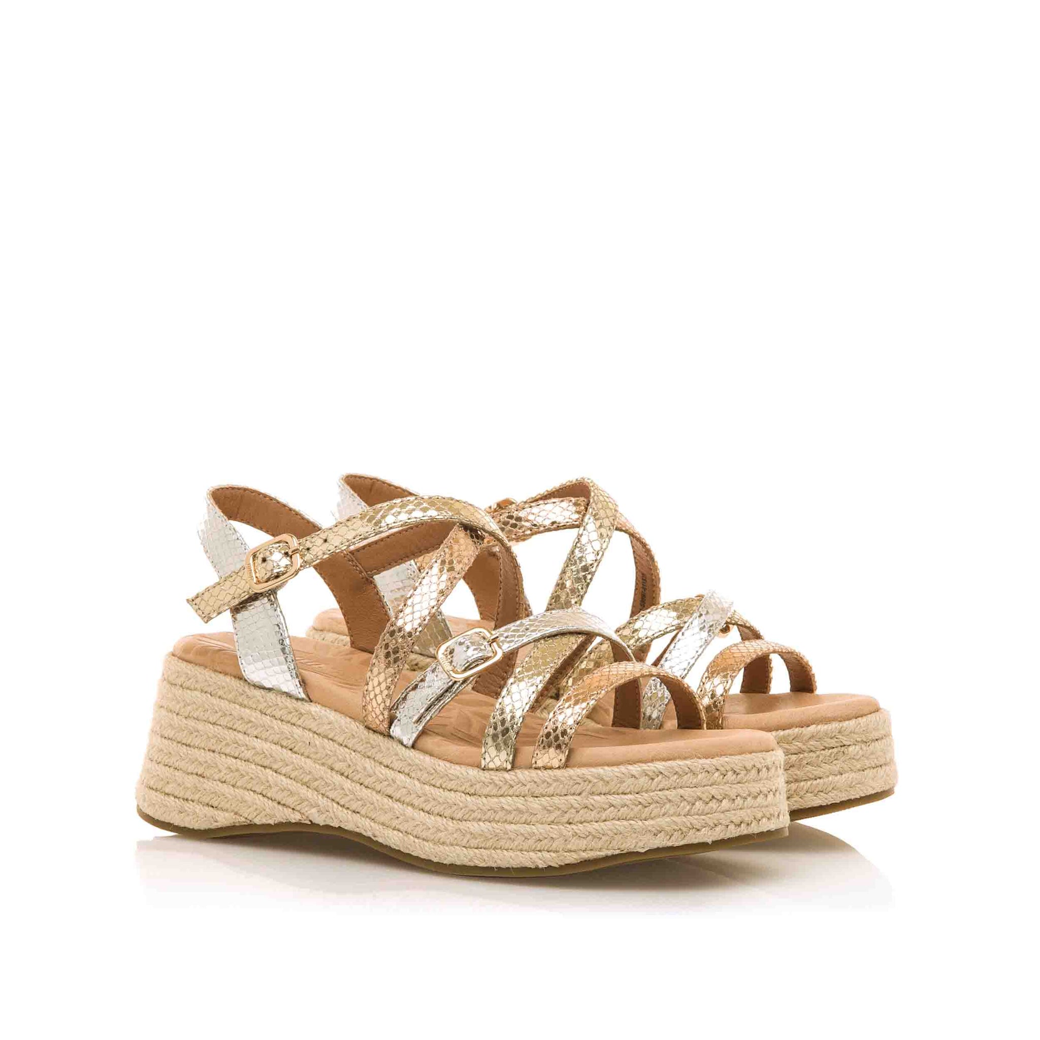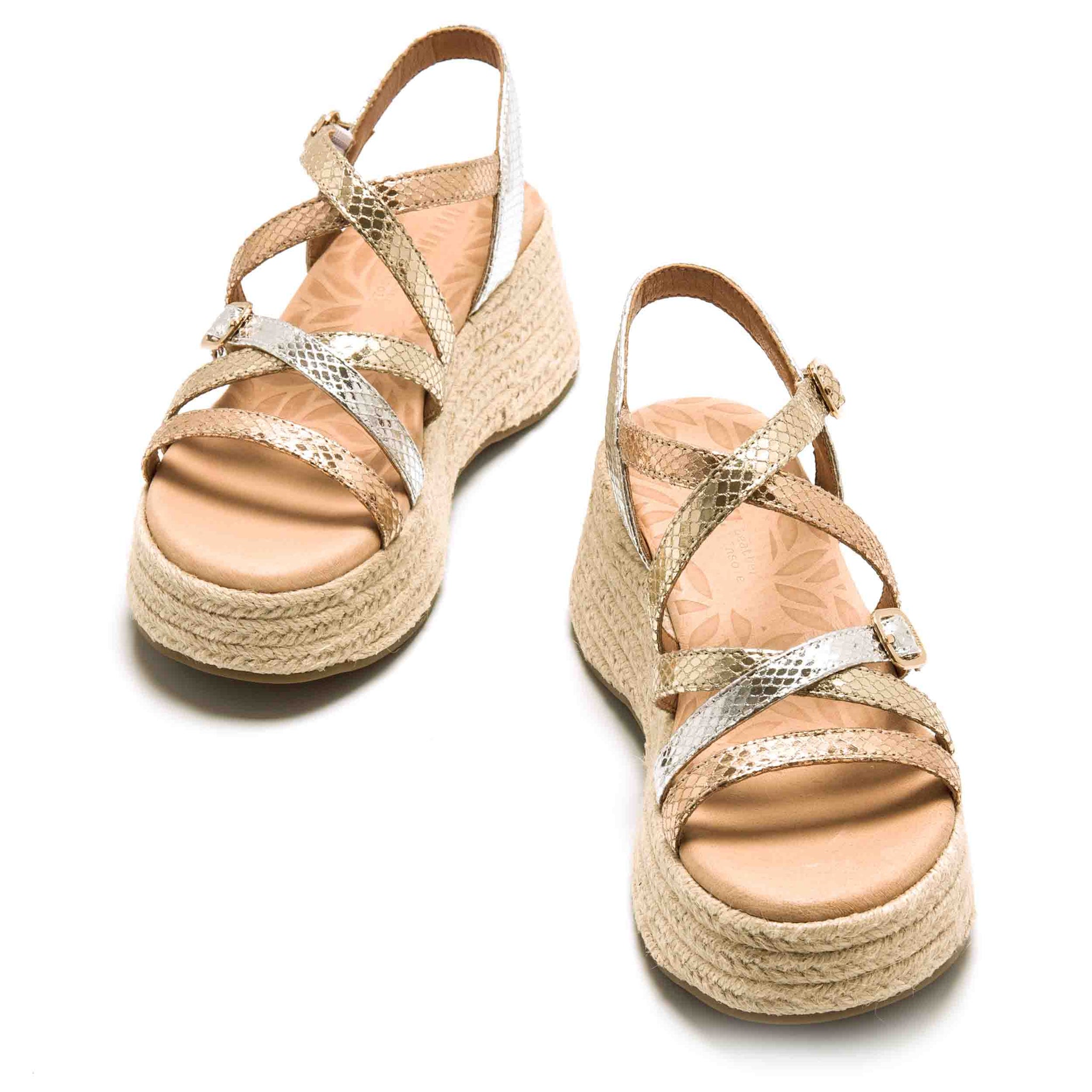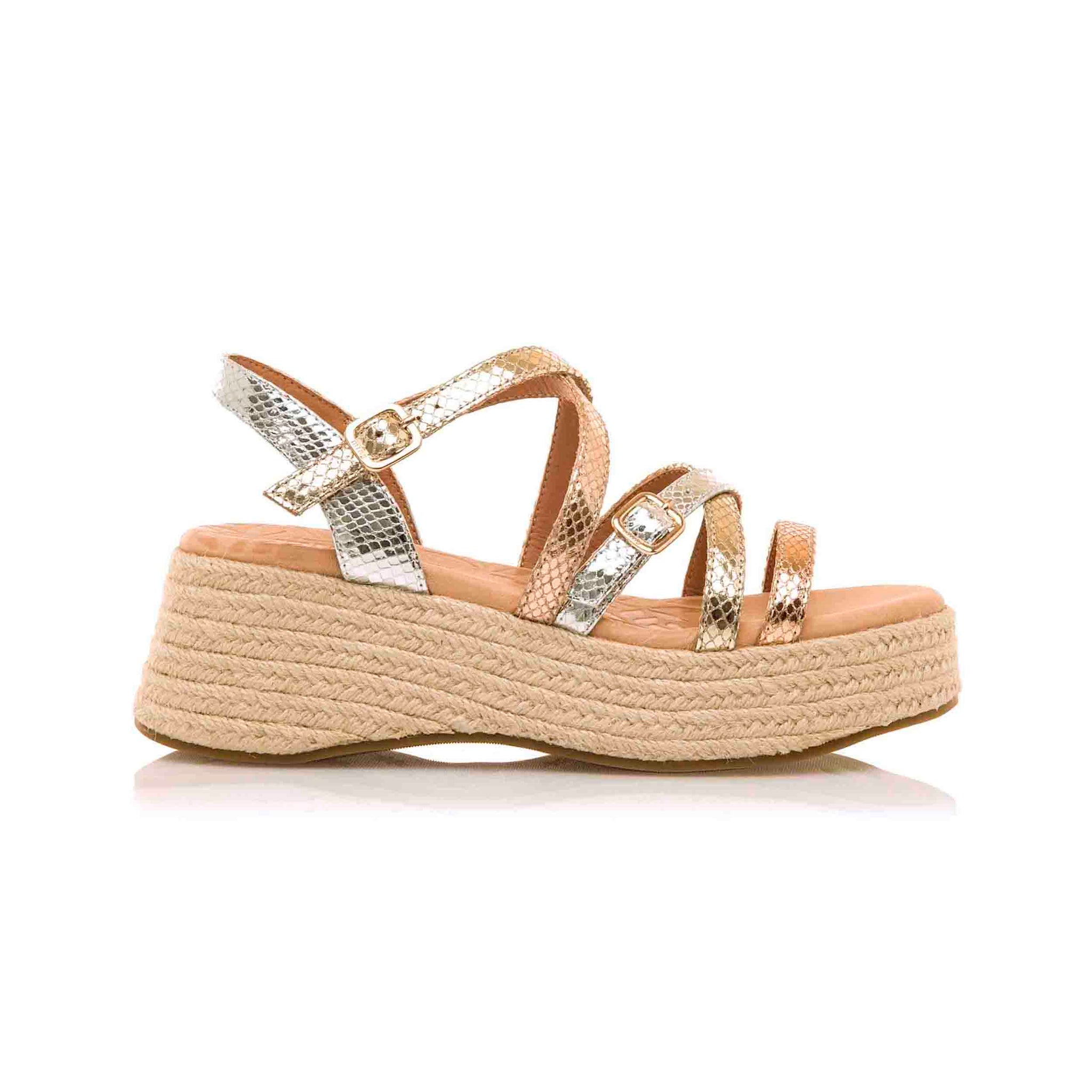 Estas sandalias son perfectas para complementar tus looks casuales o más sofisticados durante la temporada estival. Su diseño con plataforma de yute y el acabado en oro rosado las convierten en una opción atractiva y funcional para tu colección de calzado.