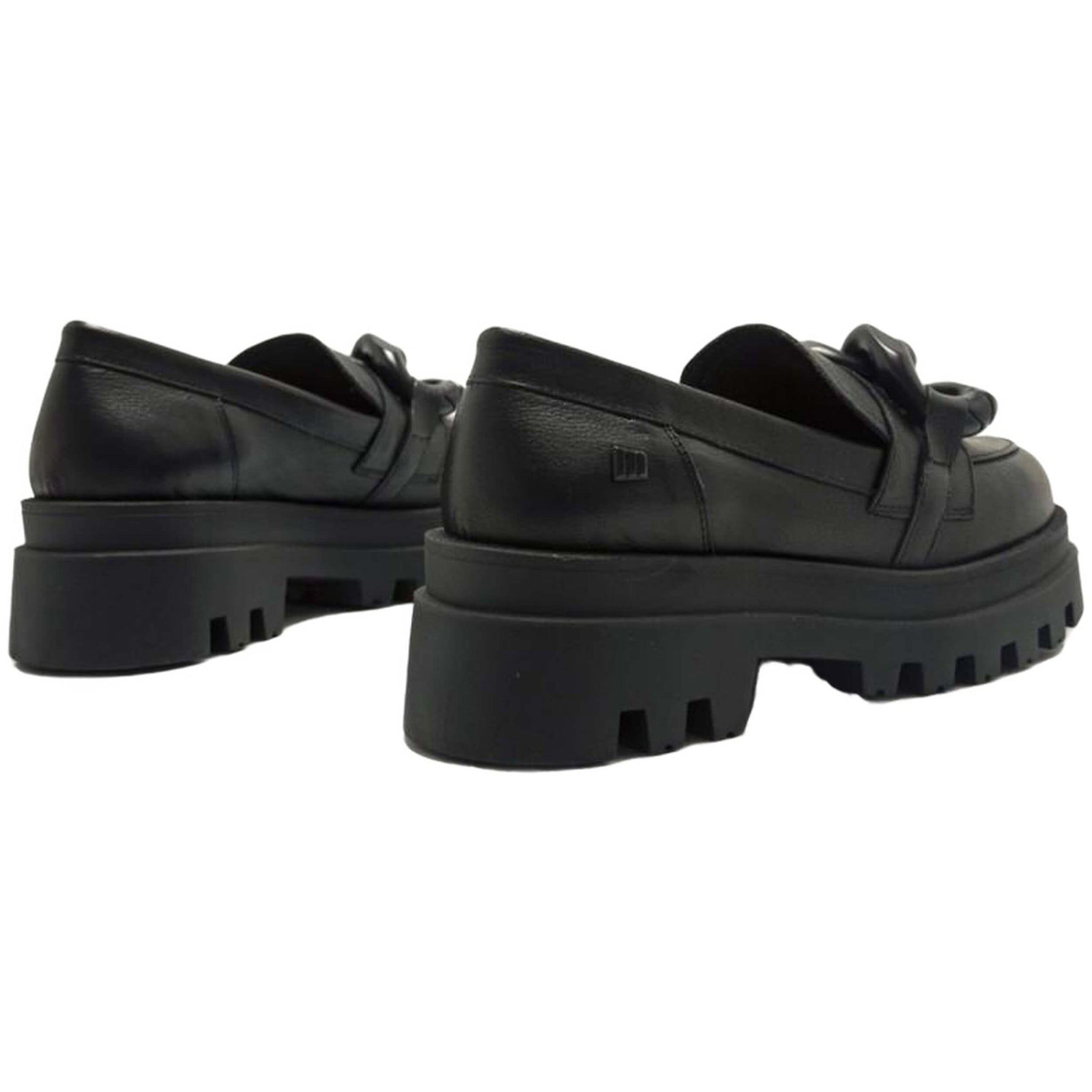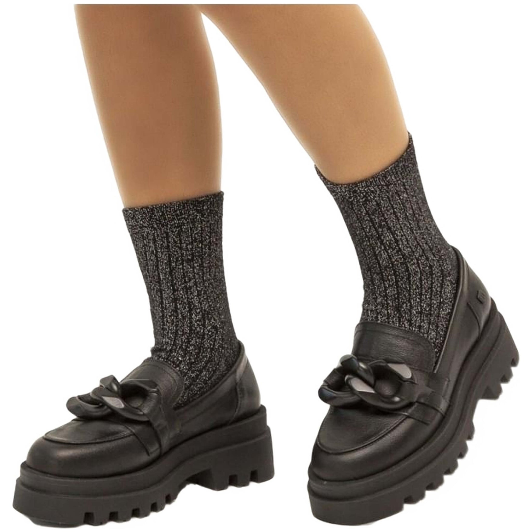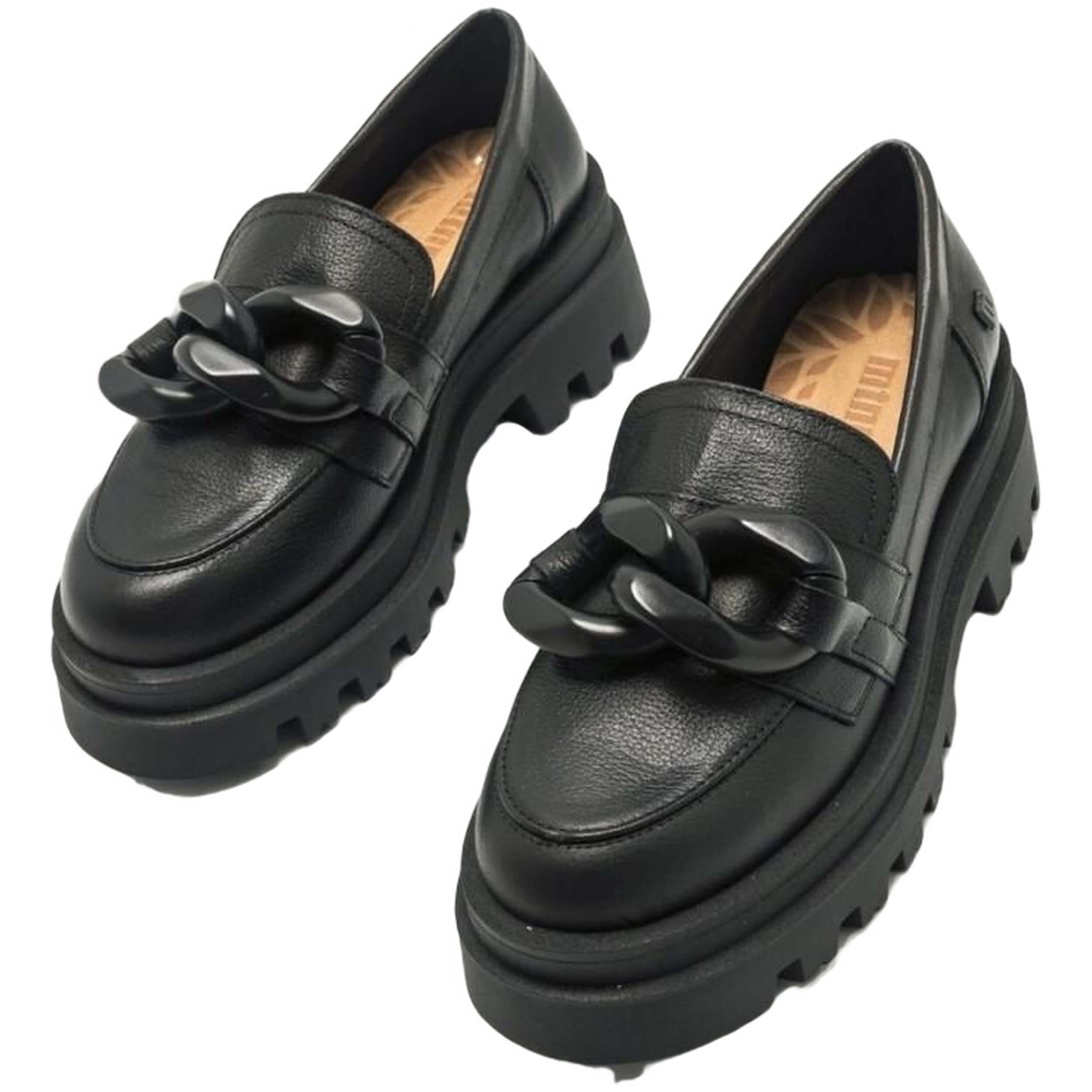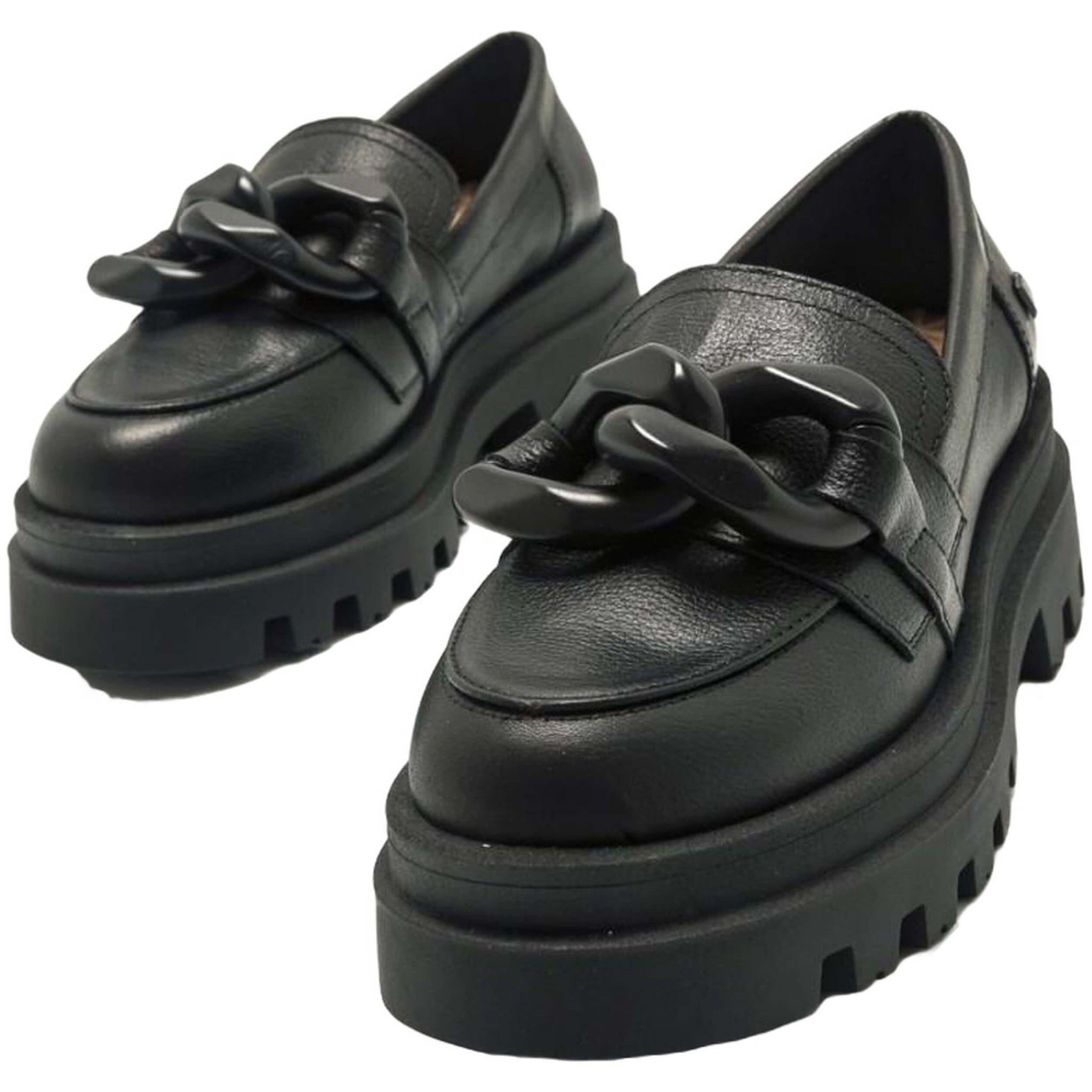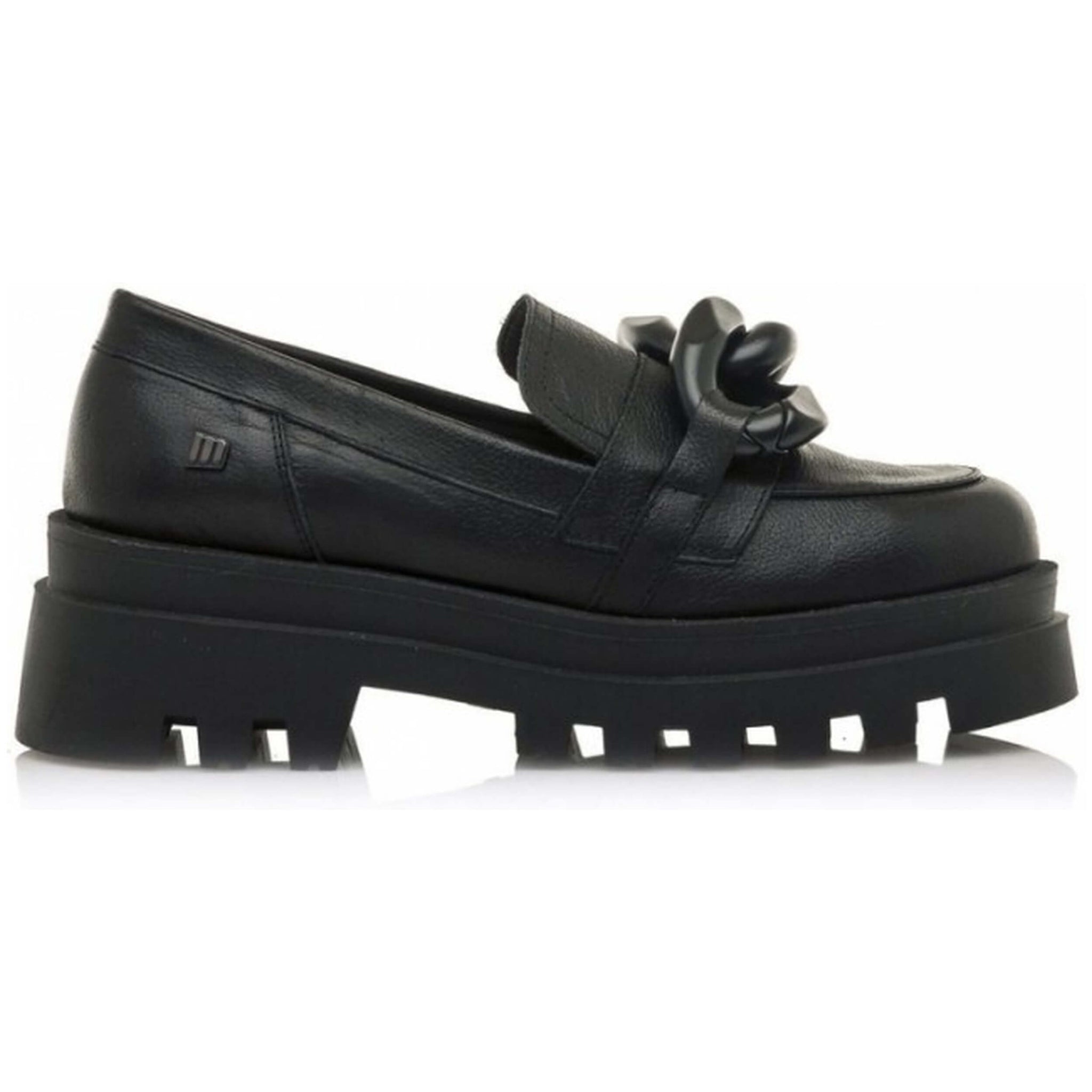 Mocasín de piel Mustang de estilo blucher de color negro con suela gruesa tipo track y detalle de eslabones metálica no te quedes sin la tendencia de la temporada. Te recomendamos que cojas una talla menos a la que lleves habitualmente. Fabricado en España.