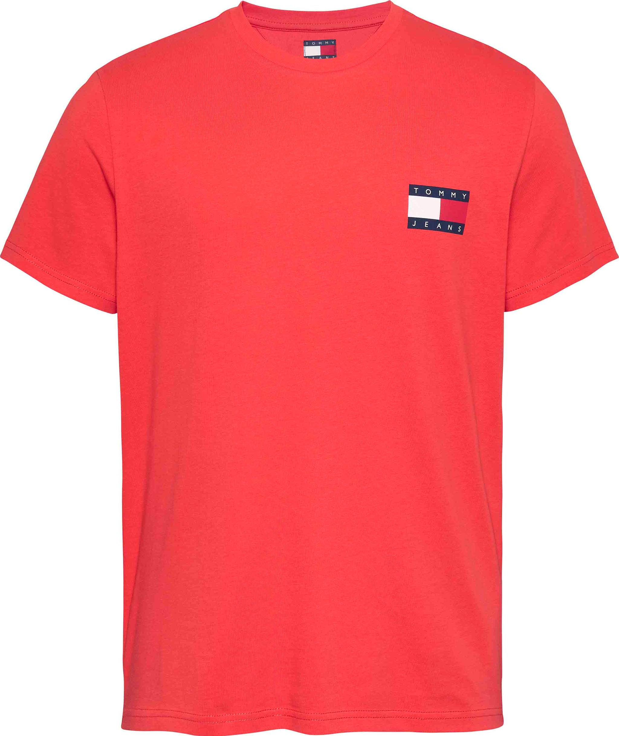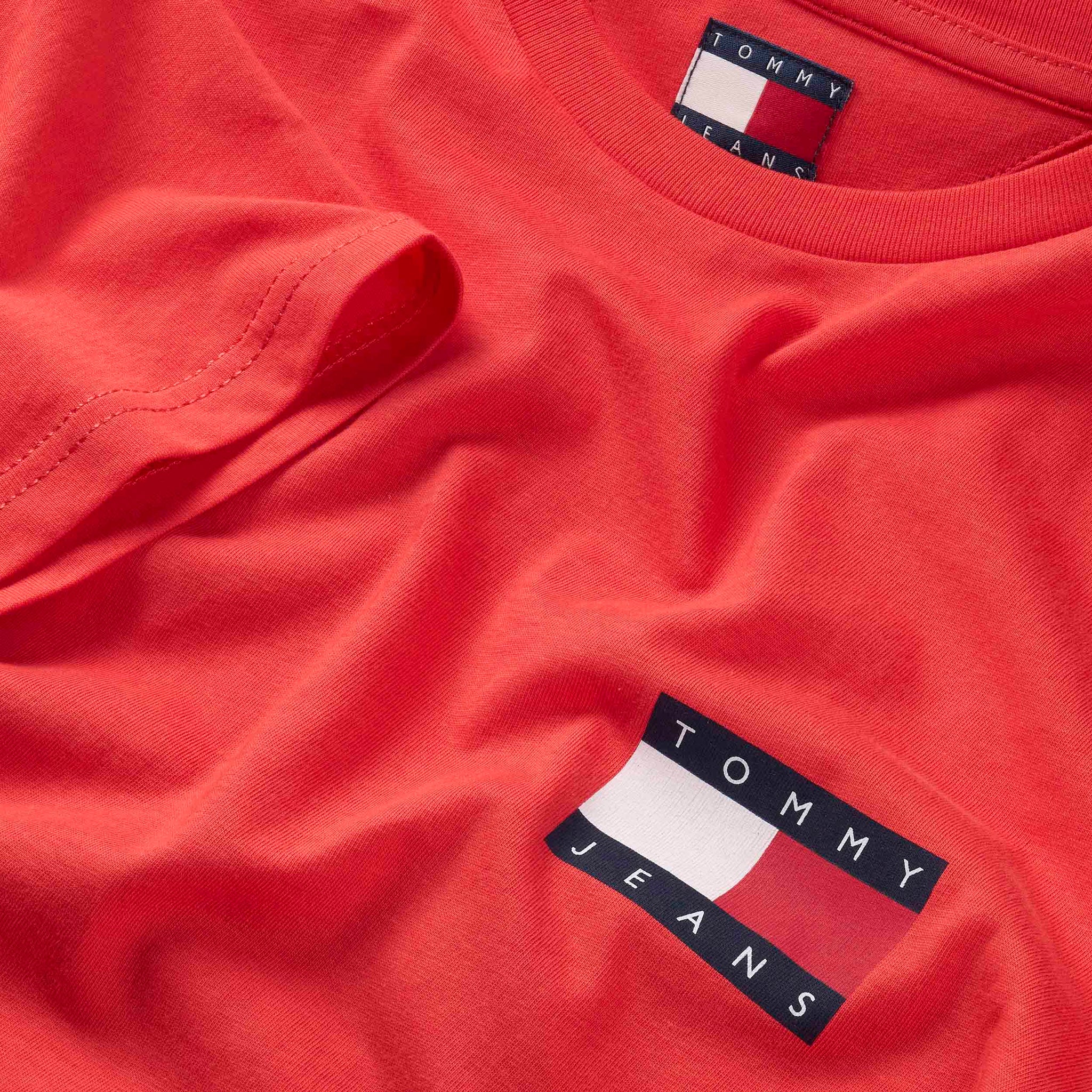 La camiseta Slim Essential Flag Tee de Tommy Jeans para hombre en color bright vermillion es la prenda perfecta para añadir un toque de color y estilo a tu colección. Confeccionada en 100% algodón puro, ofrece una sensación de suavidad y frescura que te mantendrá cómodo durante todo el día. Su corte slim ajustado proporciona una silueta estilizada, resaltando tu figura sin perder confort.