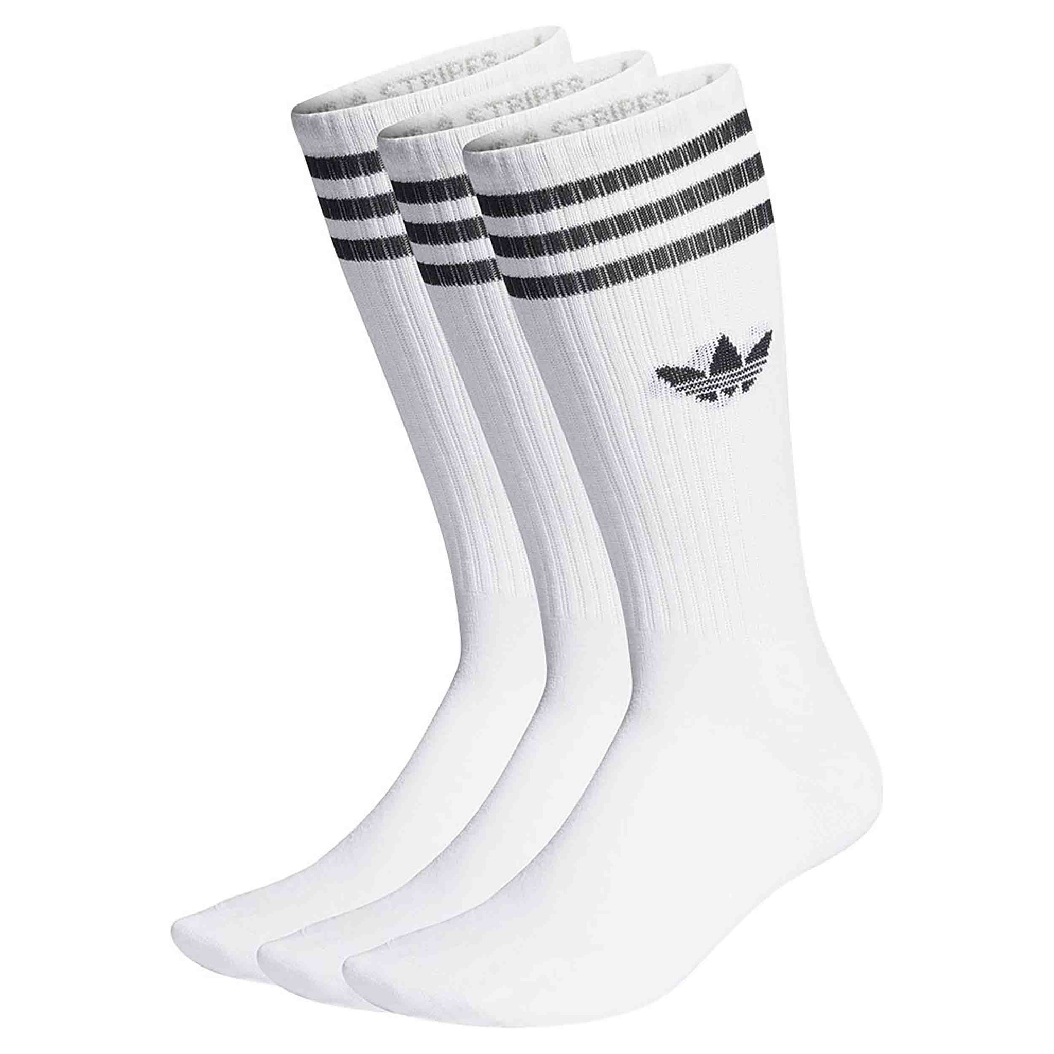 El diseño en color blanco destaca con las características franjas negras y el símbolo del trébol de Adidas, un detalle que añade el toque distintivo de la marca. Su estilo atemporal los convierte en un accesorio versátil, perfecto para complementar tus zapatillas favoritas o lucir con sandalias en tendencias más atrevidas.