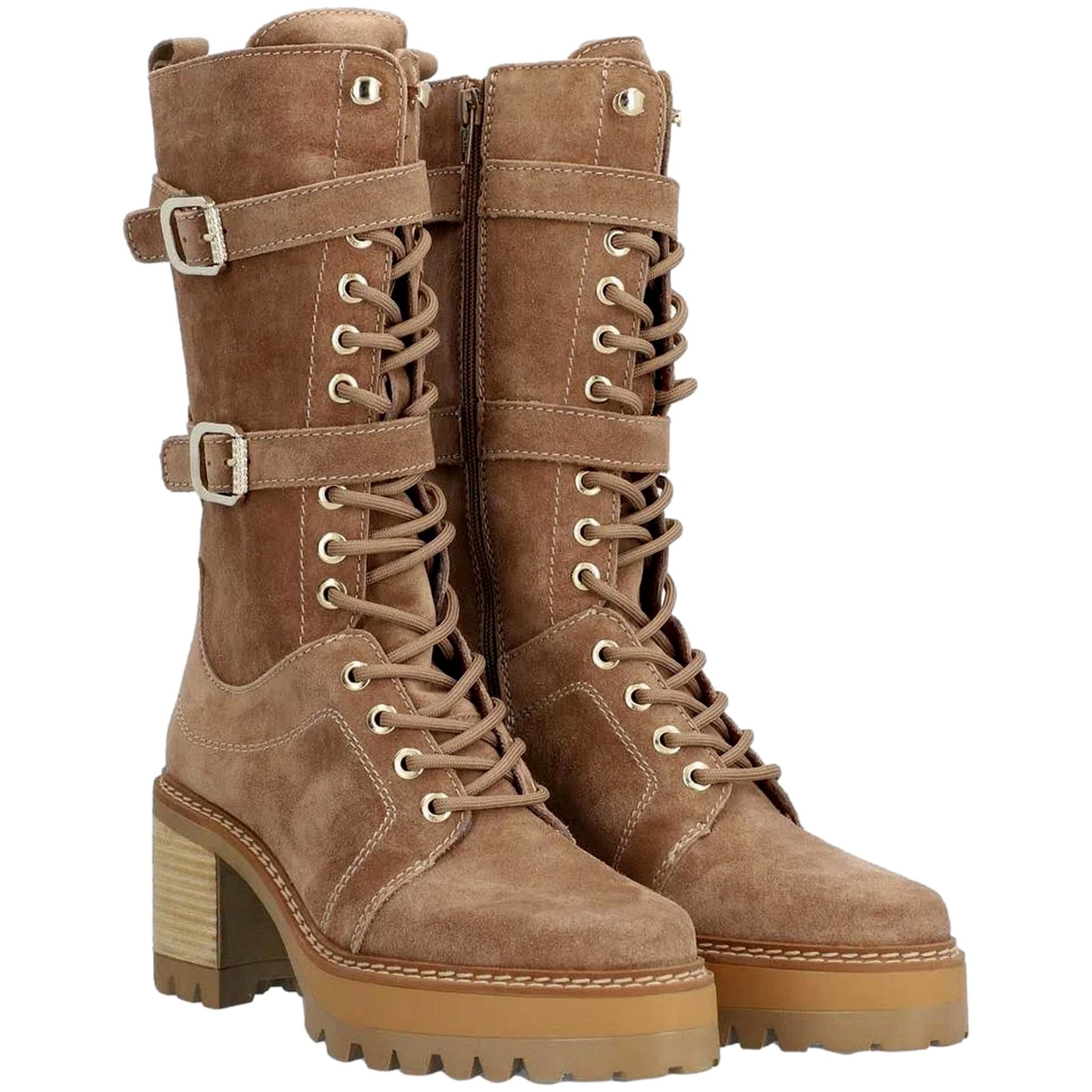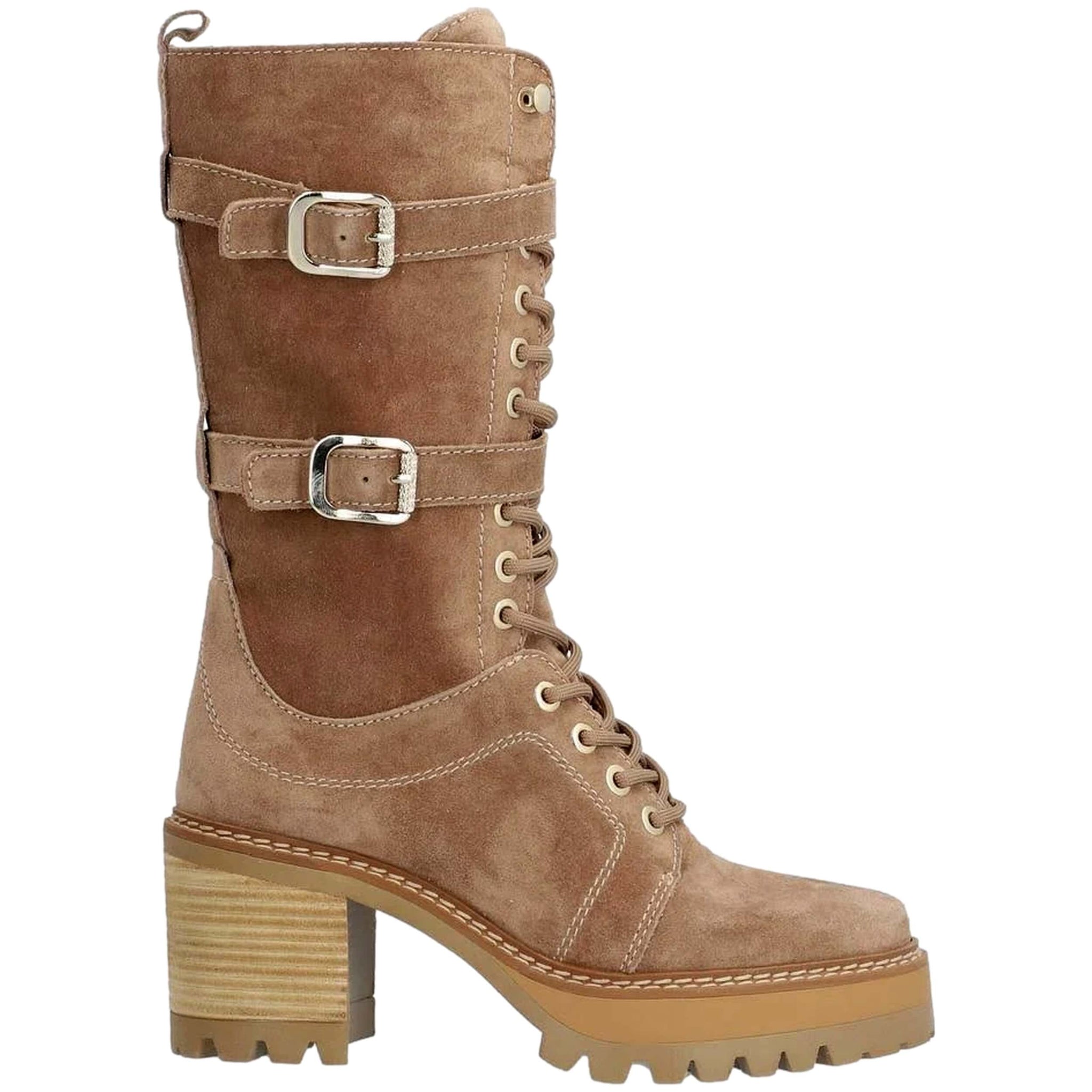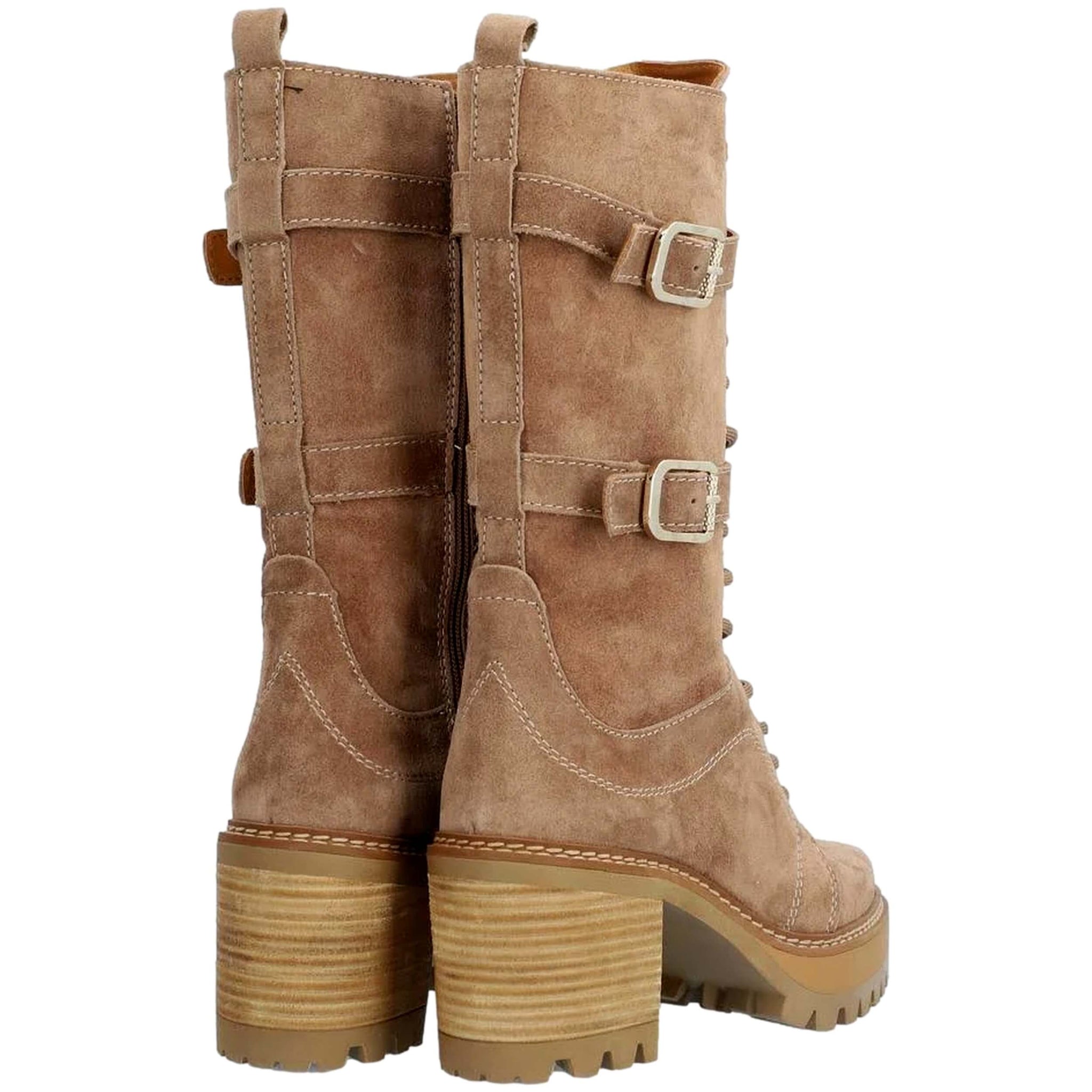 Bota para mujer ALPE NEW AMELIE, fabricada en piel (baby silk) de color marrón oscuro con tacón de 7 cm, suela antideslizante y puntera redonda, con cierre mediante cremallera y caña alta.