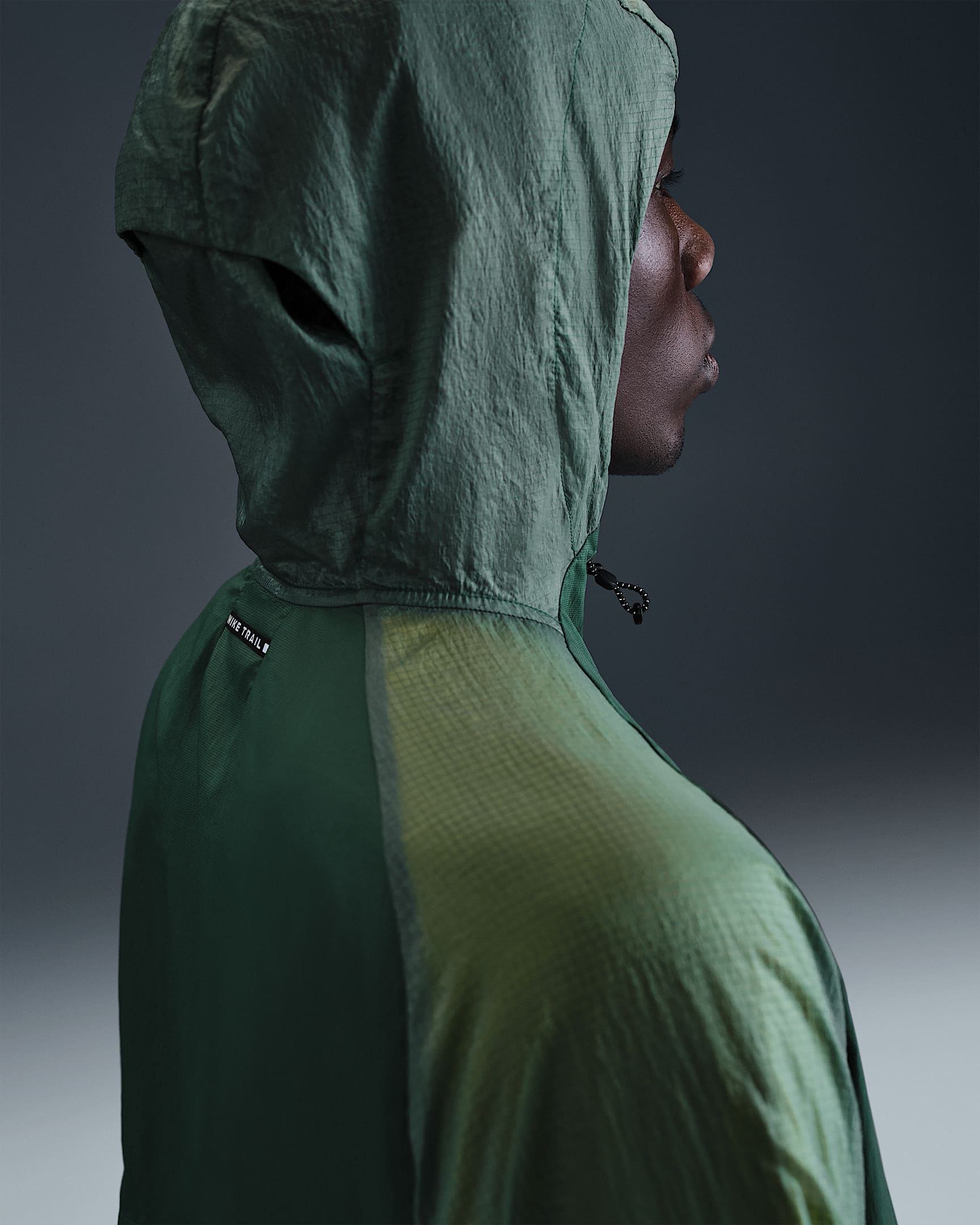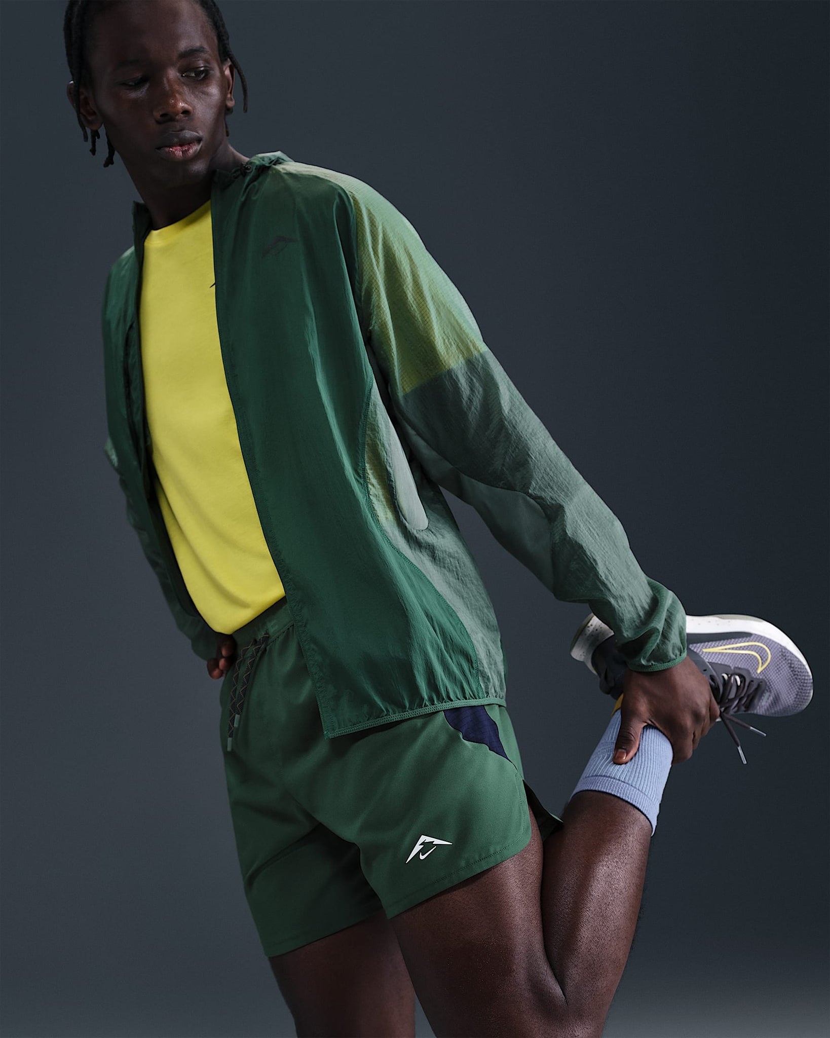 Chaqueta Nike Trail Aireez FN4002‑323 para hombre, diseñada para rendir al máximo en tus salidas de running por bosque o terrenos montañosos. Su tejido principal (83 % nylon, 17 % poliéster) es ligero, resistente y repele el agua gracias a acabados hidrófugos, mientras que los paneles en hombros y mangas añaden protección extra frente a la lluvia ligera.
