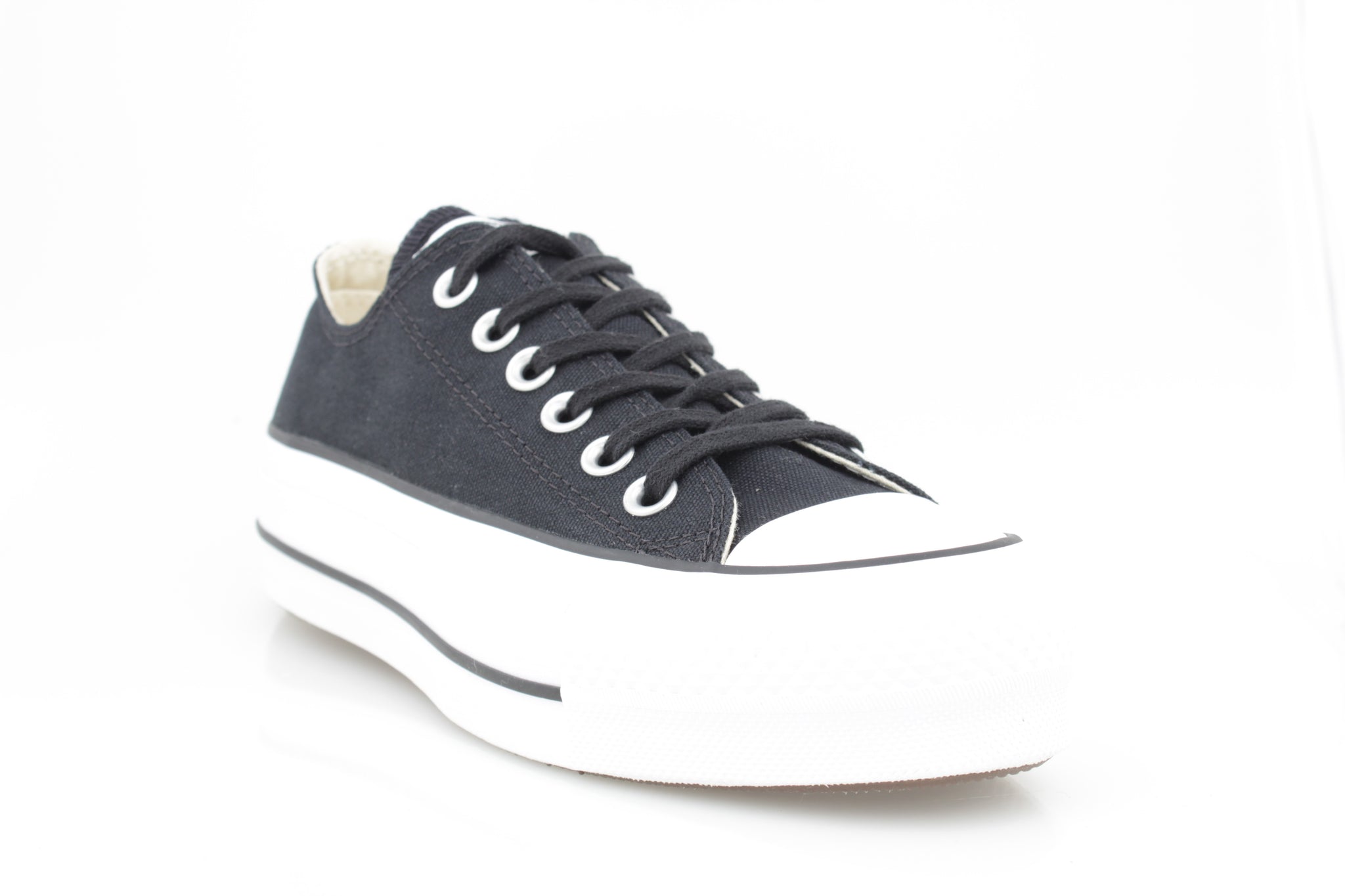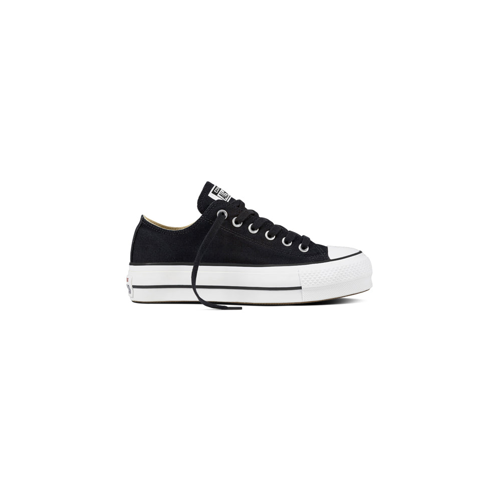 Zapatillas Converse de perfil alto diseñadas por Chuck Taylor. Esta zapatilla con el exterior fabricado en lona y plataforma, es la más característica de toda la colección de Converse esta vez en su versión mas vintage, inspirada en los modelos de los años 70. Color Negro con detalle en blanco.