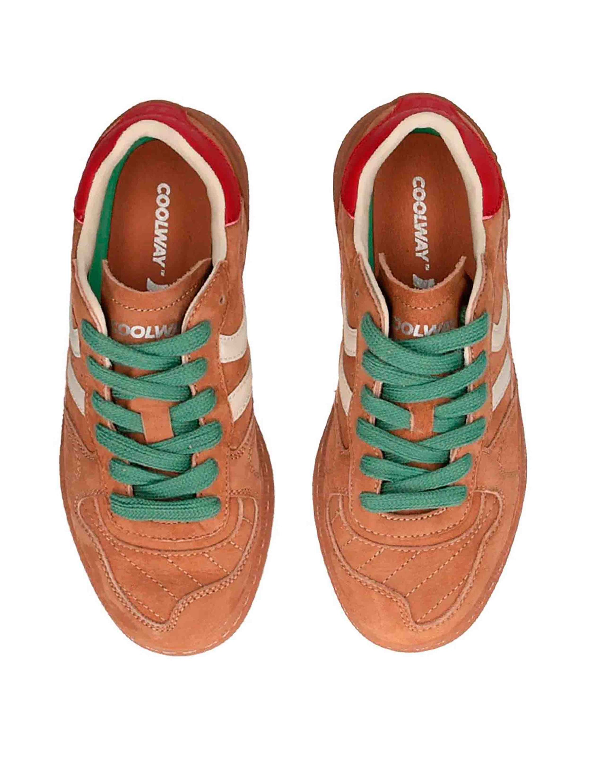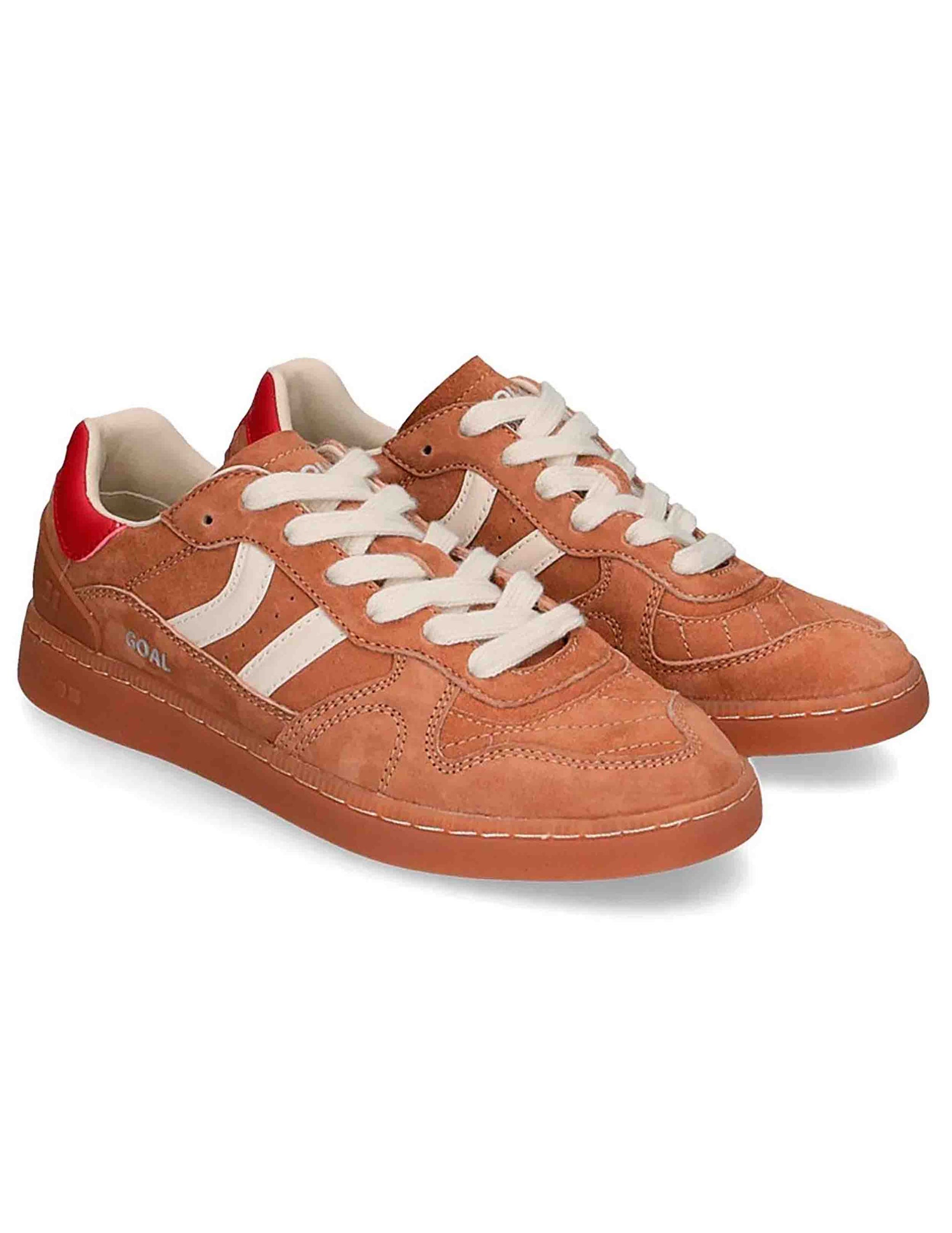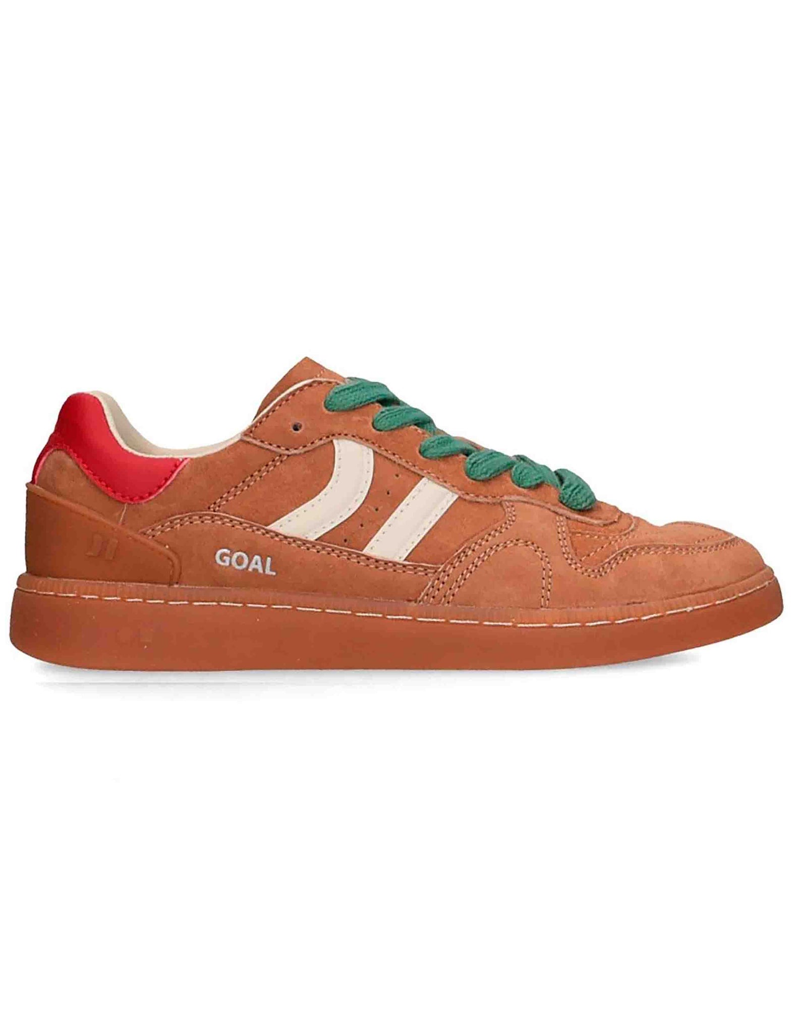Zapatilla deportiva de serraje con detalles en contraste de color. Lengüeta de piel y preformada con un acolchado figurado. Vistas del forro en piel. Cordones planos de algodón en dos tonos intercambiables. Cuello ligeramente acolchado. La parte delantera lleva un refuerzo de pespuntes. Suela flexible de goma/caucho que aporta durabilidad y agarre. Cuenta con el nombre del modelo “GOAL” en lateral en blanco.