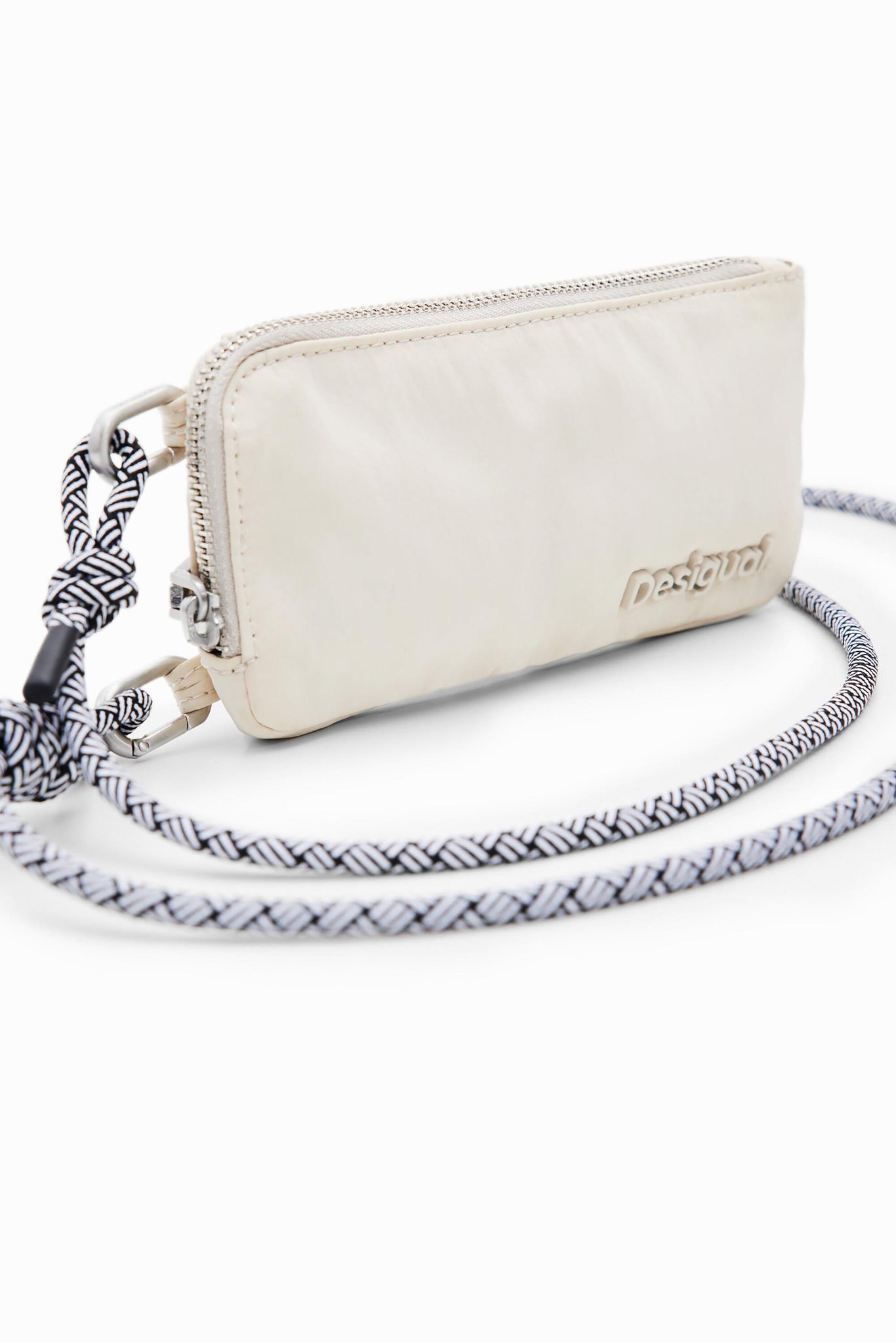 Cuatro asas: corta de mano, frontal para llevar como clutch, correa larga ajustable y cuerdas de quita y pon para usar como bandolera y portamóvil