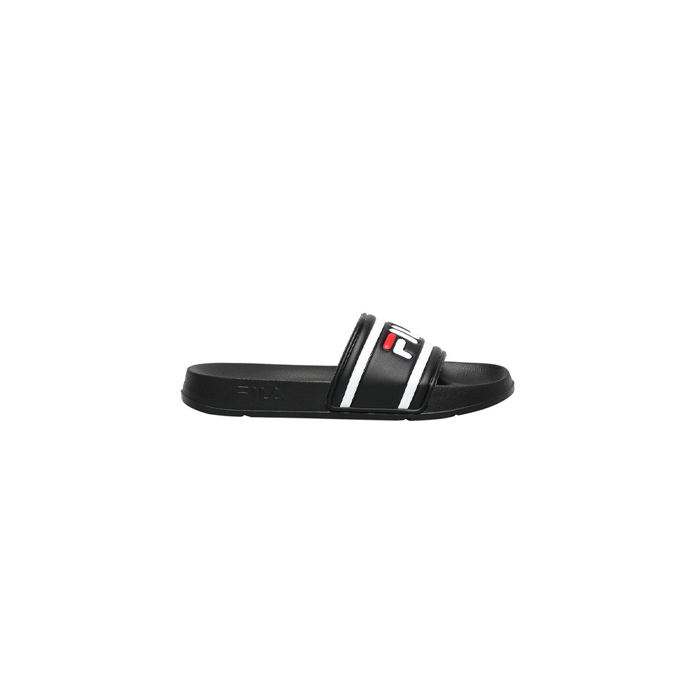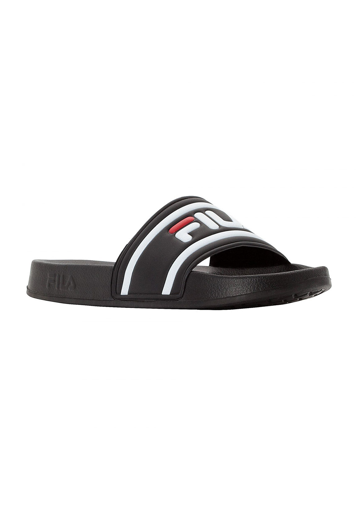 Chancla para mujer de Fila, hecha en piel sintética y mediasuela de goma, ideal para los días veraniegos estar lo más fresco posible. Color negro con logotipo en blanco y rojo.