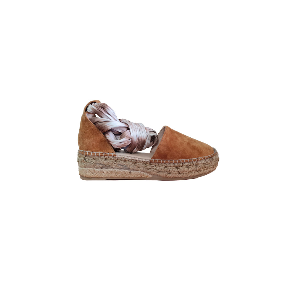 Alpargata de mujer Gaimo en piel. Modelo Bambú de corte y talón cerrado con cintas estampadas tye die anudadas al tobillo. Forro y plantillas acolchadas de piel con cuña de yute ecológico de 4,5 cm de altura y plataforma de 3,5 cm. Diseñadas y fabricadas artesanalmente en España, un modelo muy cómodo e ideal con el que conseguirás elevar y dar un toque de color a tus looks veraniegos.