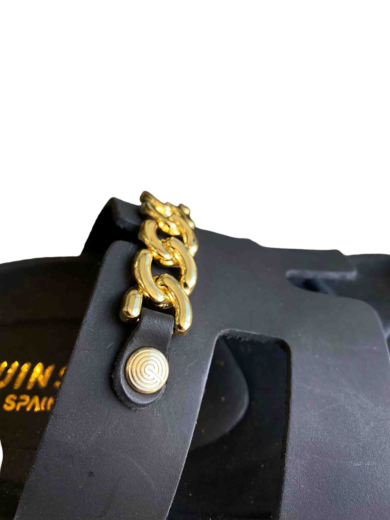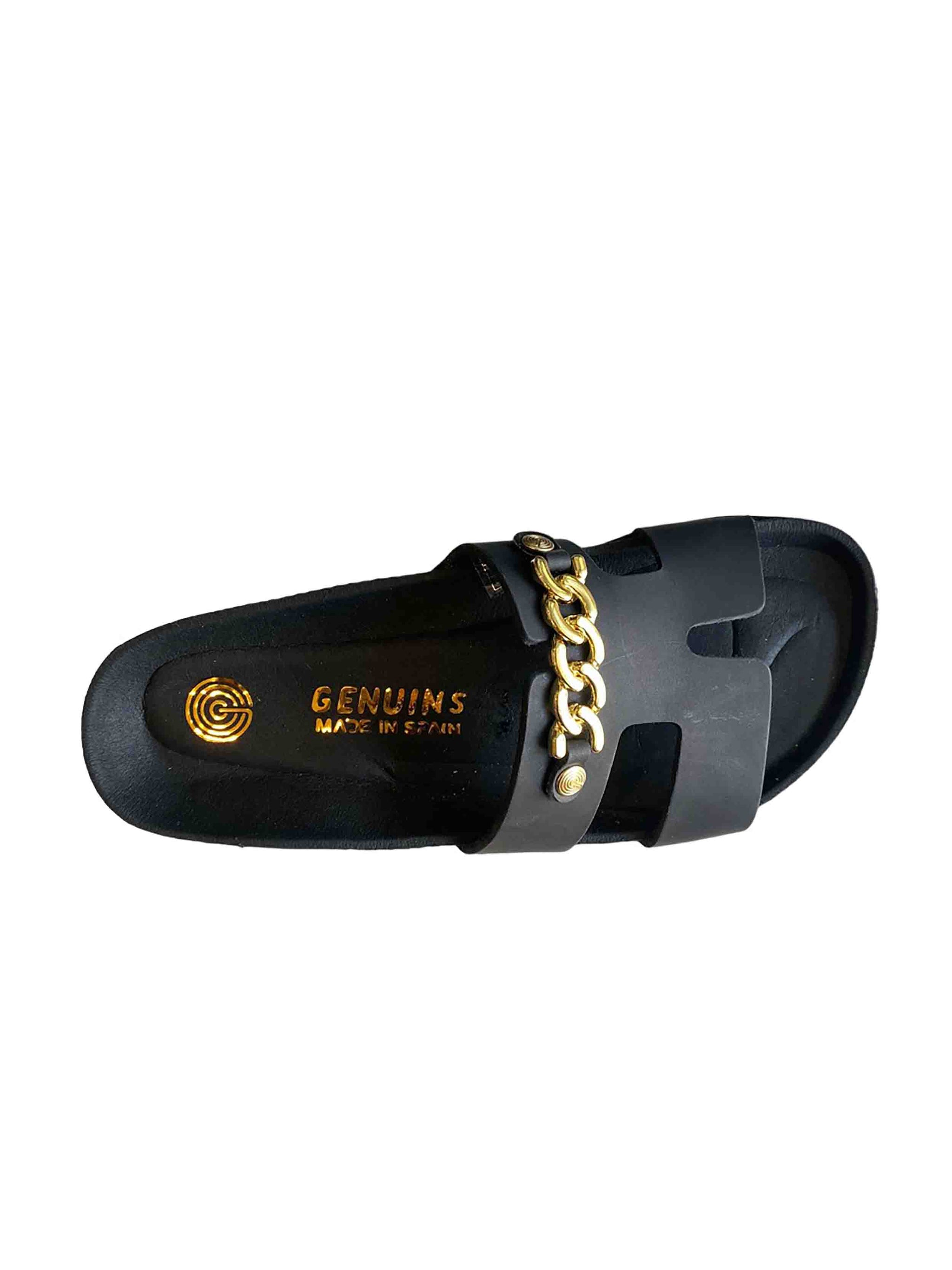 Esta sandalia plana Genuins Hilton Oiled está hecha de cuero negro certificado LWG con detalle de cadena dorada en la parte delantera. La suela anatómica de corcho y espuma ofrece un confort superior, mientras que el piso de EVA garantiza una caminata estable y segura. Un zapato de calidad y resistente para no volver a quitarse nunca más.