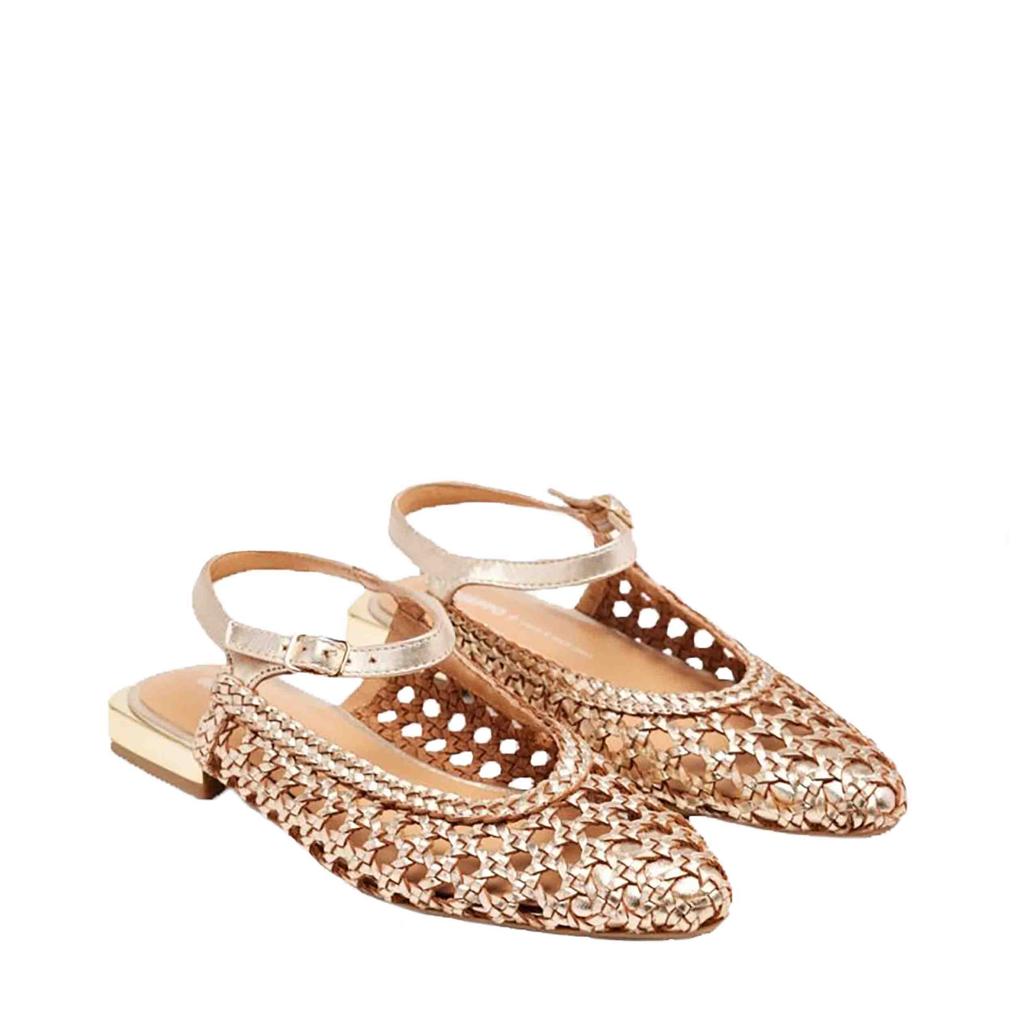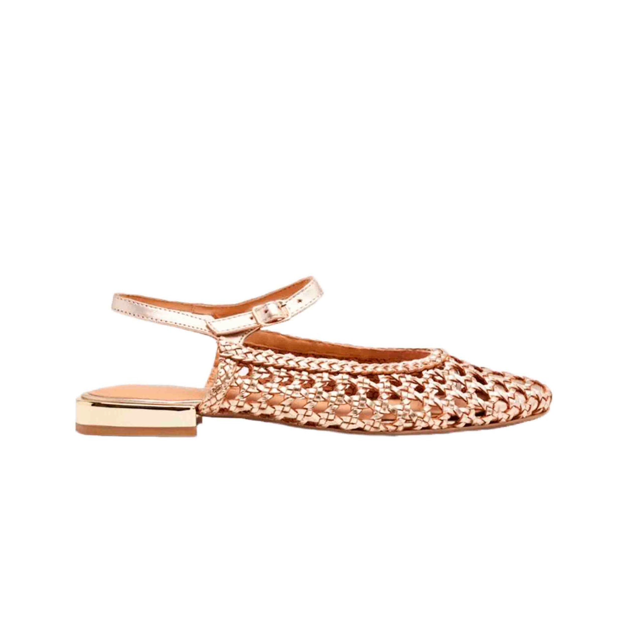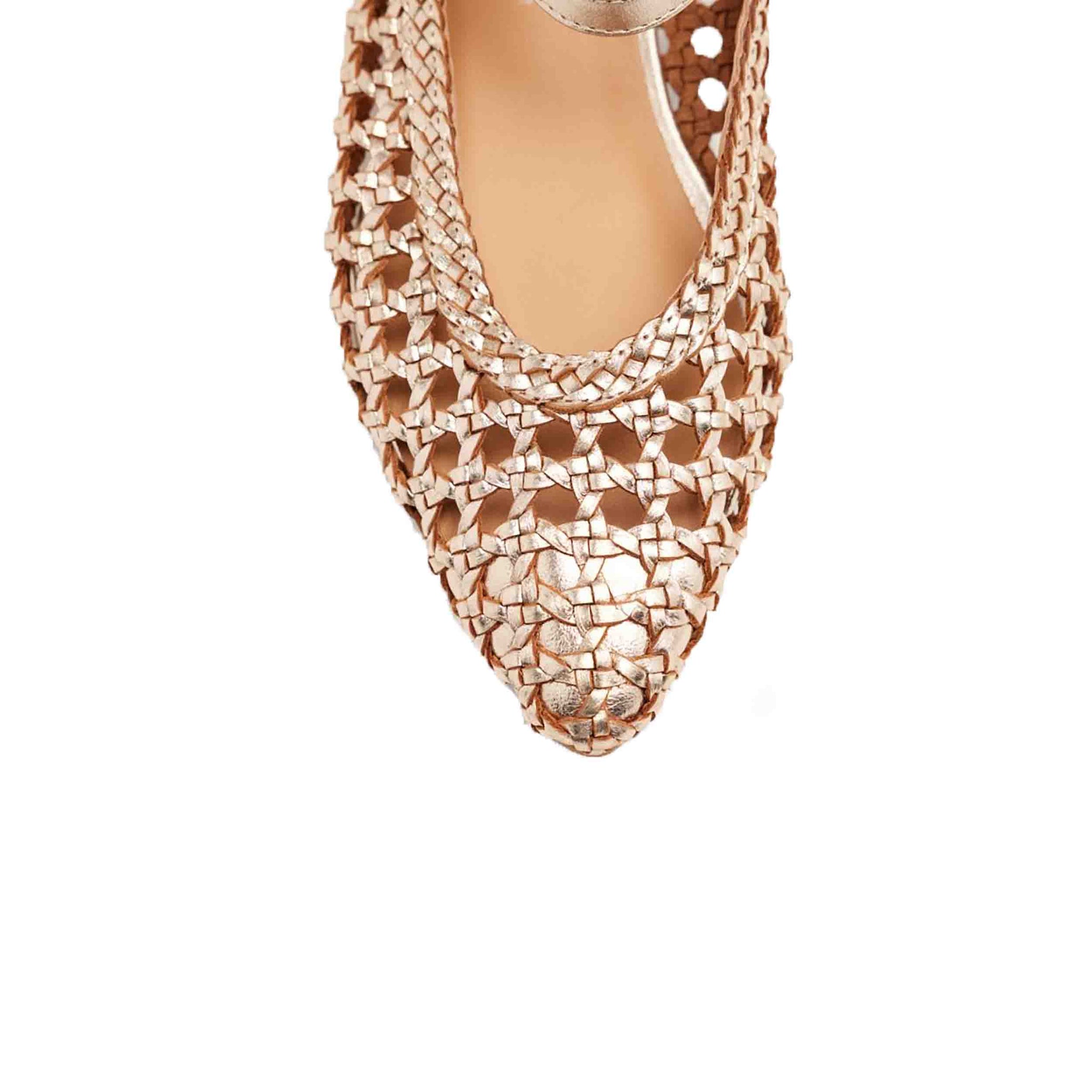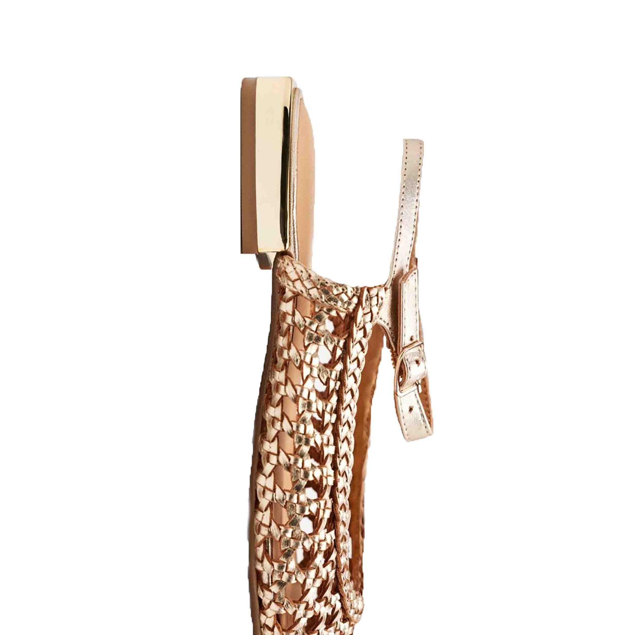 Estas sandalias están confeccionadas en piel de alta calidad con un acabado metalizado en tono platino, que aporta un toque de brillo y distinción a tu atuendo. El diseño de tiras trenzadas en la parte delantera añade un detalle artesanal y elegante, mientras que la punta afilada estiliza visualmente el pie. El cierre de hebilla ajustable en el tobillo garantiza una sujeción segura y personalizada, adaptándose a la forma de tu pie para mayor comodidad.