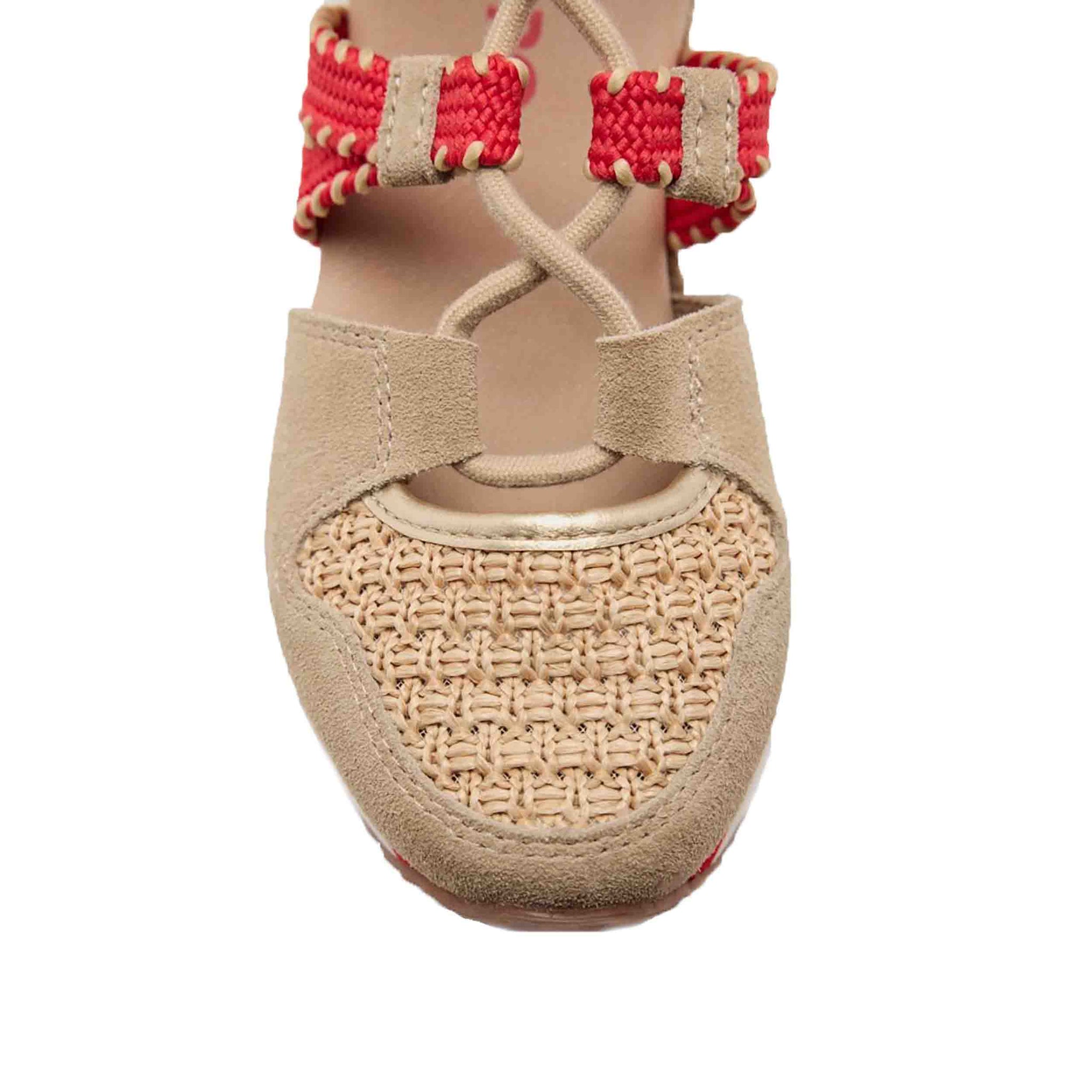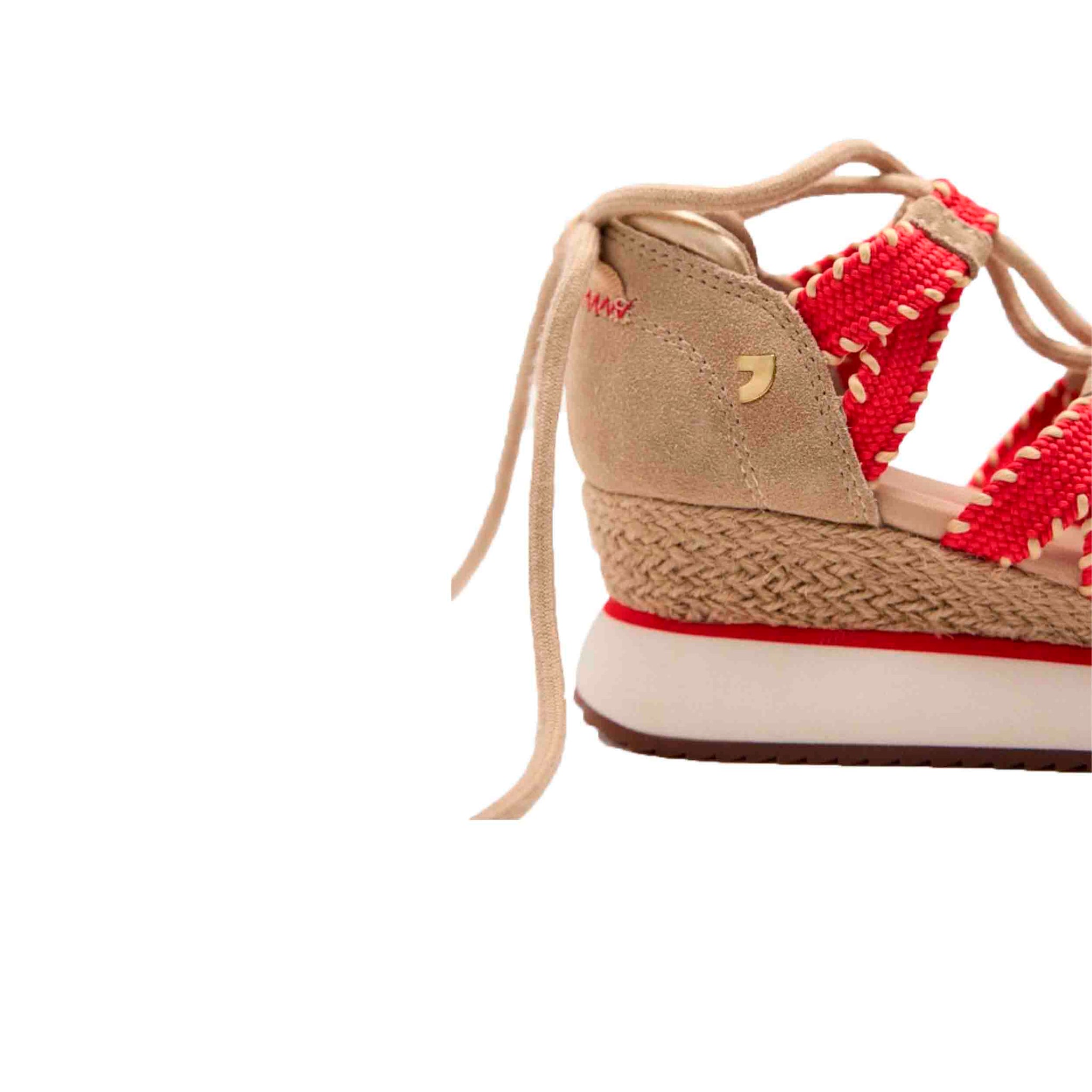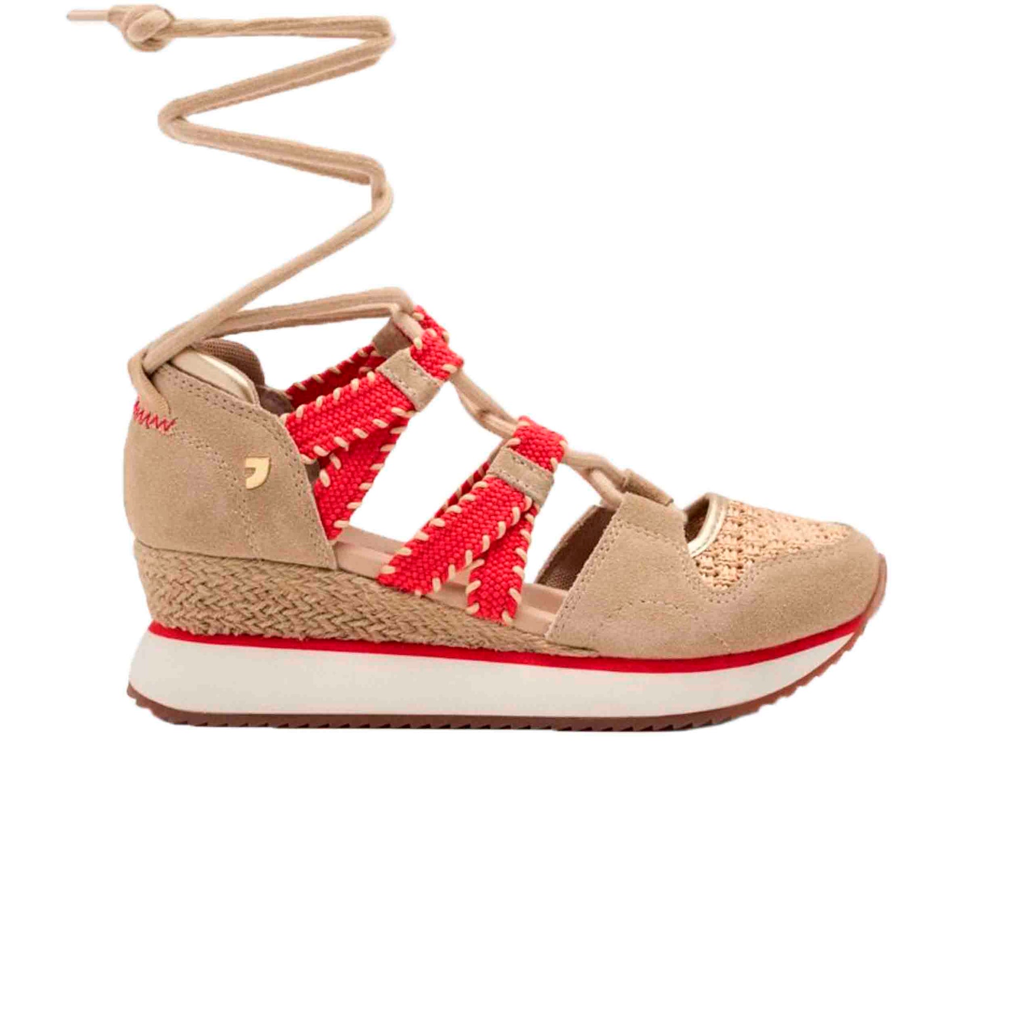 El corte superior de las sandalias Griswold está elaborado en piel de serraje de alta calidad, lo que garantiza durabilidad y resistencia. Los detalles en rafia tejida y los toques de naranja en el textil aportan un contraste atractivo y fresco al diseño. El cierre mediante tiras ajustables permite atar las sandalias alrededor de la pierna, asegurando una sujeción óptima y un ajuste personalizado.