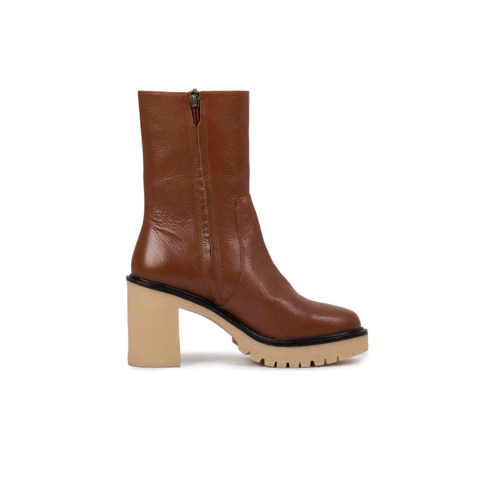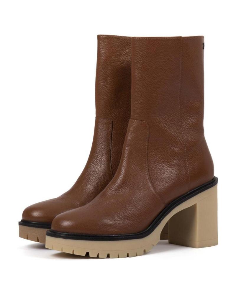 La tendencia must de la temporada ya disponible en la colección Otoño Invierno 2022 de Gioseppo Woman. ¡Hazte ya con ella! Bota lisa de piel color cuero con piso track y tacón ancho efecto crepé. Planta y vista de forro en piel LWG, muy acolchada con planta de látex. Forro en poliéster reciclado. Planta hecha con fibras naturales. Piso de caucho TPR.