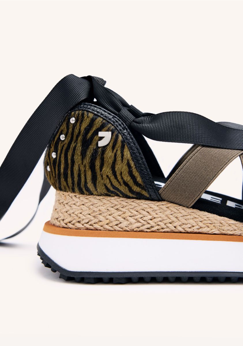 El exterior de la zapatilla está confeccionado en materiales sintéticos que imitan el serraje, ofreciendo una apariencia de alta calidad. La cuña de yute, forrada en contraste, no solo añade altura, sino que también mantiene la ligereza y comodidad necesarias para el uso diario. La plantilla y el forro están fabricados con nylon reciclado, promoviendo la sostenibilidad sin comprometer el confort.
