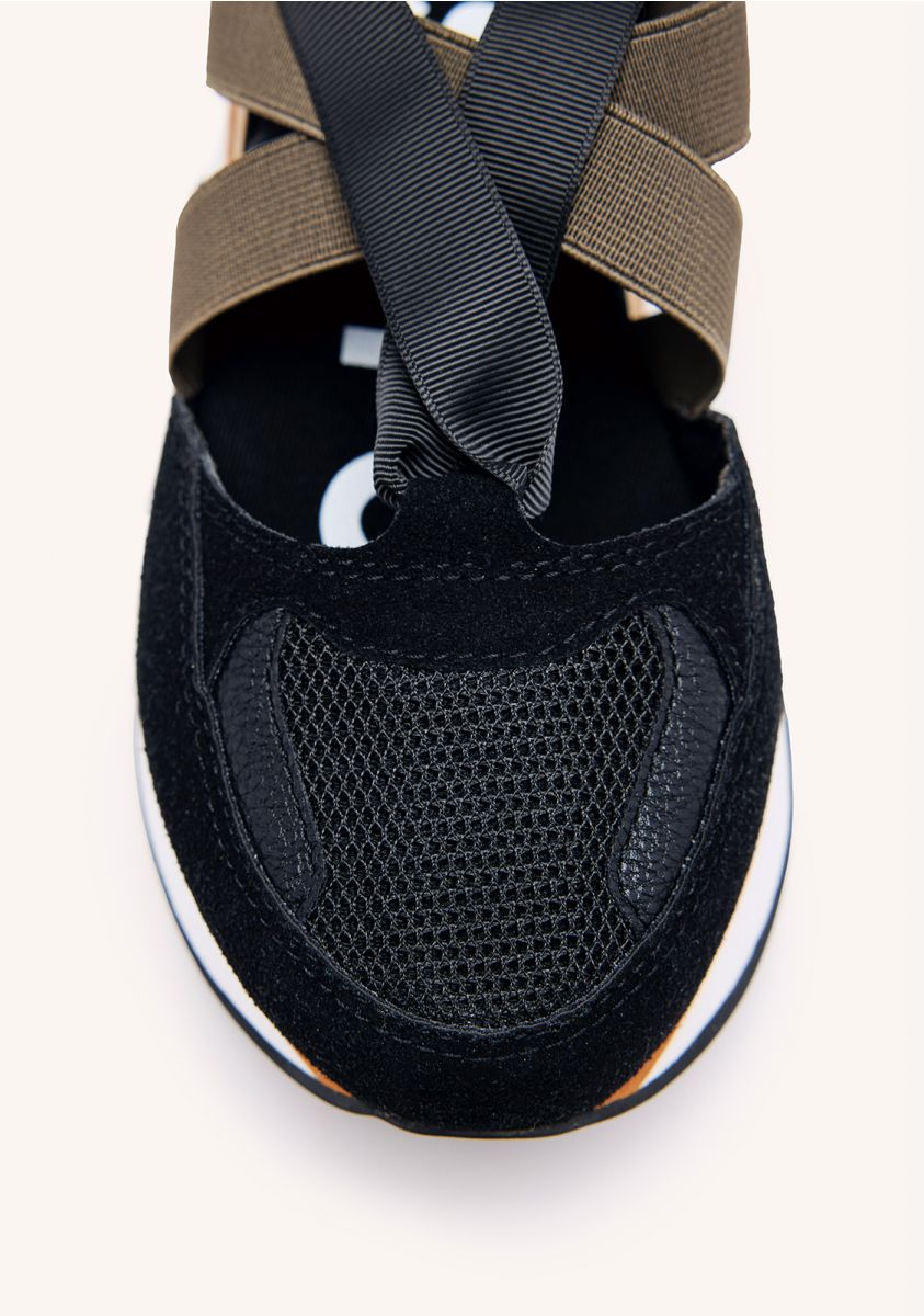 El diseño semiabierto con aperturas laterales y las cintas elásticas entrelazadas proporcionan un ajuste seguro y estilizado, mientras que las pequeñas tachuelas decorativas en el lateral añaden un detalle distintivo. La suela de goma, con relieves antideslizantes, garantiza tracción y estabilidad en diversas superficies.
