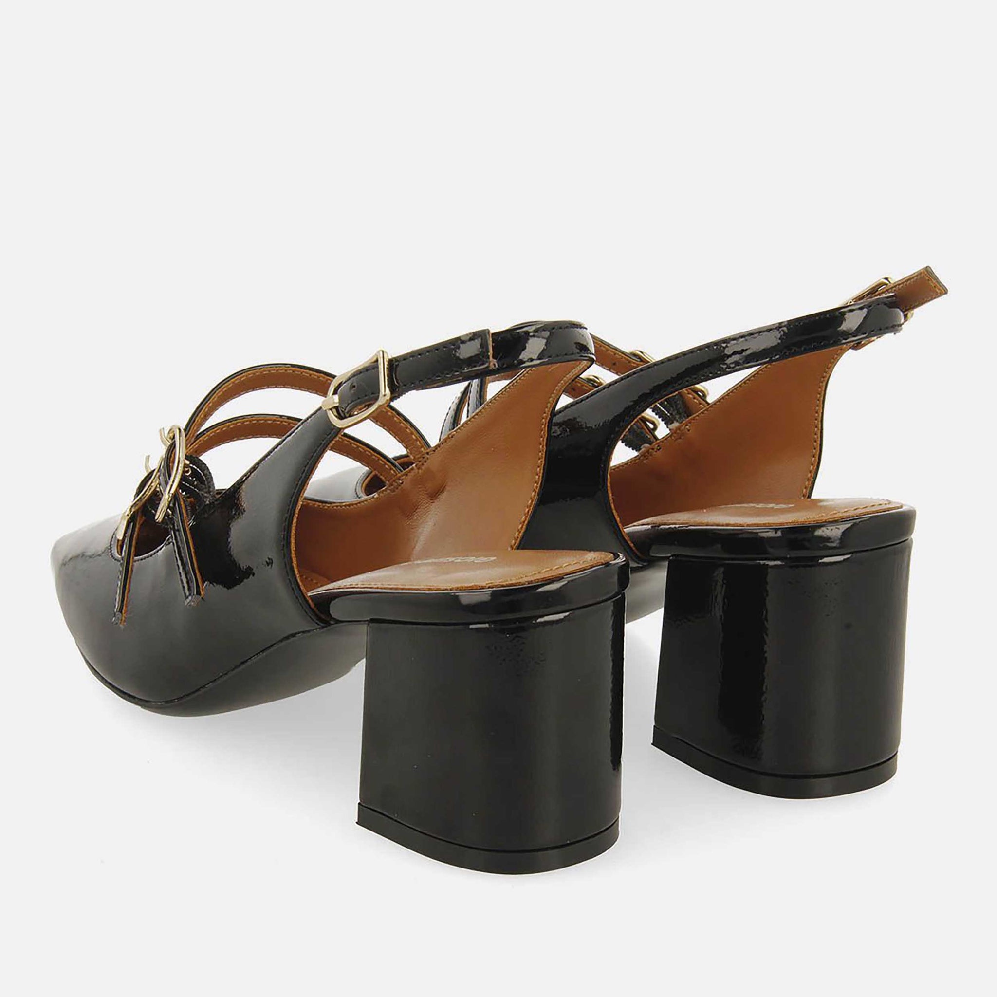 El color negro con acabado brillante lo convierte en un modelo versátil que puedes combinar con vestidos midi, faldas, pantalones de pinzas o incluso unos jeans rectos, logrando un look femenino y contemporáneo.