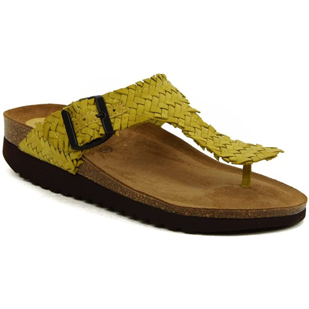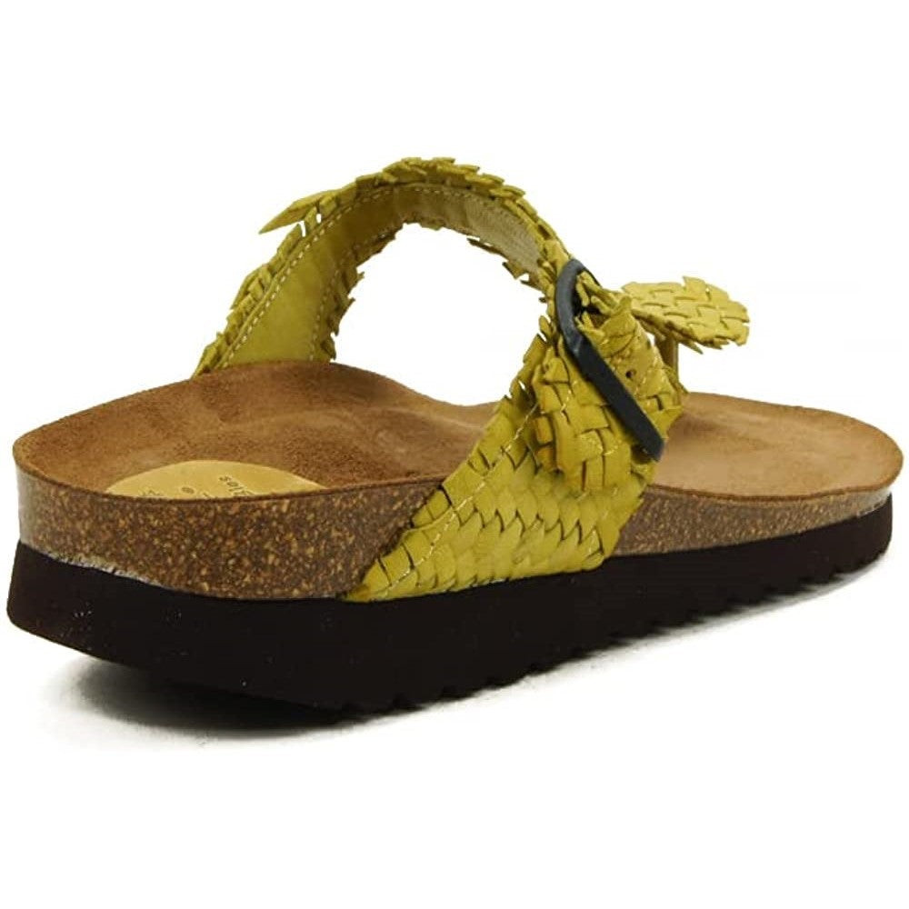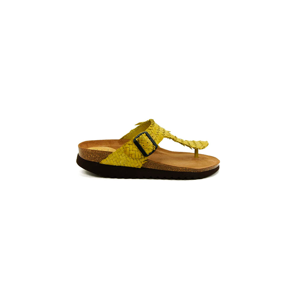 Sandalias para mujer de Inter-Bios, hechas en materiales veganos ayudando al medio ambiente, ajuste de hebilla, diseño trenzado, mediasuela de goma con cuña, ideales para el día a día por su comodidad. Color amarillo.
