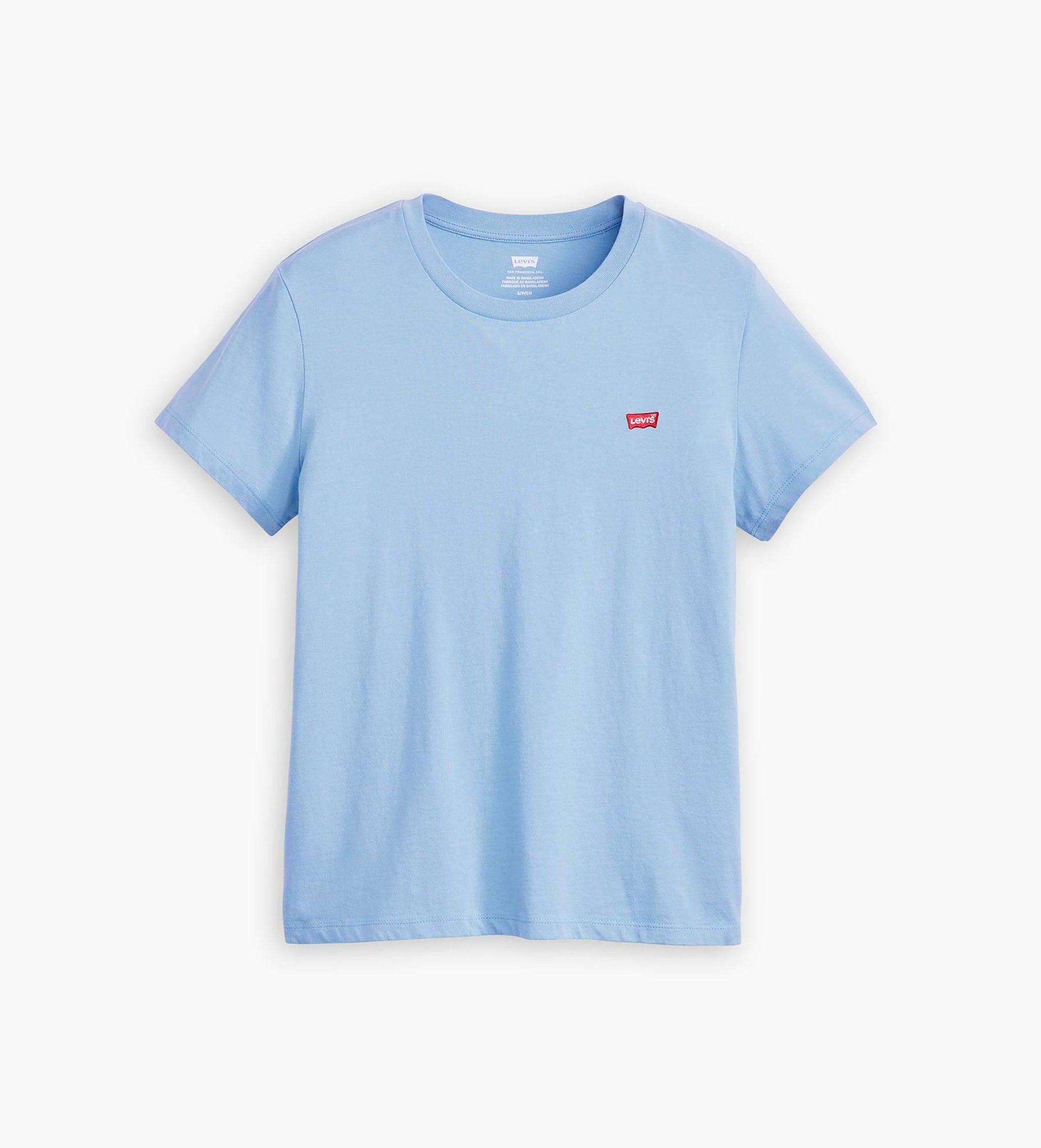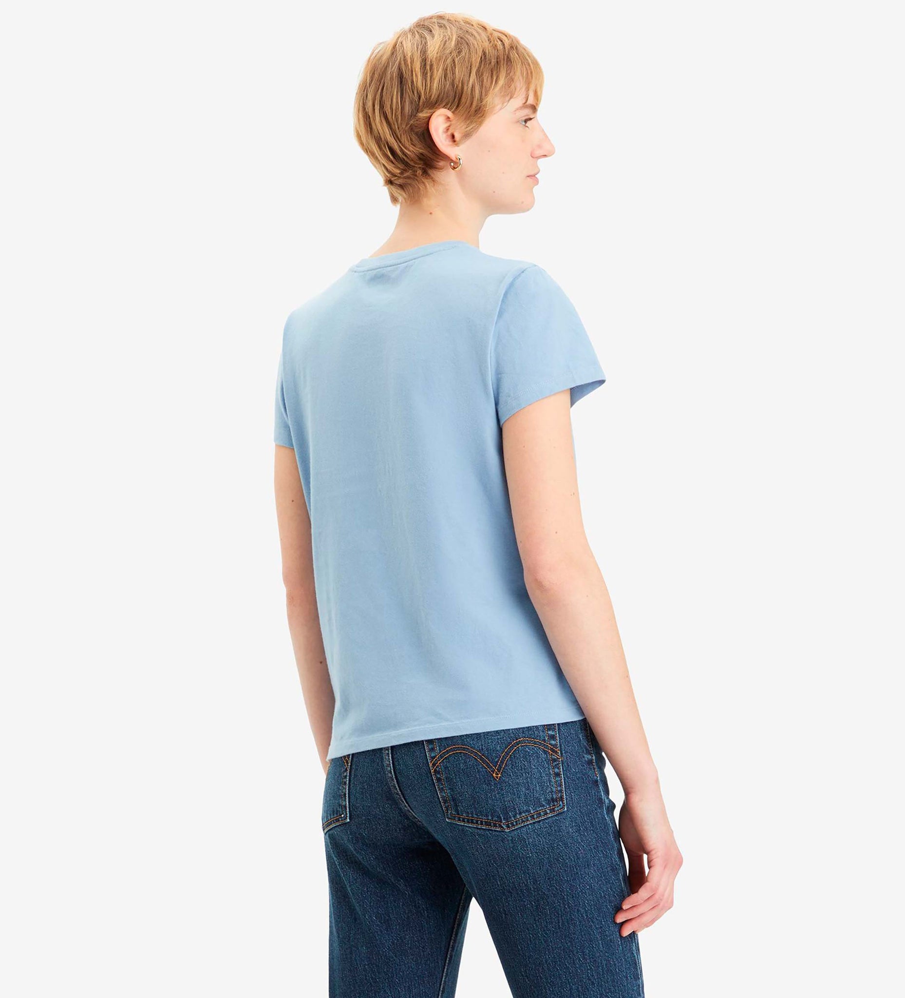 Camiseta Levi´s Line 8 Perfect para mujer con el logo pequeño en pecho de ala de murciélago "batwing" de Levi s®. que simula el diseño de la costura curvada cosida en los bolsillos posteriores de los vaqueros de Levi s®. Color Azul Claro.