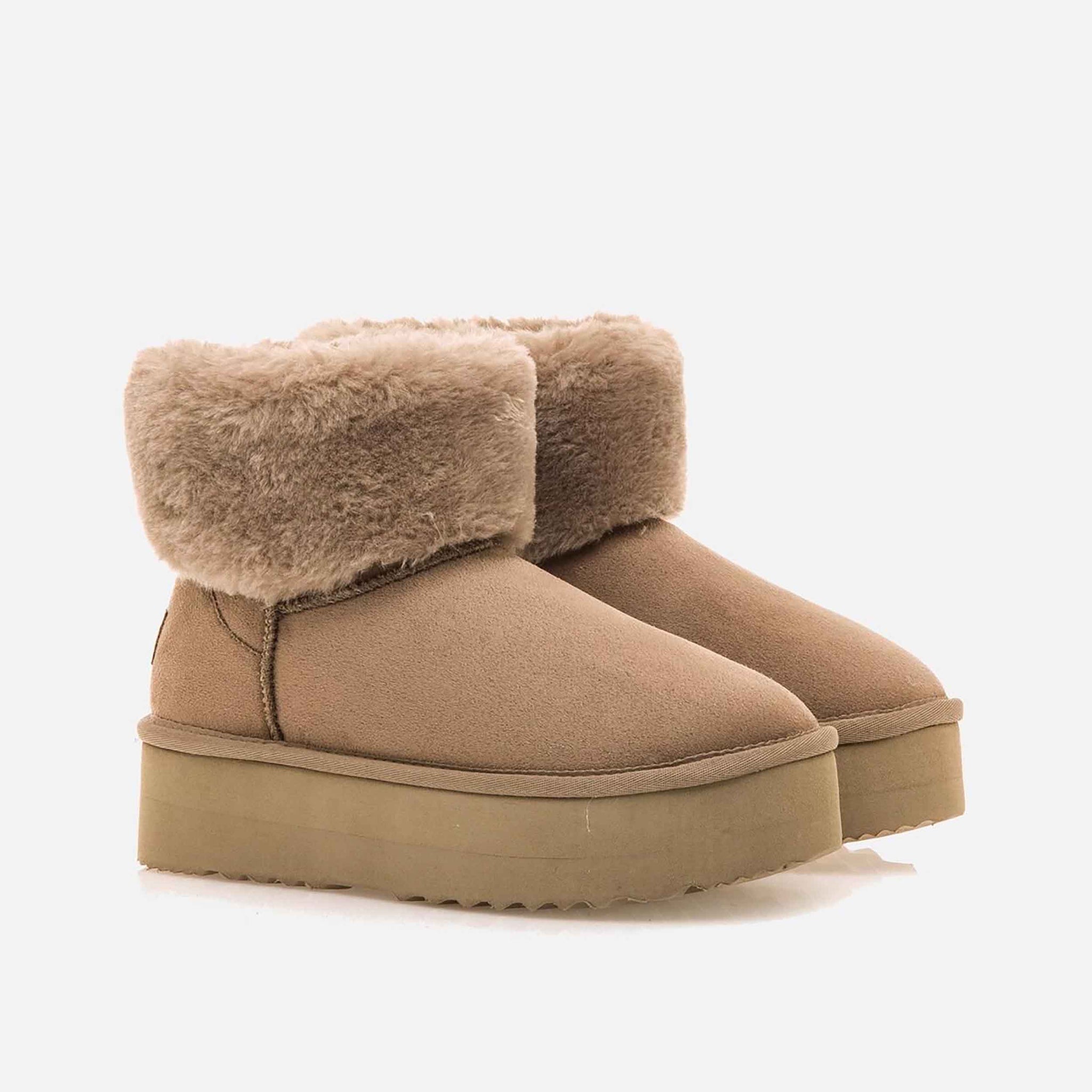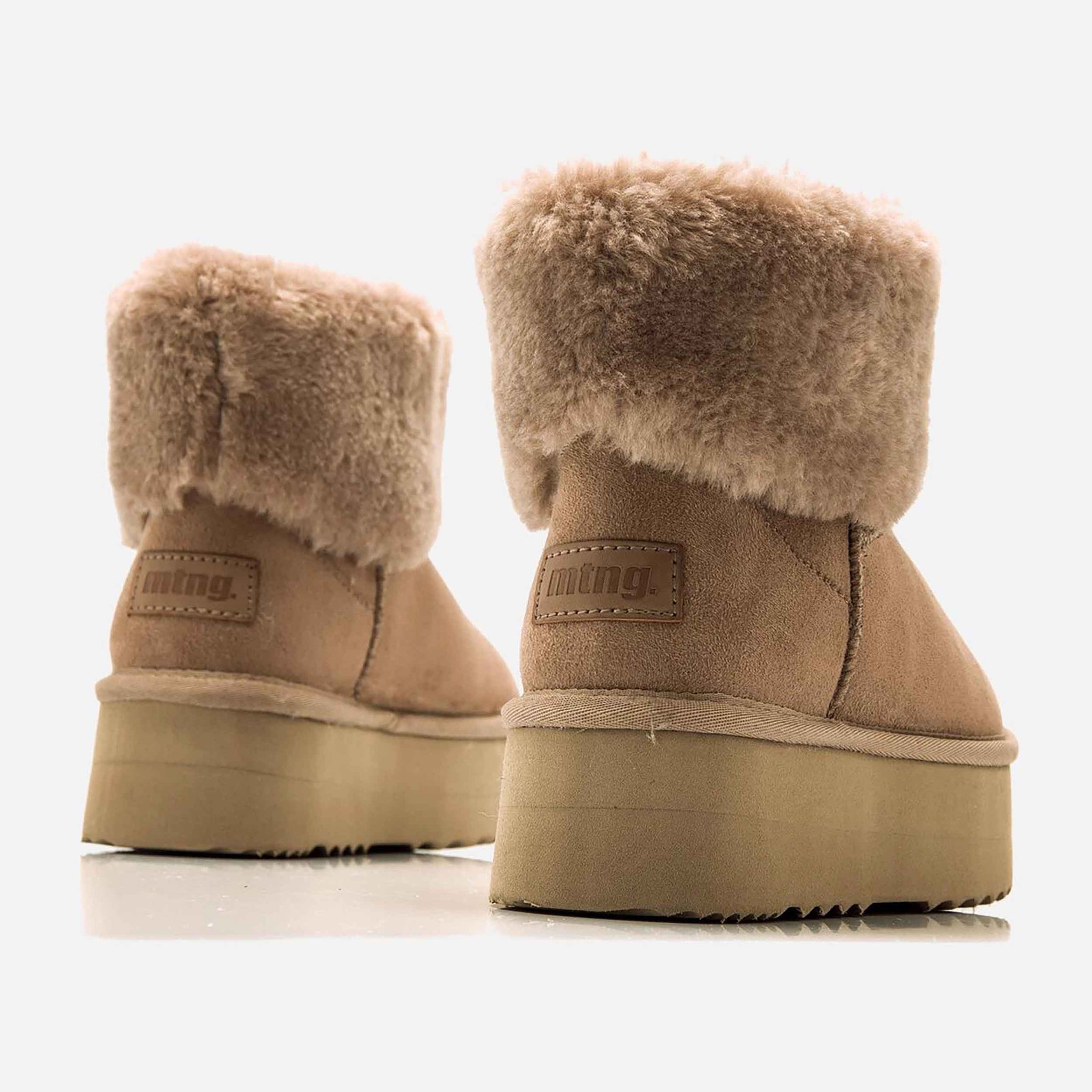 Botín Nivia mtng de estilo australiana para mujer, diseño de color marrón estilo casual. Destaca gracias a su forro de pelo sintético de color beige alrededor de la caña. Doble suela para añadir un par de centímetros a tus looks. Un modelo ideal para llevar un toque diferente y de tendencia a tu estilo.