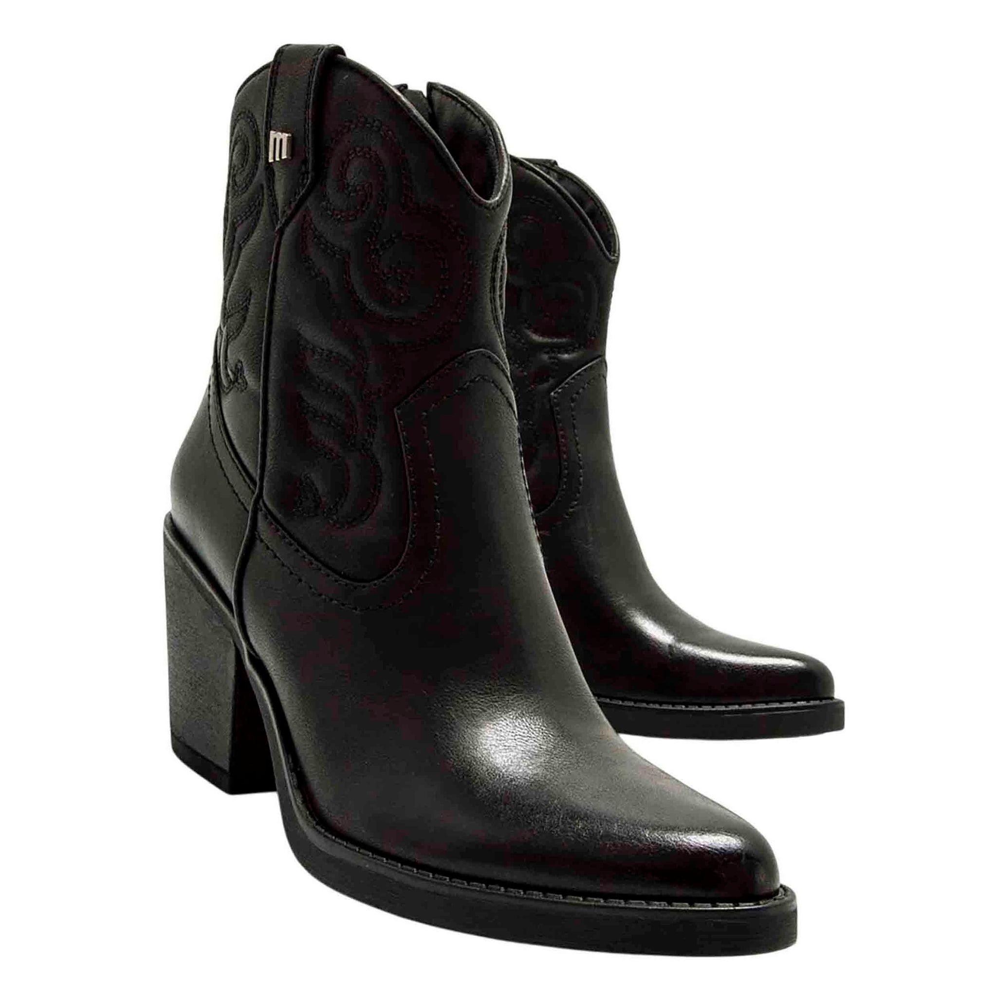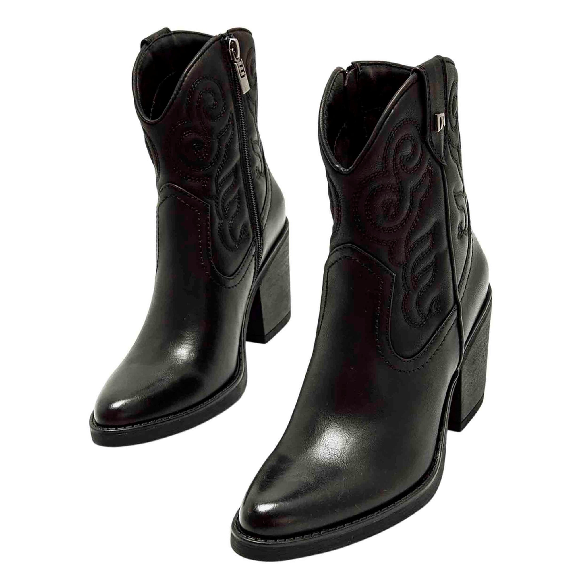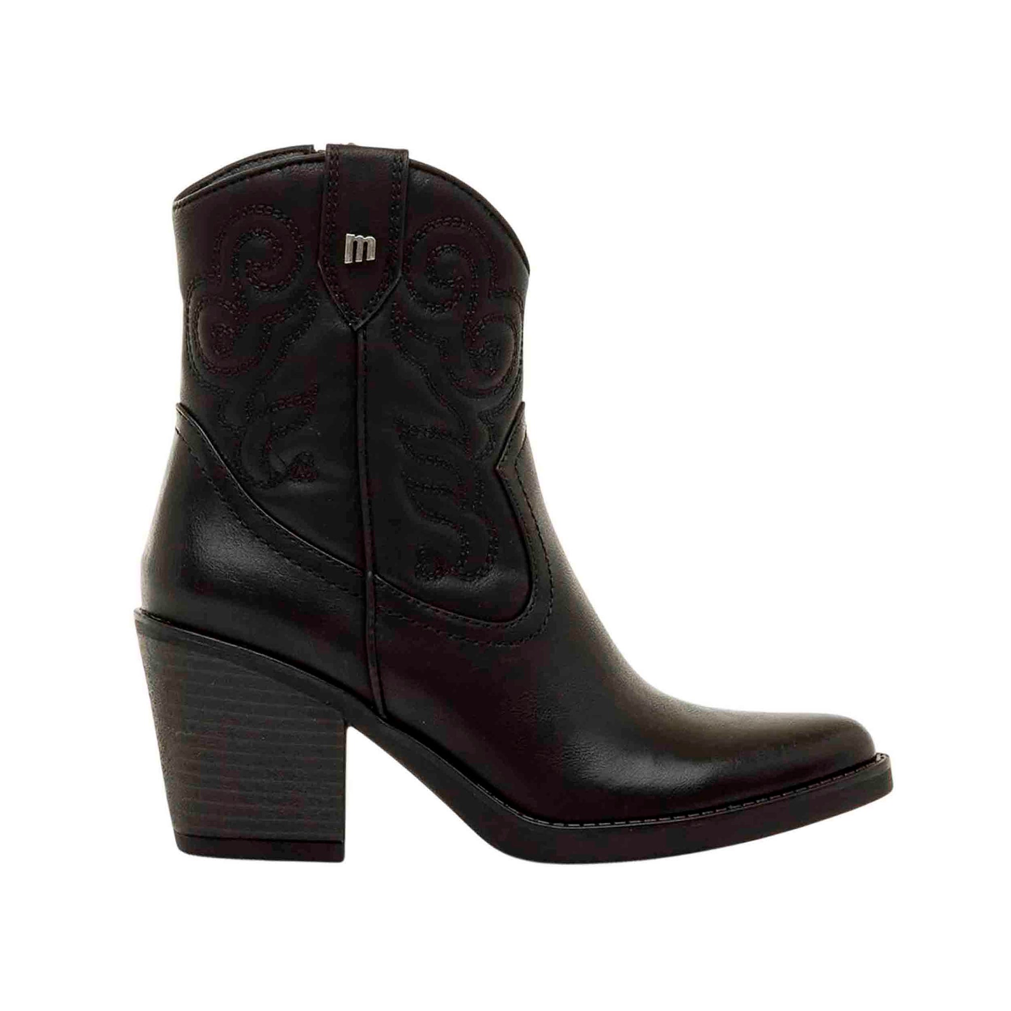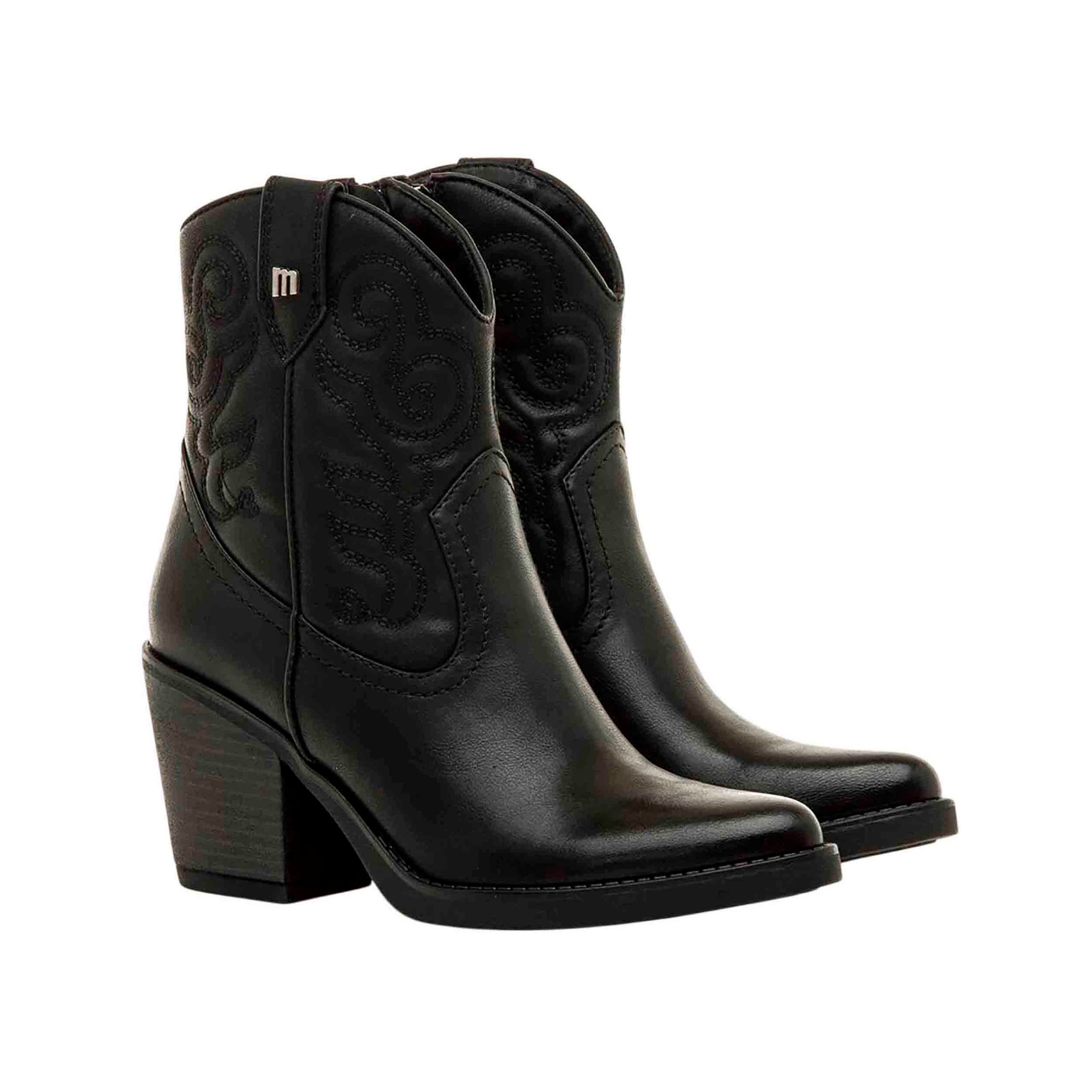 Estilo cowboy acentuado en la forma de la puntera ligeramente afilada y el tacón de bloque de altura media alta que aporta elevación sin comprometer la estabilidad al caminar. Color negro intenso permite combinar con una gran variedad de prendas: vaqueros, faldas, vestidos o pantalones cargados de textura, adaptándose tanto a looks casuales como a salidas más arregladas. Cierre con cremallera lateral agiliza el calzado, facilitando ponerse el botín sin perder tiempo y manteniendo un ajuste cómodo en el tobillo.
