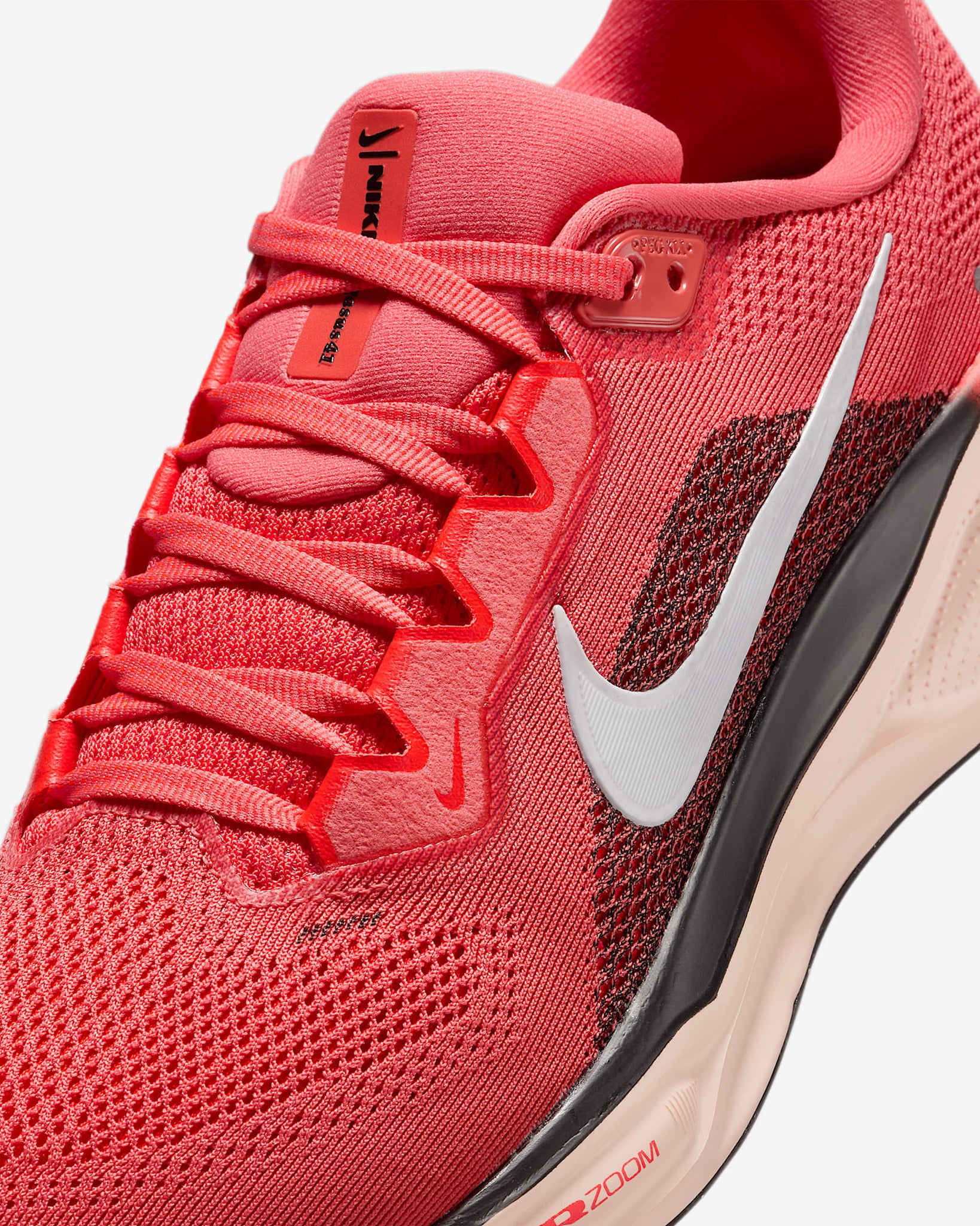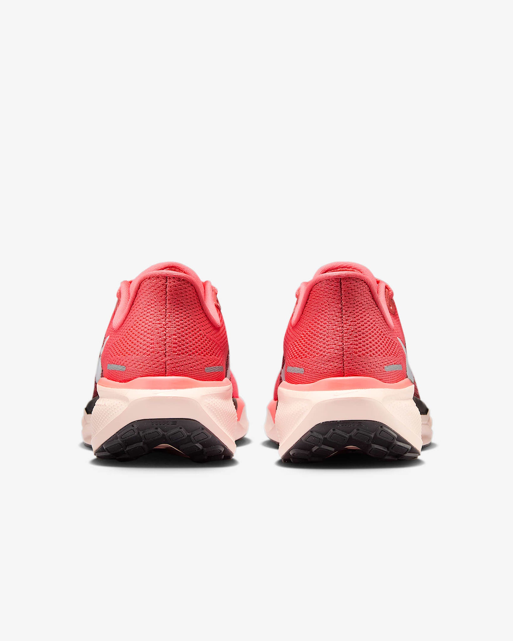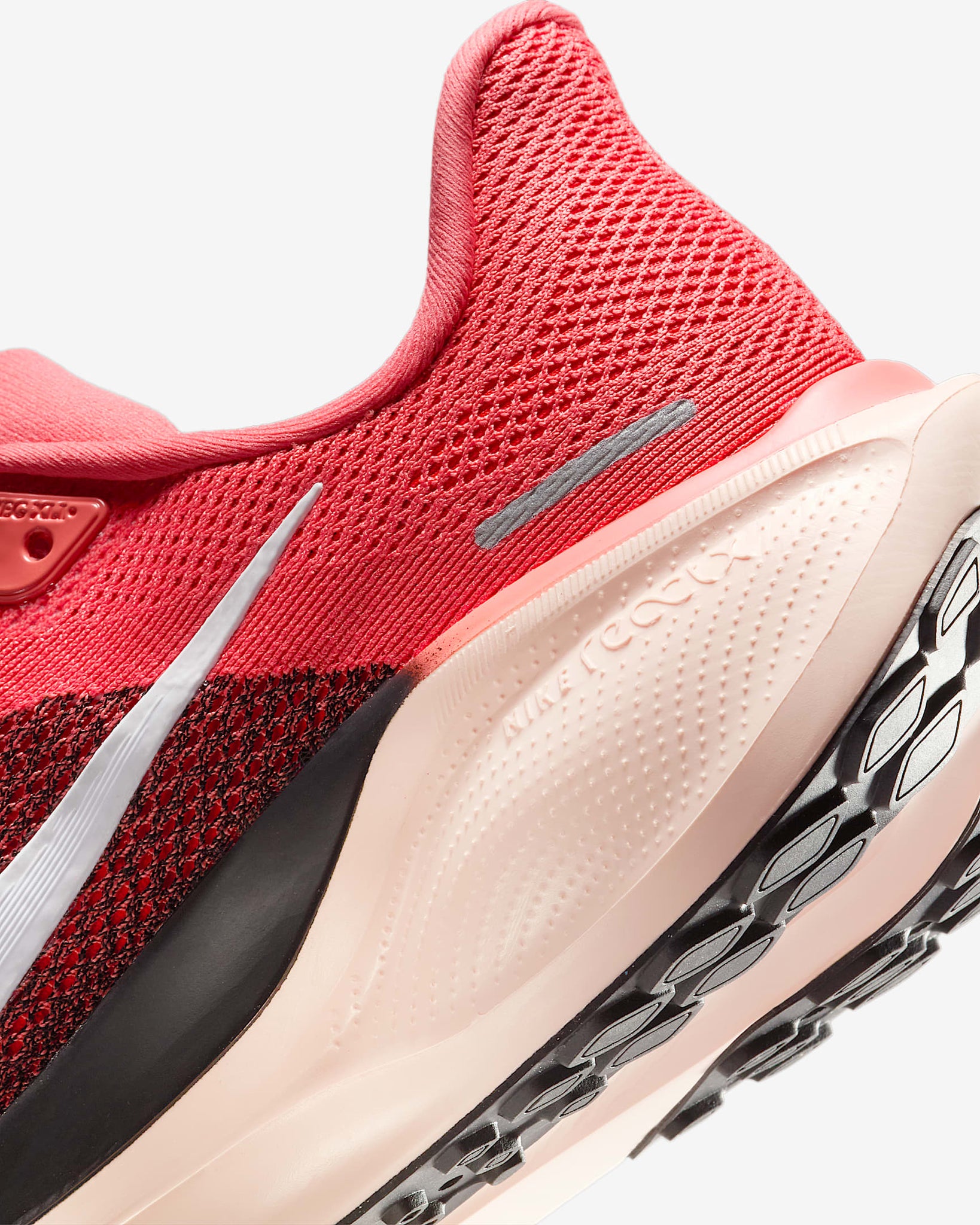 La parte superior de las Pegasus 41 cuenta con malla Engineered Mesh mejorada, que no solo reduce el peso total del calzado, sino que también aumenta la transpirabilidad, manteniendo tus pies frescos y secos durante todo el recorrido. Su diseño en tonos Magic Ember/Negro/Washed Coral/Blanco aporta una estética moderna y sofisticada que combina a la perfección con la funcionalidad.