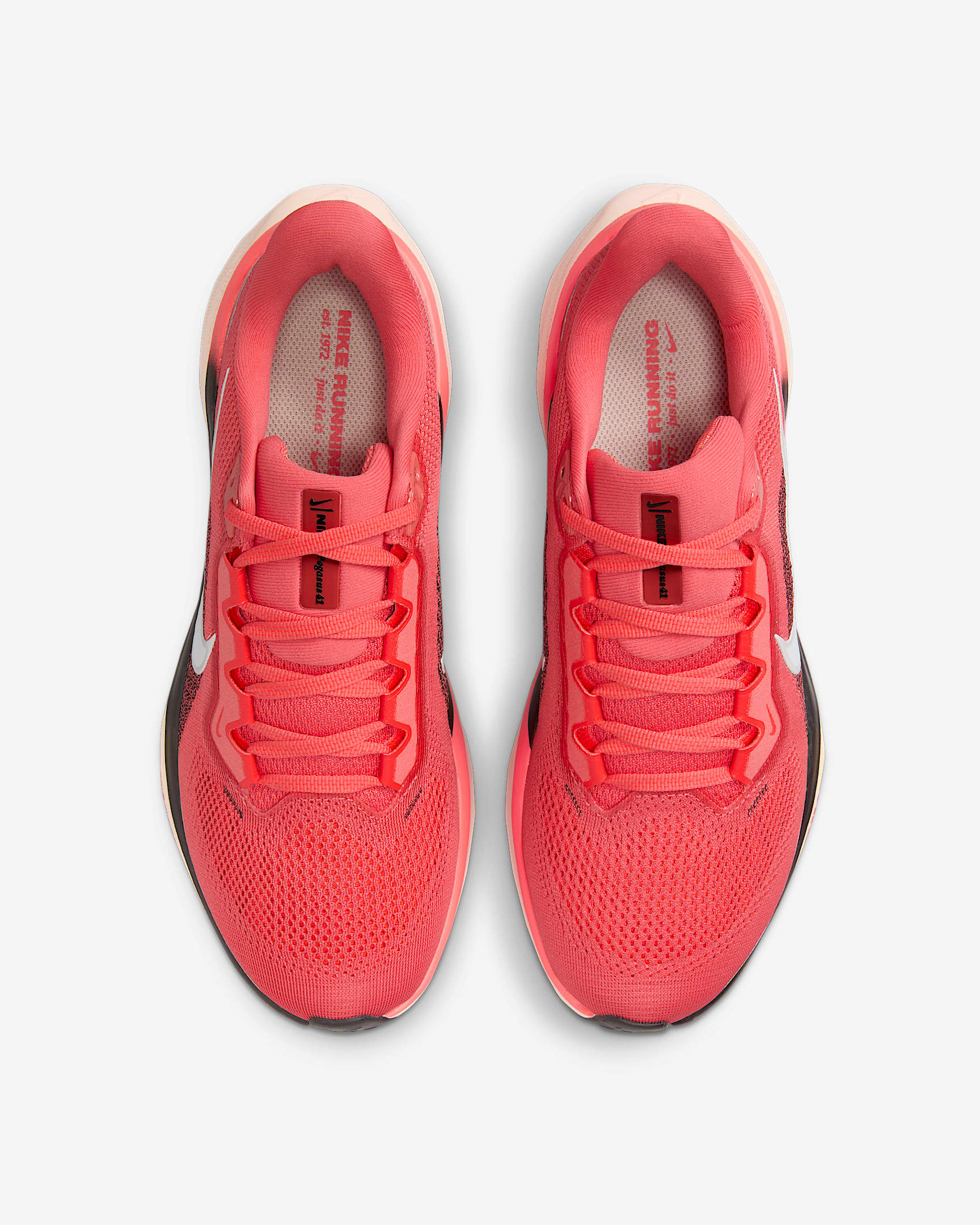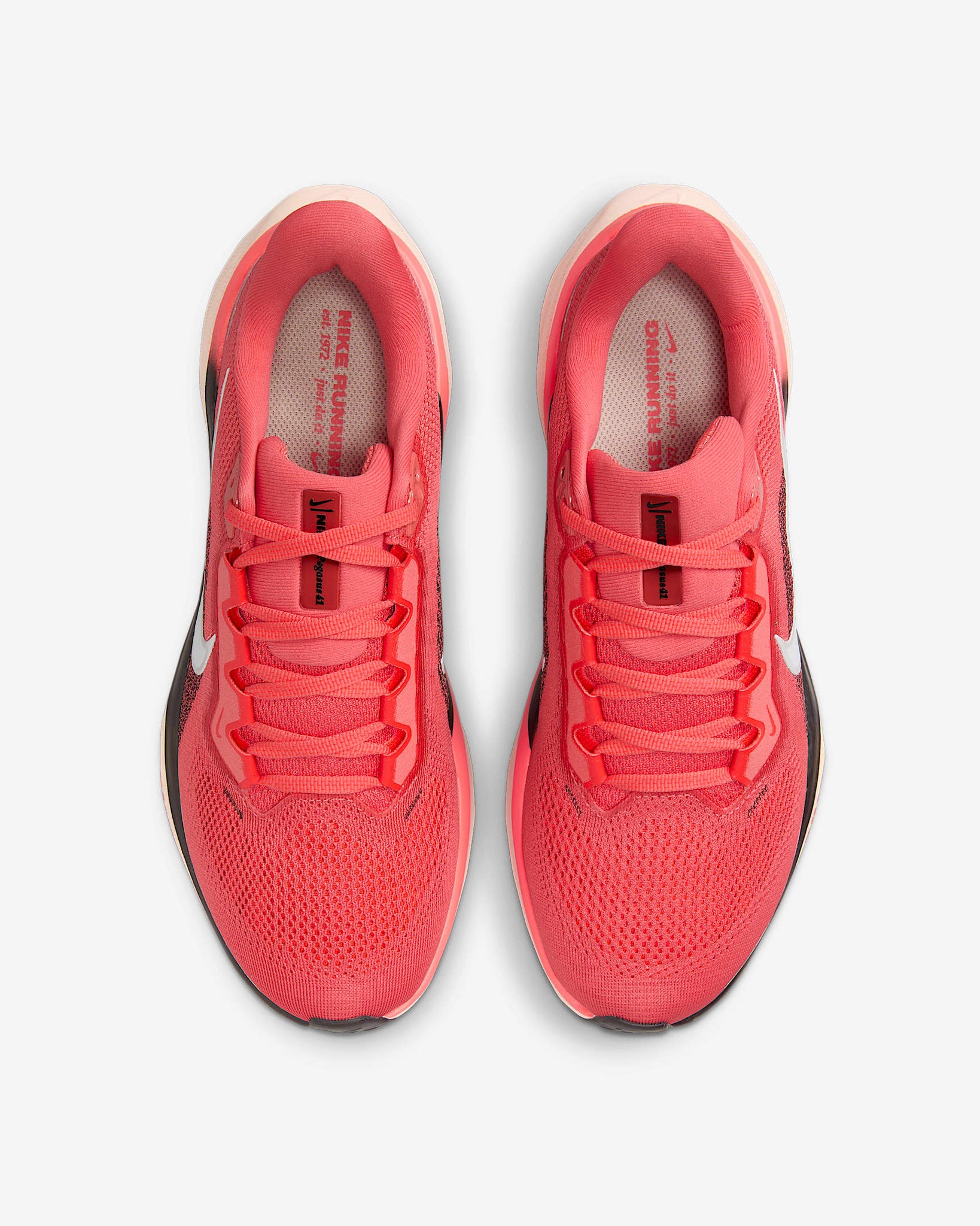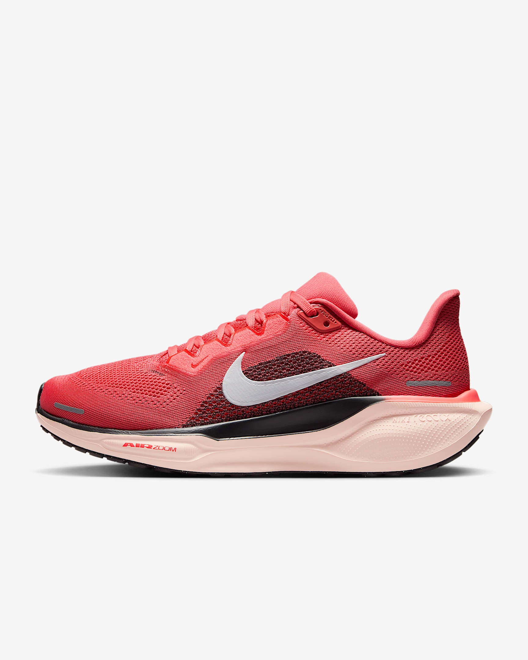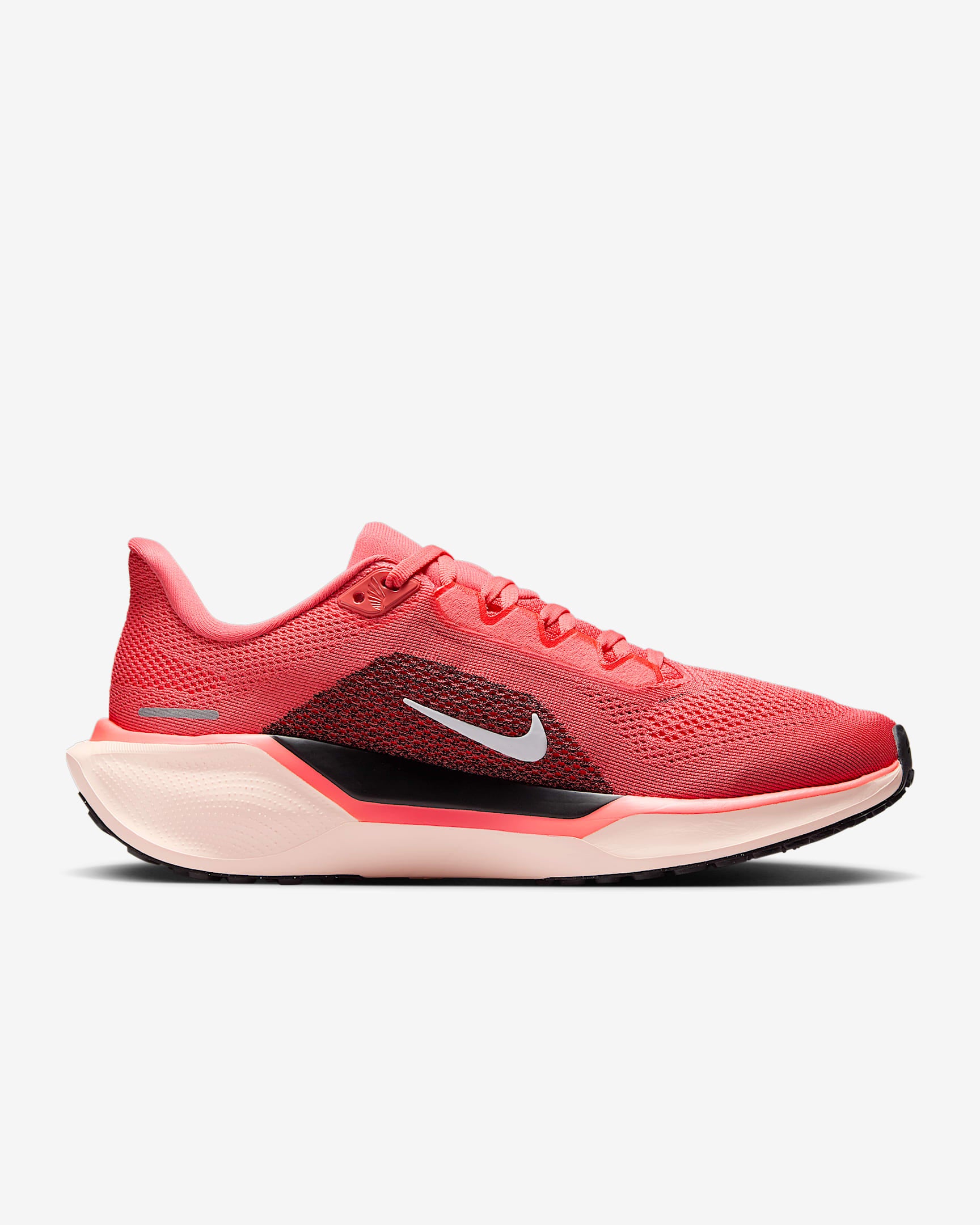 La parte superior de las Pegasus 41 cuenta con malla Engineered Mesh mejorada, que no solo reduce el peso total del calzado, sino que también aumenta la transpirabilidad, manteniendo tus pies frescos y secos durante todo el recorrido. Su diseño en tonos Magic Ember/Negro/Washed Coral/Blanco aporta una estética moderna y sofisticada que combina a la perfección con la funcionalidad.