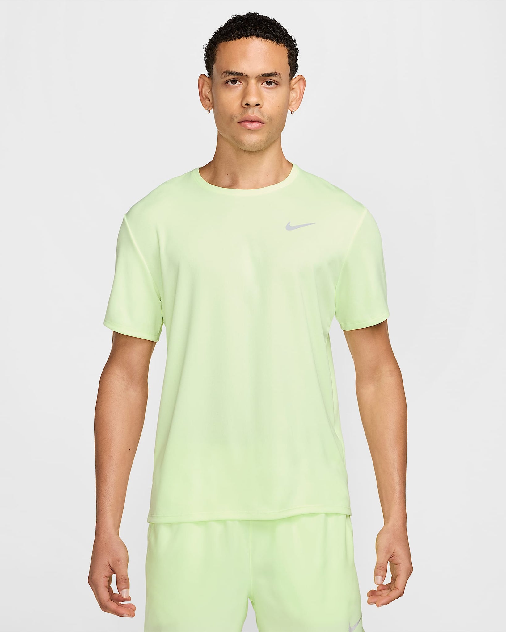 La camiseta Nike Miler DV9315‑701 en color  Barely Volt (verde) presenta un diseño ultraligero confeccionado con 100 % poliéster reciclado, incorporando la reconocida tecnología Dri‑FIT para gestionar el sudor y mantenerte seco mientras superas tus kilómetros. Su tejido Knit combina una cara microperforada y otra plana, ofreciendo una sensación fresca al contacto con la piel y favoreciendo una excelente ventilación.