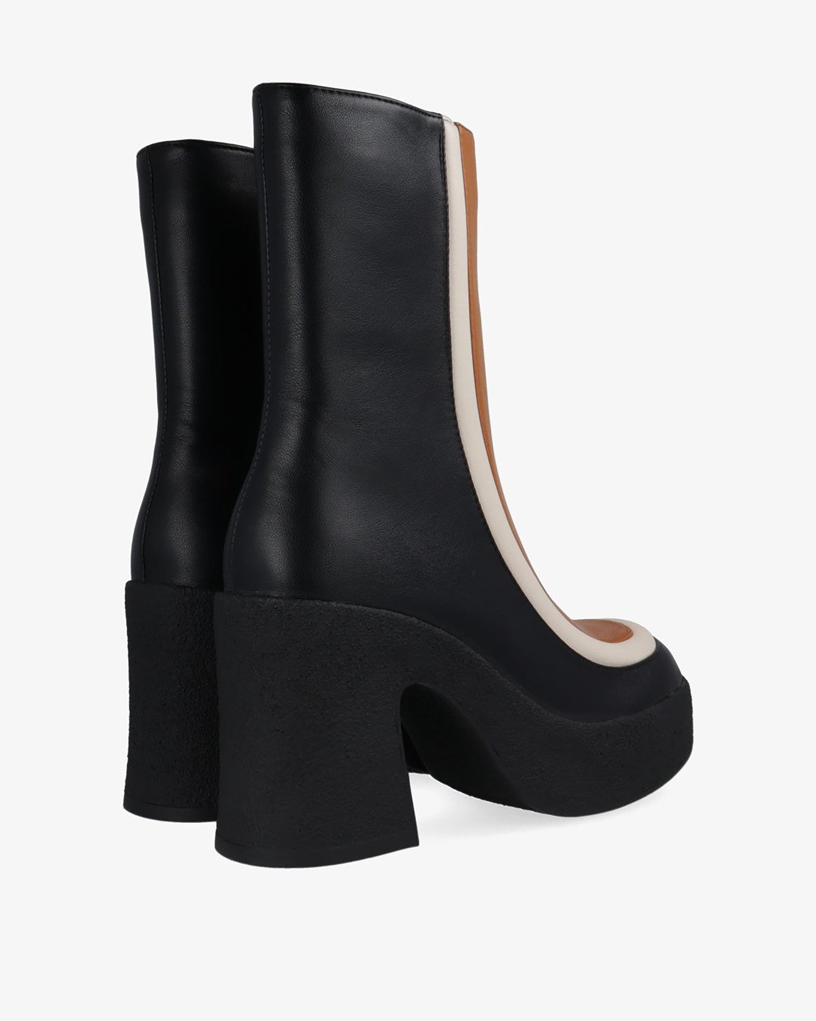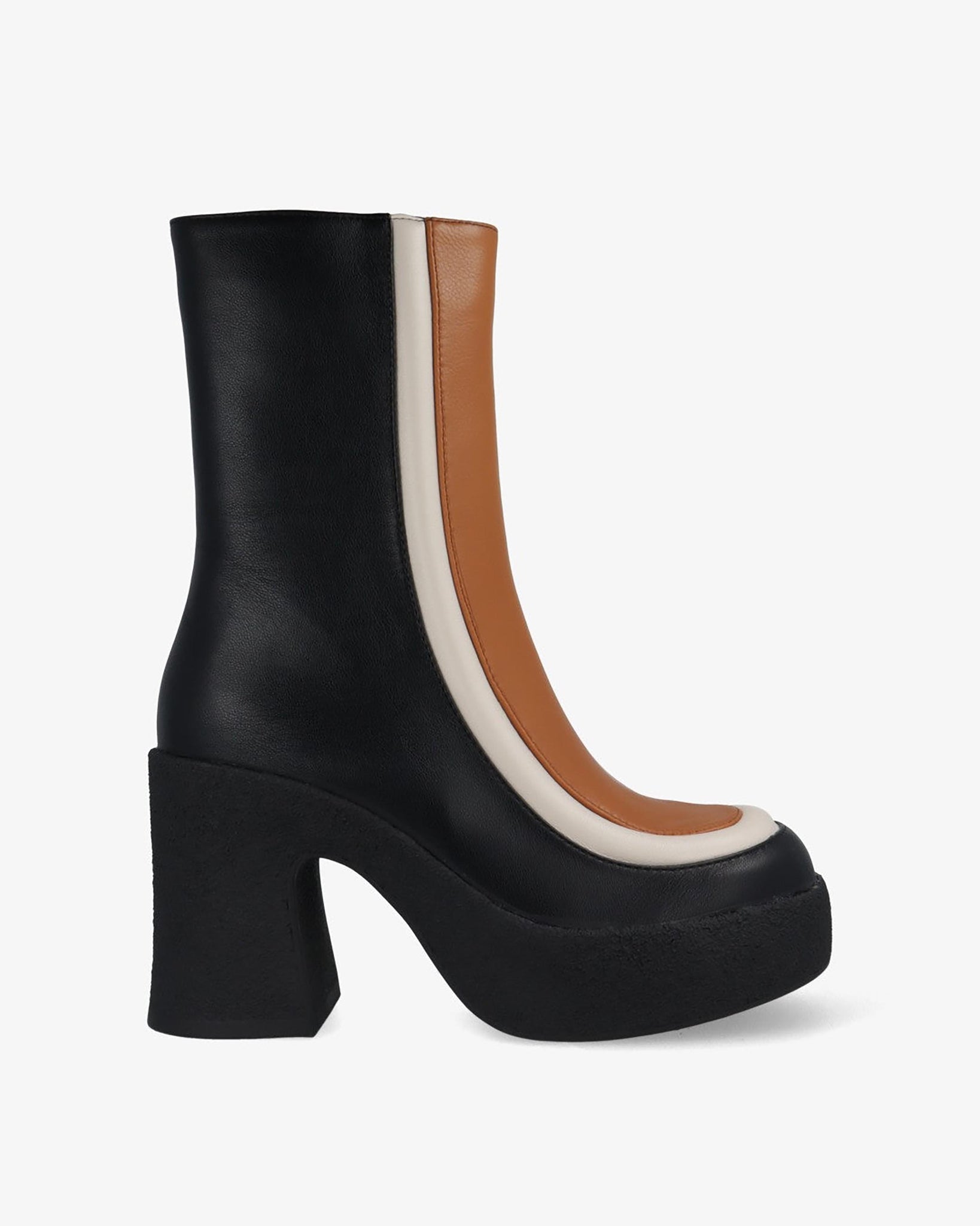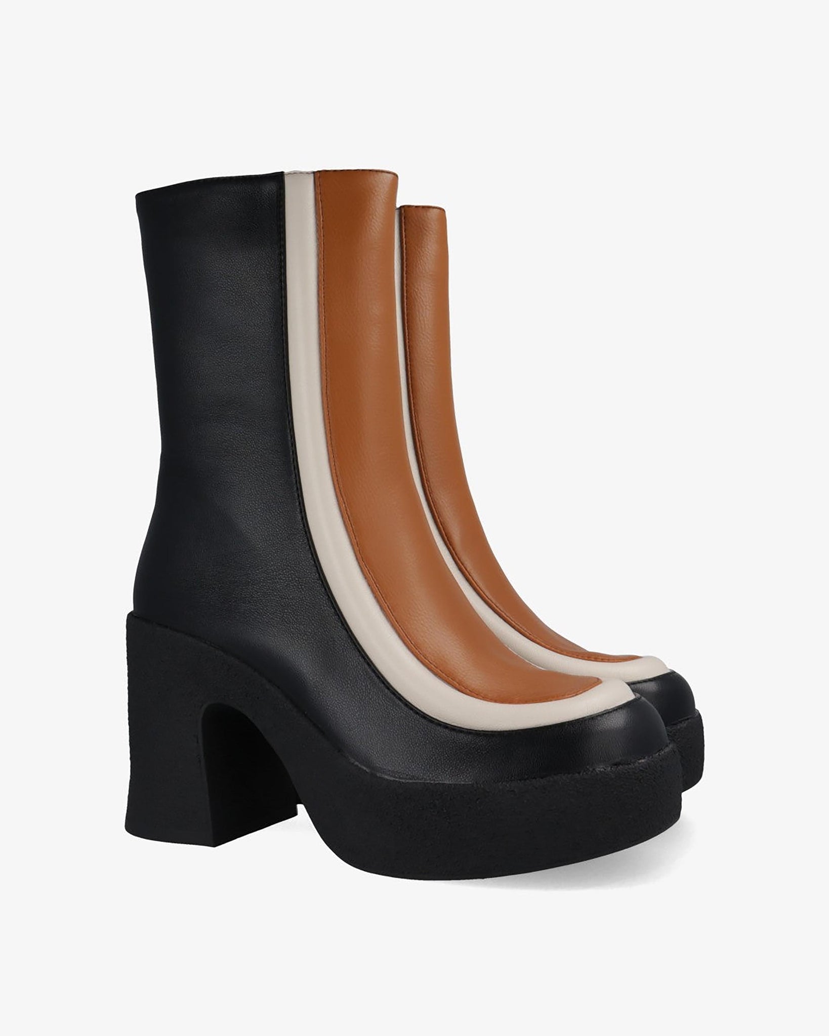 Botín de napa stretch con su diseño y mix de colores (negro, cuero, blanco roto), su plataforma al tono, te encantará.