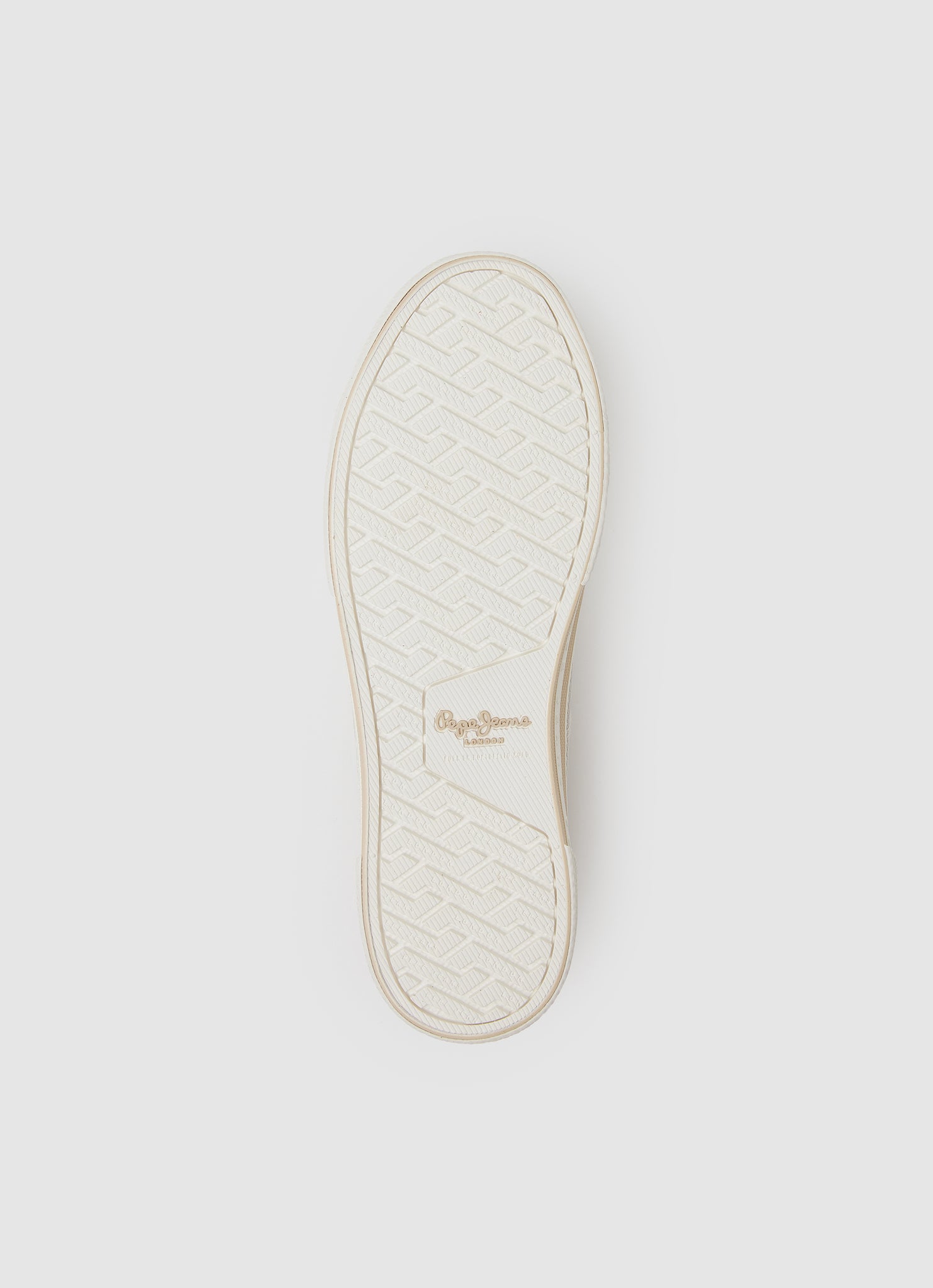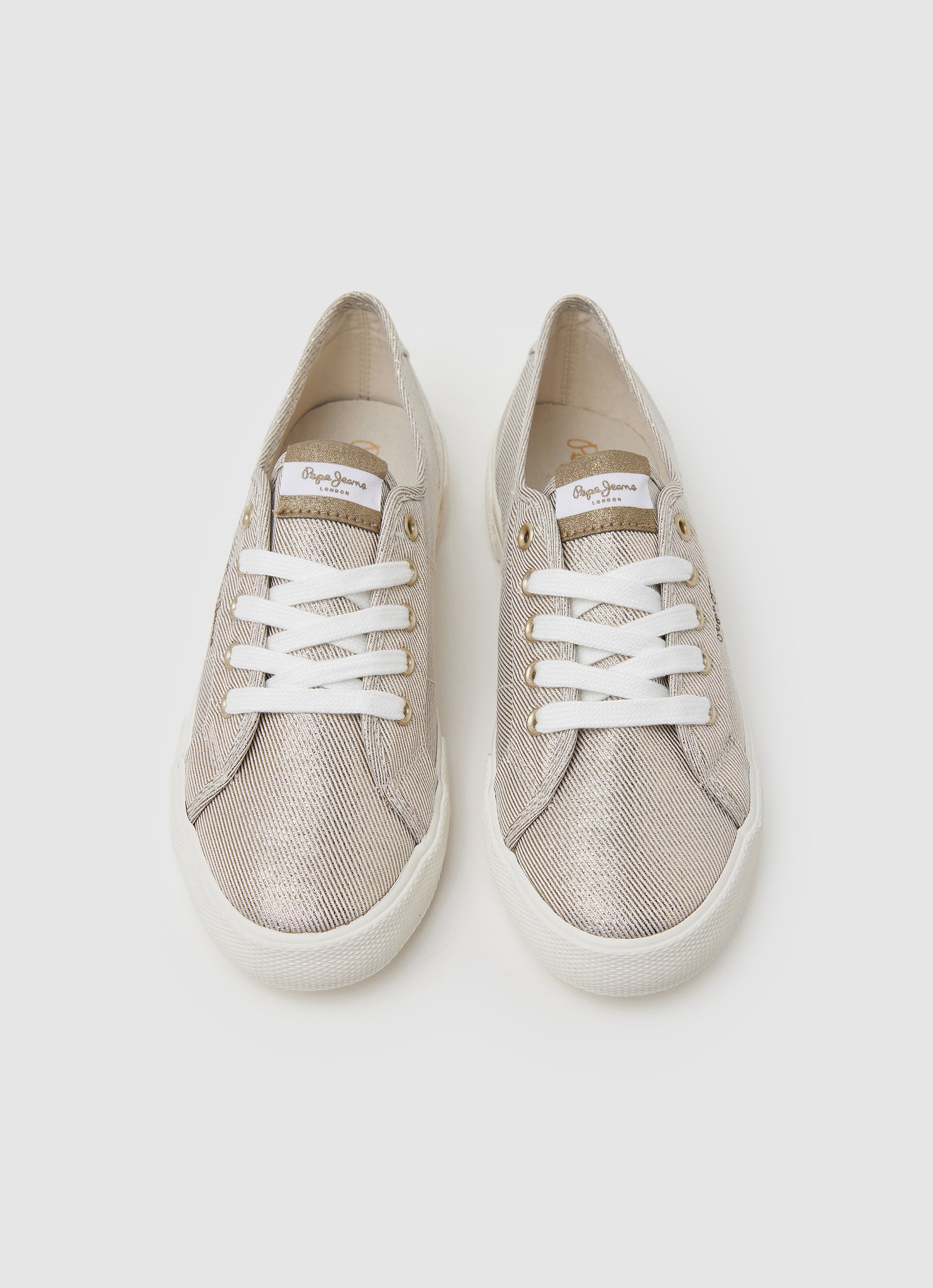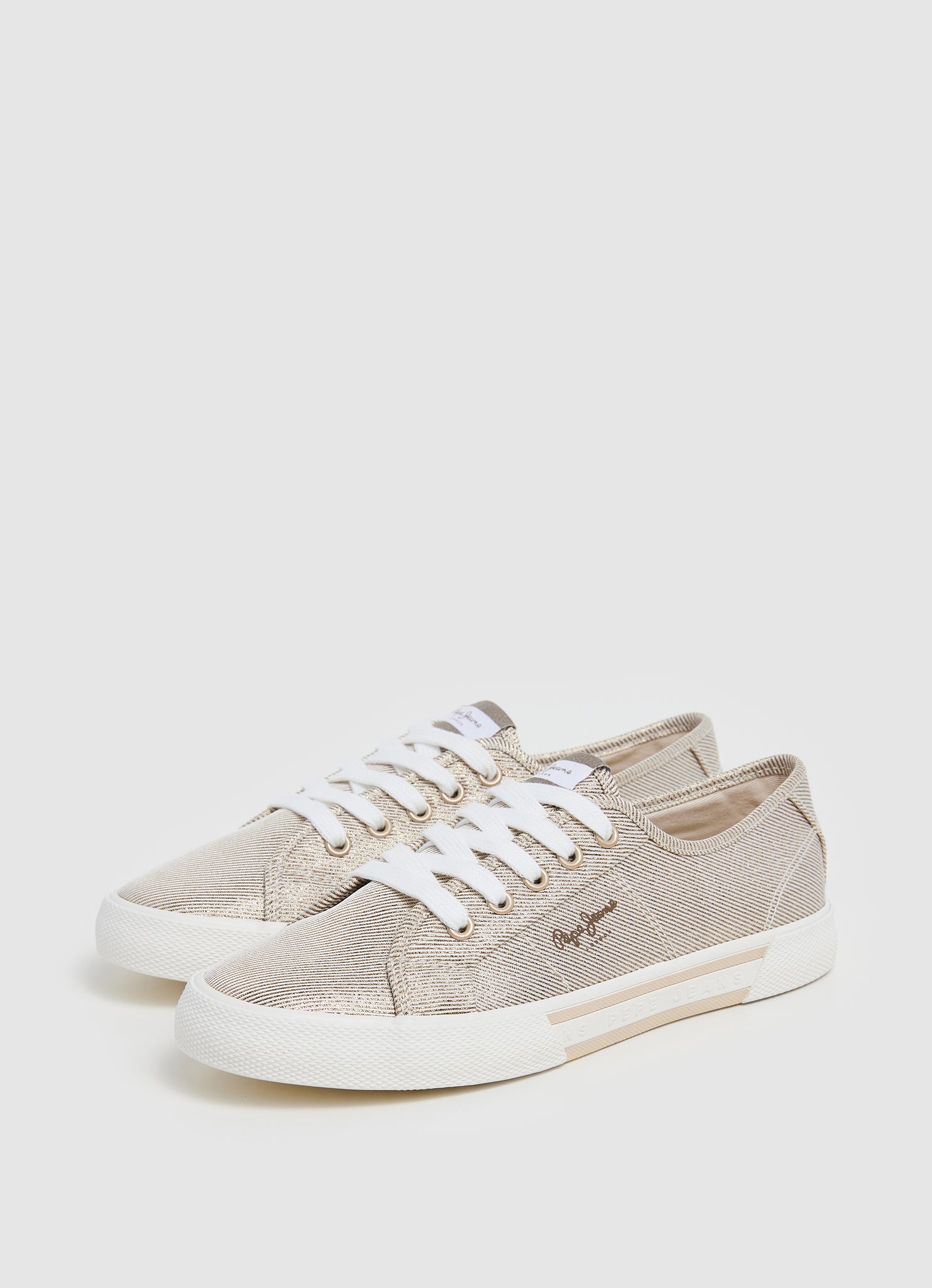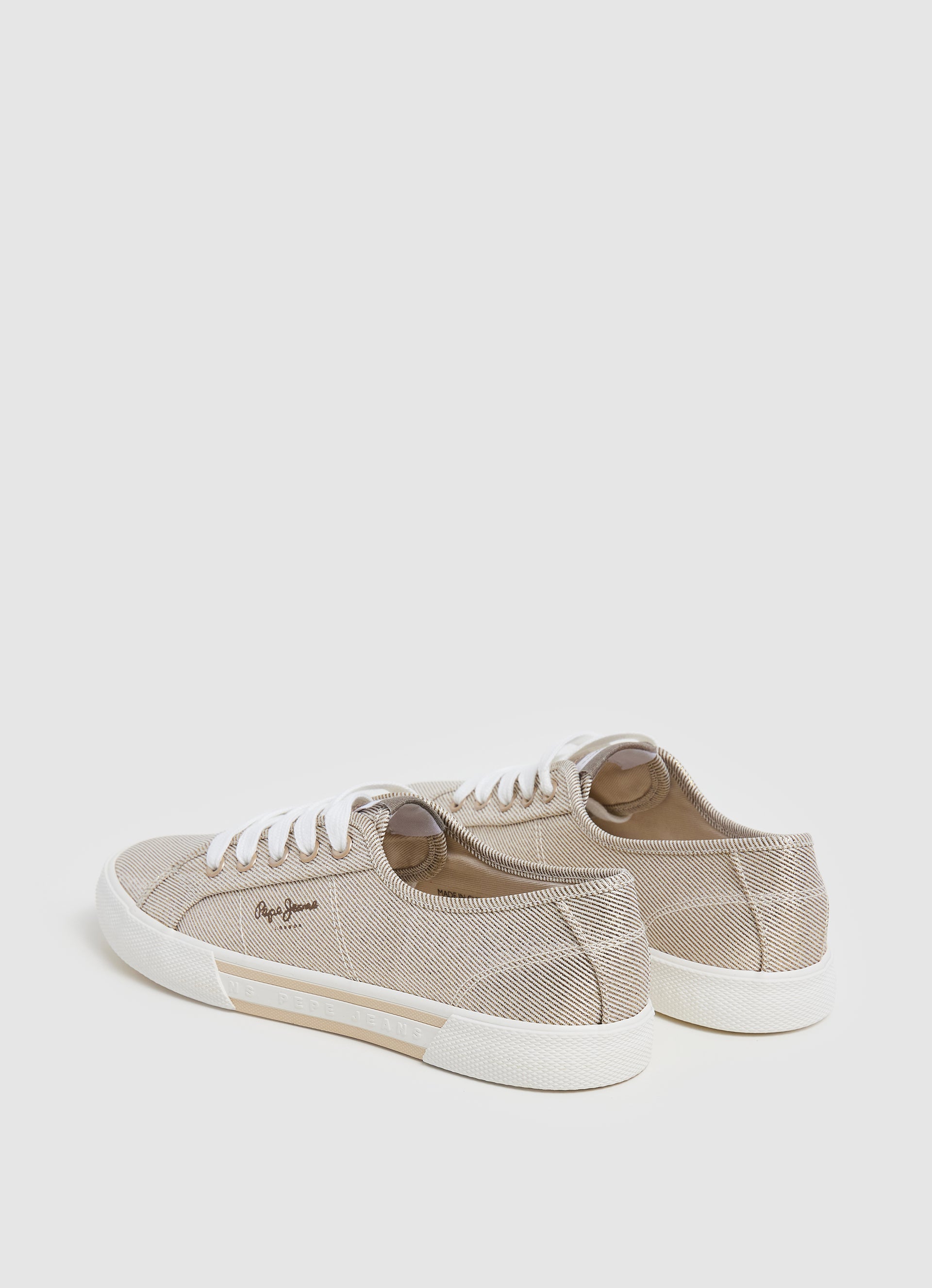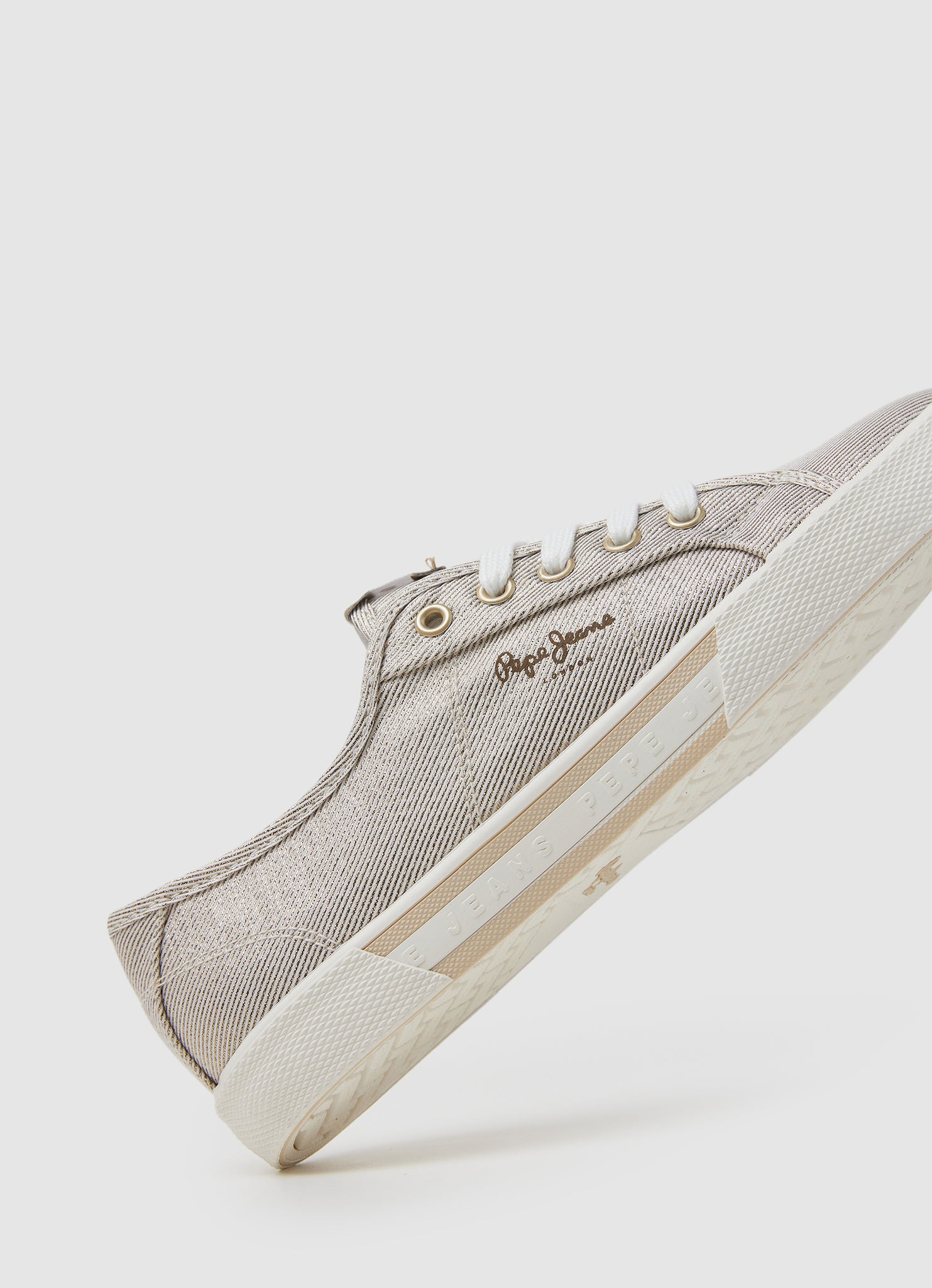 El diseño clásico en sarga de algodón se complementa con un cierre de cordones y ojales metálicos, asegurando un ajuste perfecto y cómodo. El logo PEPEJEANS termosellado en el lateral y la etiqueta con el logo en la lengüeta añaden un sello distintivo de la marca, aportando un estilo único y auténtico.
