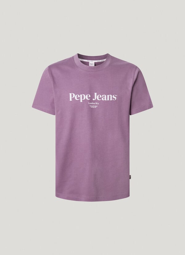 El diseño presenta un cuello redondo clásico y mangas cortas, perfectas para un look casual y relajado. El logo de Pepe Jeans estampado en el pecho resalta con sutileza, mientras que el detalle canalé en el cuello y el acabado de doble pespunte en las mangas y el bajo le aportan un toque de durabilidad y estilo adicional.