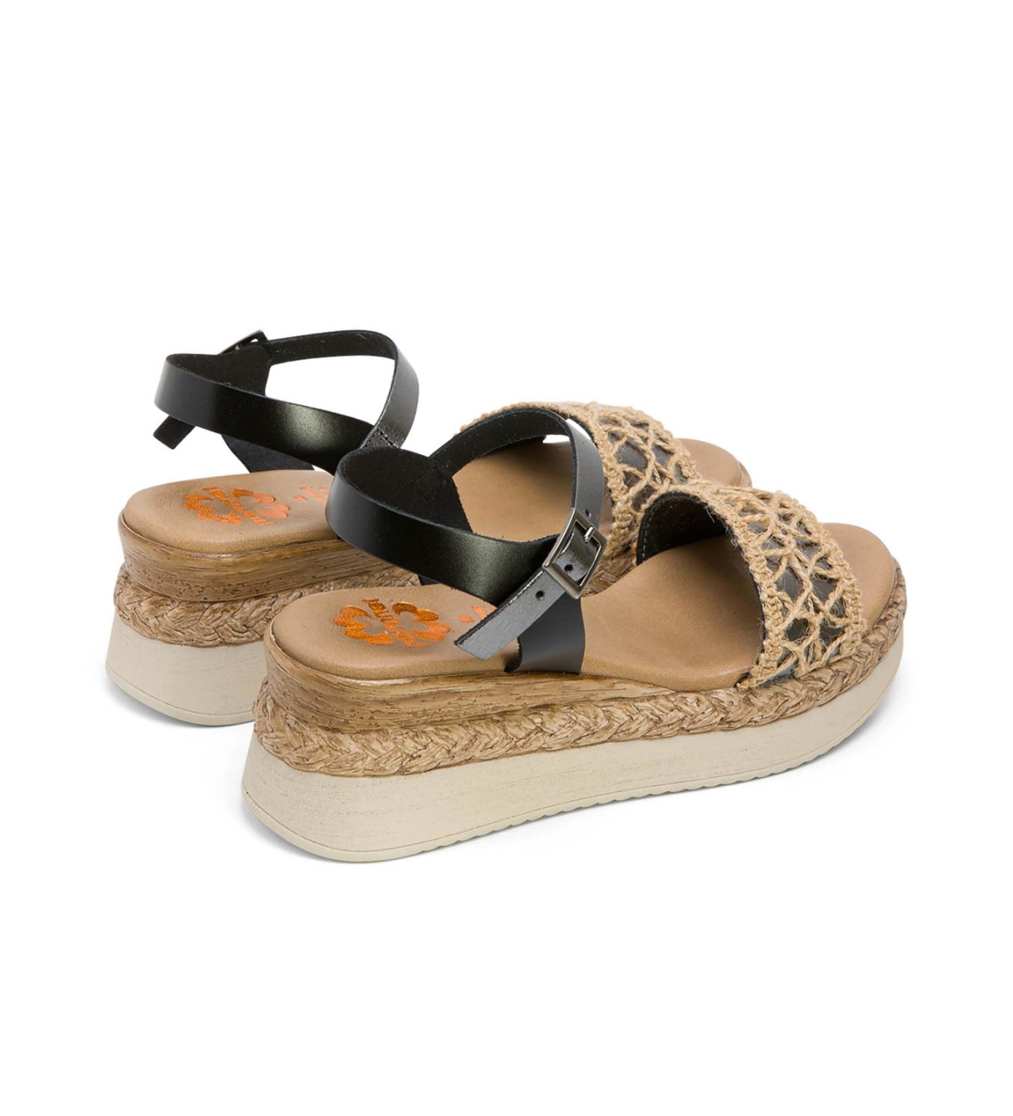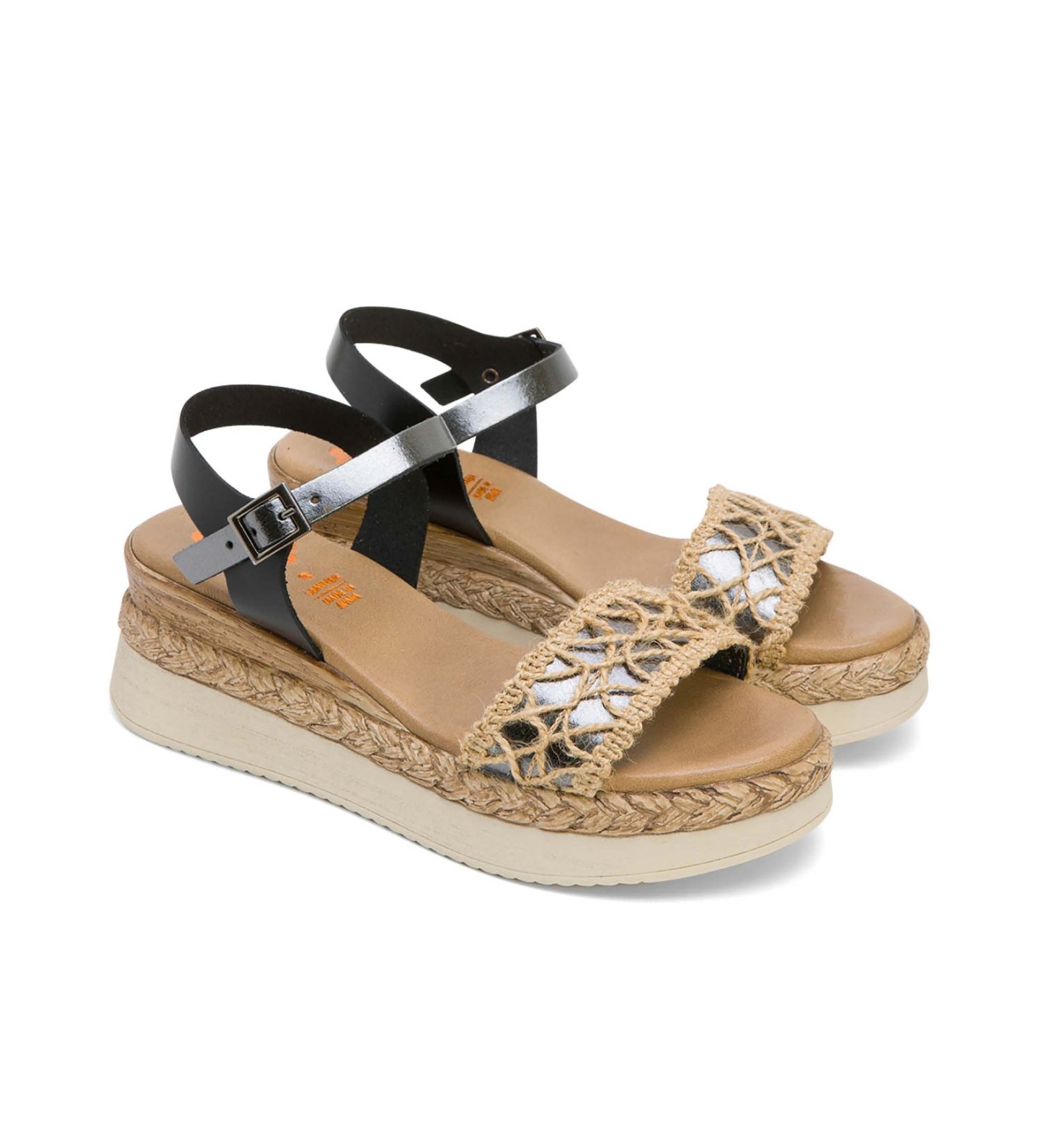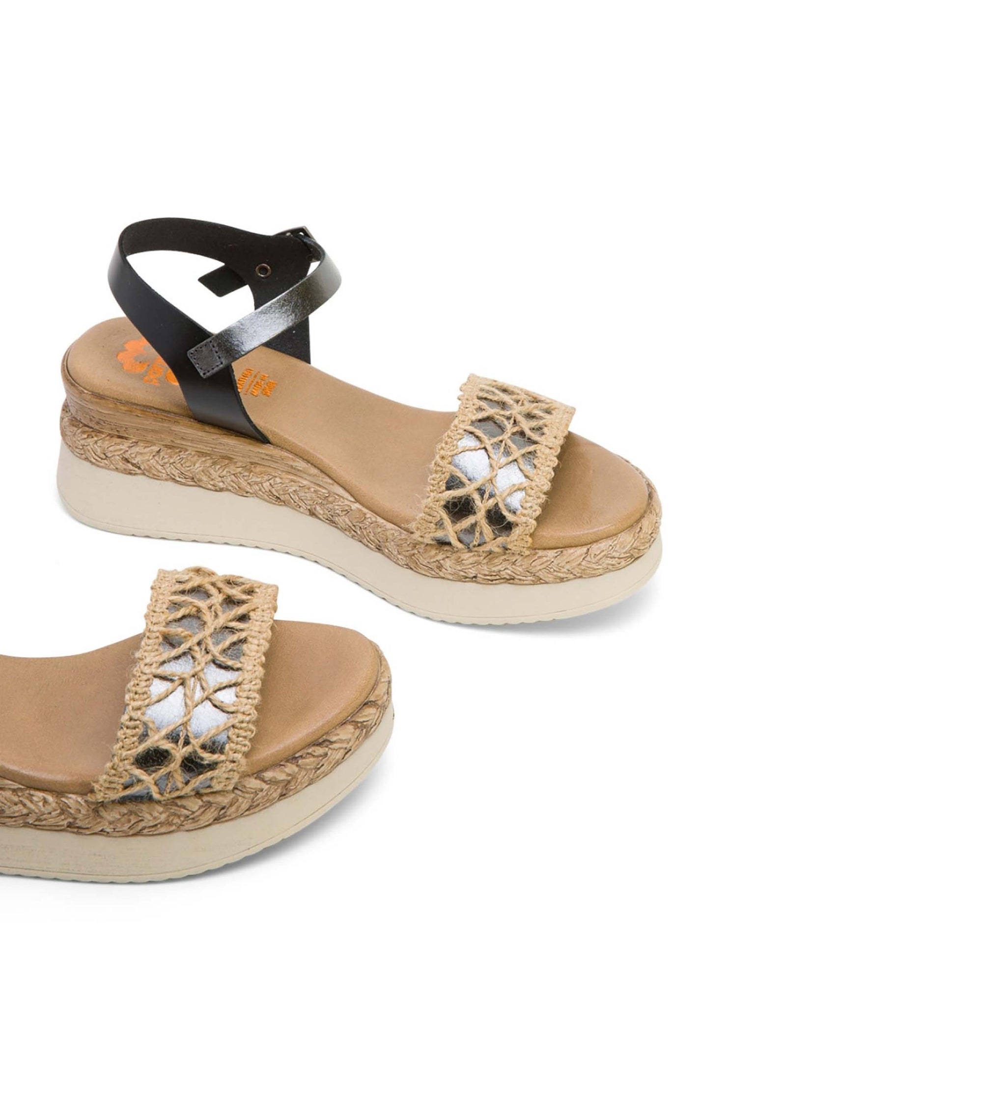 Sandalia con pala laminada y forrada con yute, talón de piel y cierre con hebilla metálica lateral ajustable en el tobillo. Cuña de 5,5 cm y plataforma de 2 cm que combina distintas texturas y tonalidades. Plantilla acolchada de piel que garantiza una gran comodidad. Fabricado artesanalmente en España.