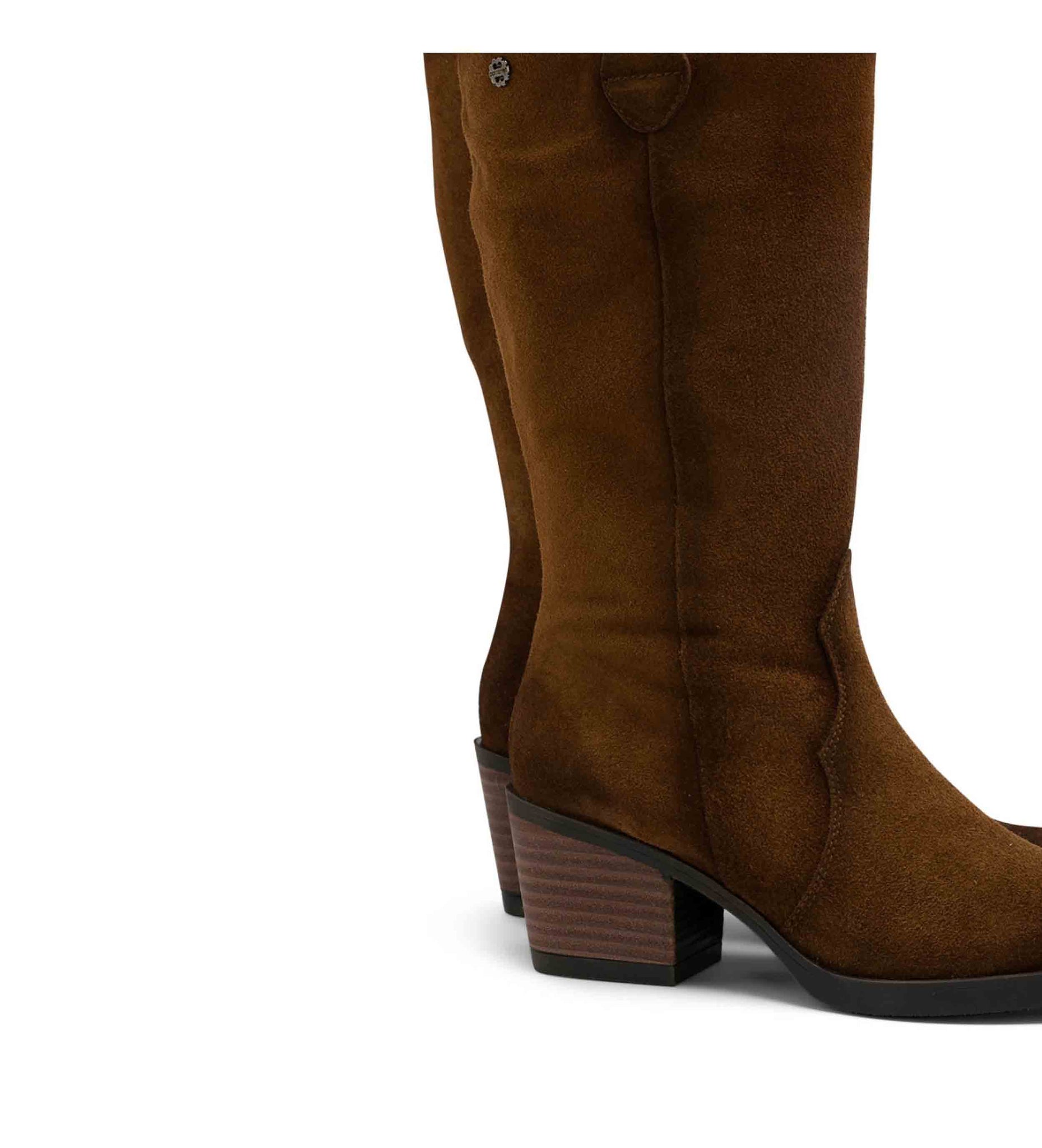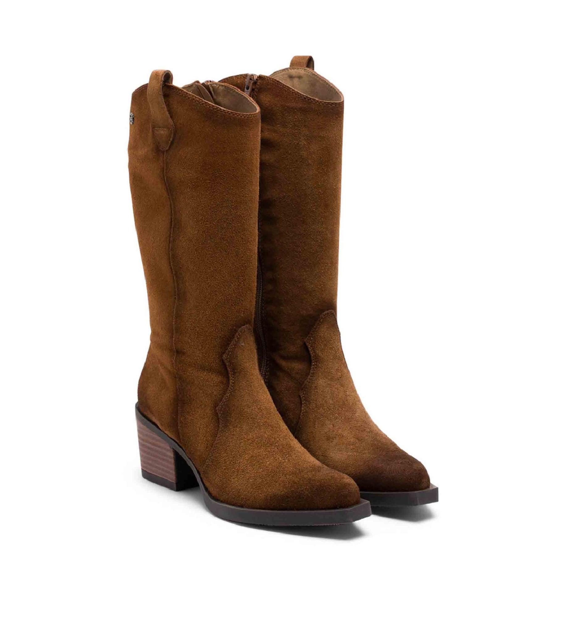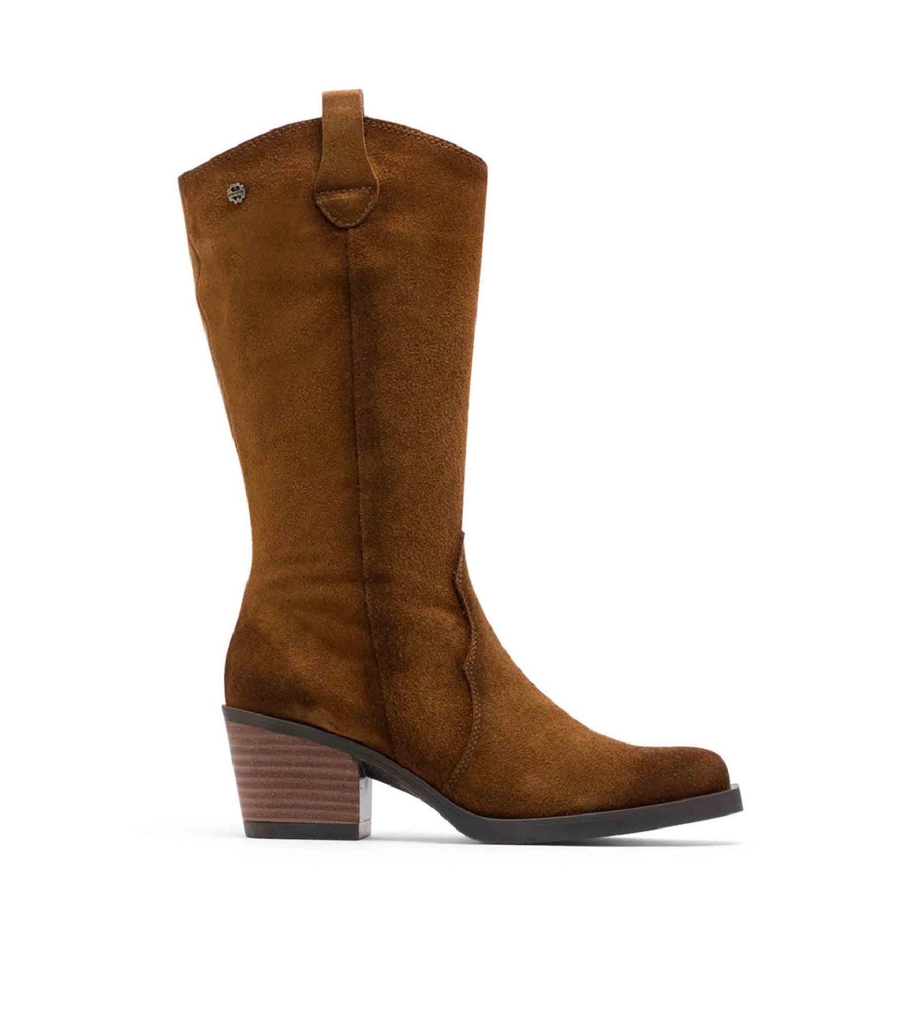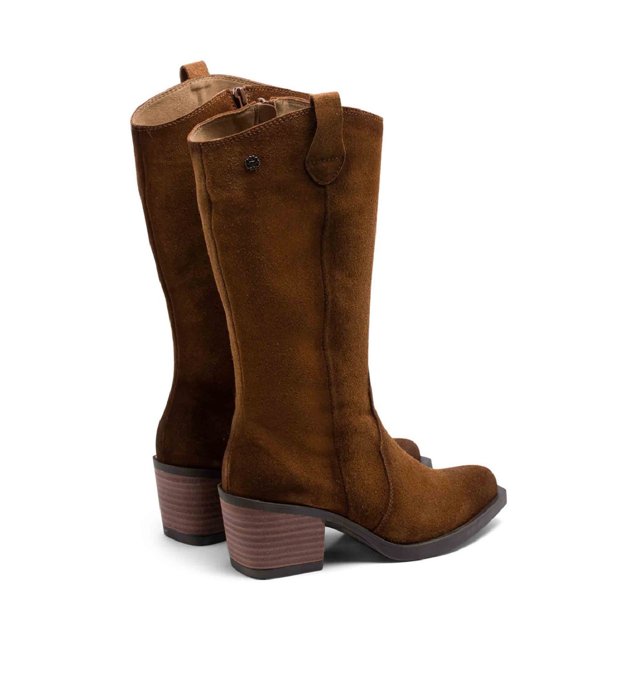 Botas estilo cowboy de serraje con tacón de 6,5 cm y plataforma de 1 cm. Apertura lateral con cremallera interior y tiradores laterales para facilitar el calce. Plantilla y forro de microfibra con acabado confort aterciopelado. Piso antideslizante y flexible. Elaborado 100% en España.