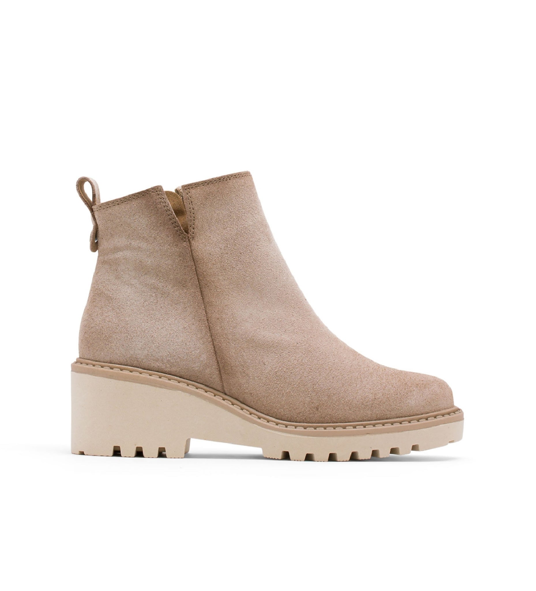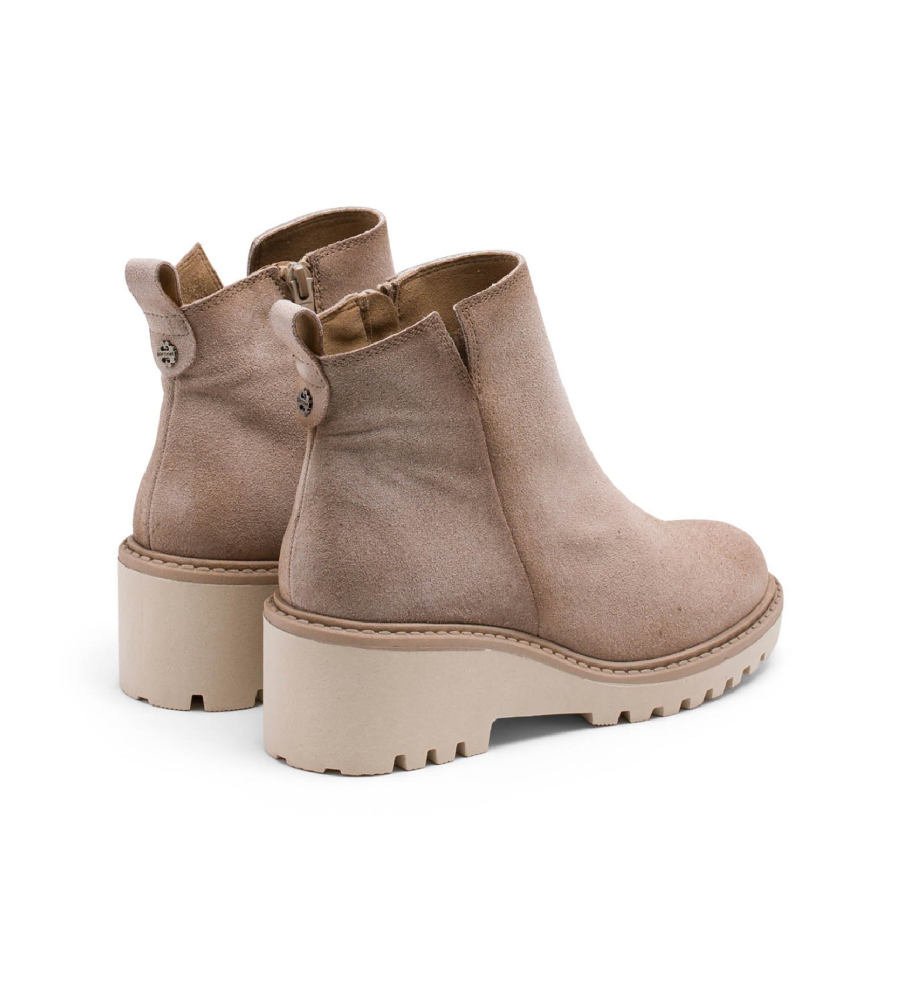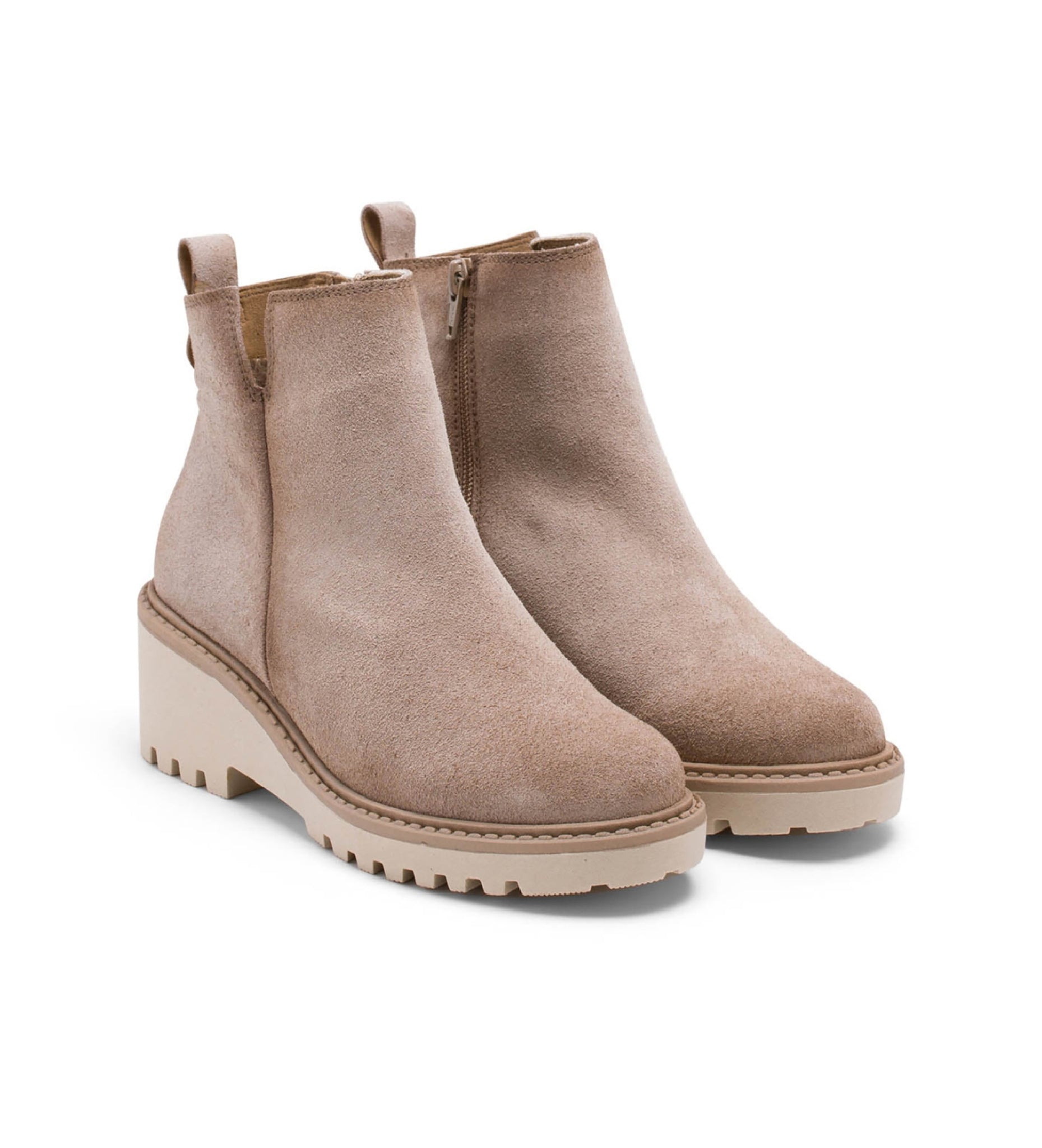 Botines de serraje con cuña de 5,5 cm y plataforma de 2 cm. Corte superior en V y apertura lateral con cremallera interior para facilitar el calce. Plantilla y forro de microfibra con acabado confort aterciopelado. Piso antideslizante y flexible. Elaborados 100% en España.