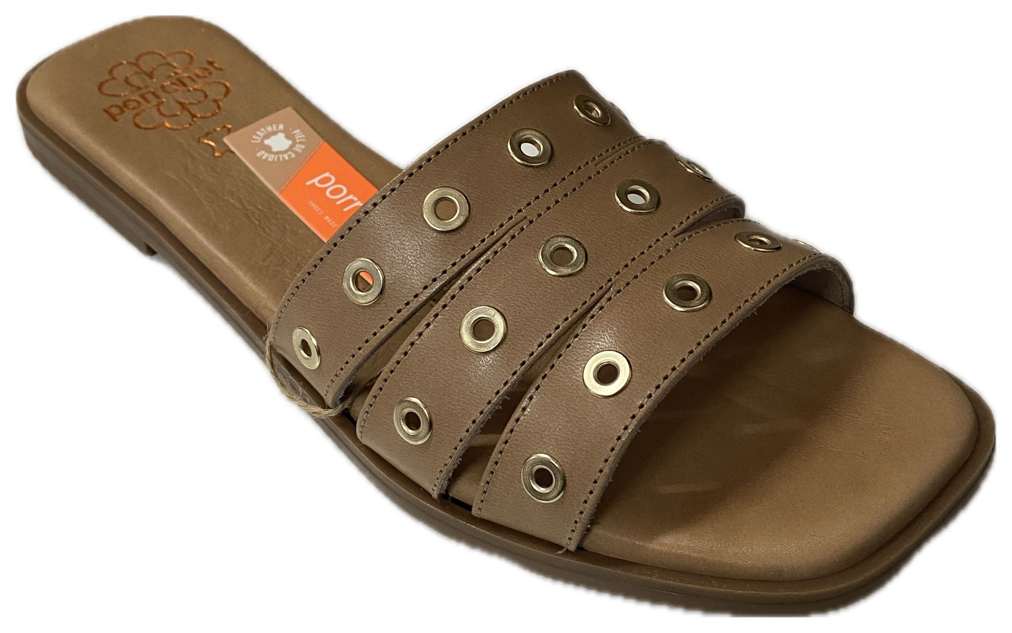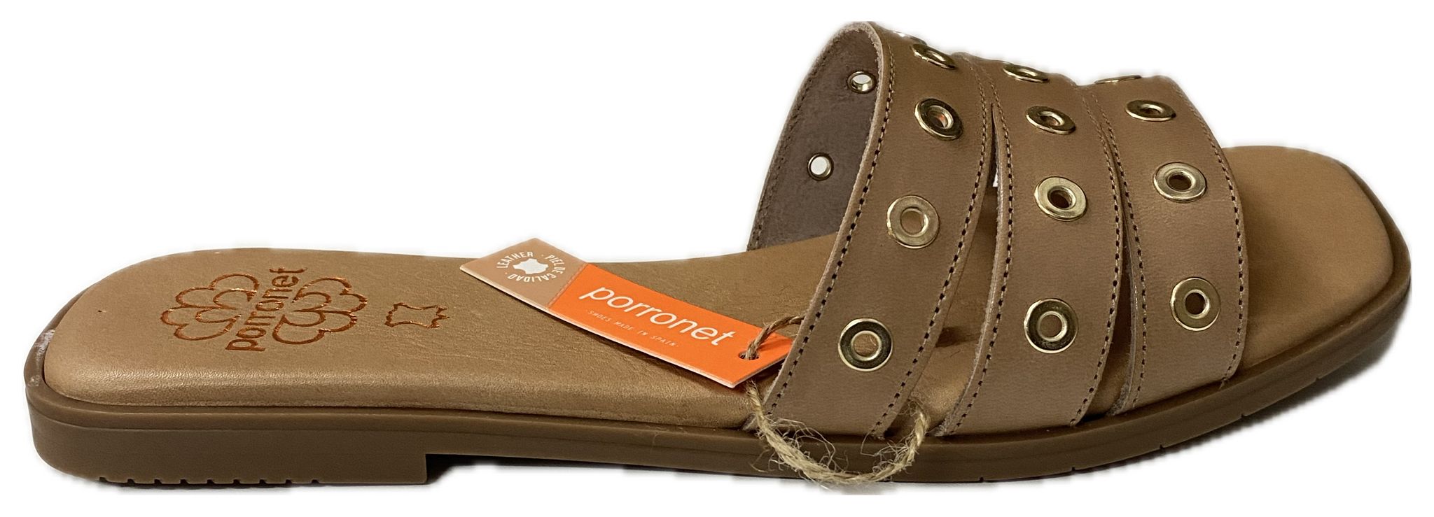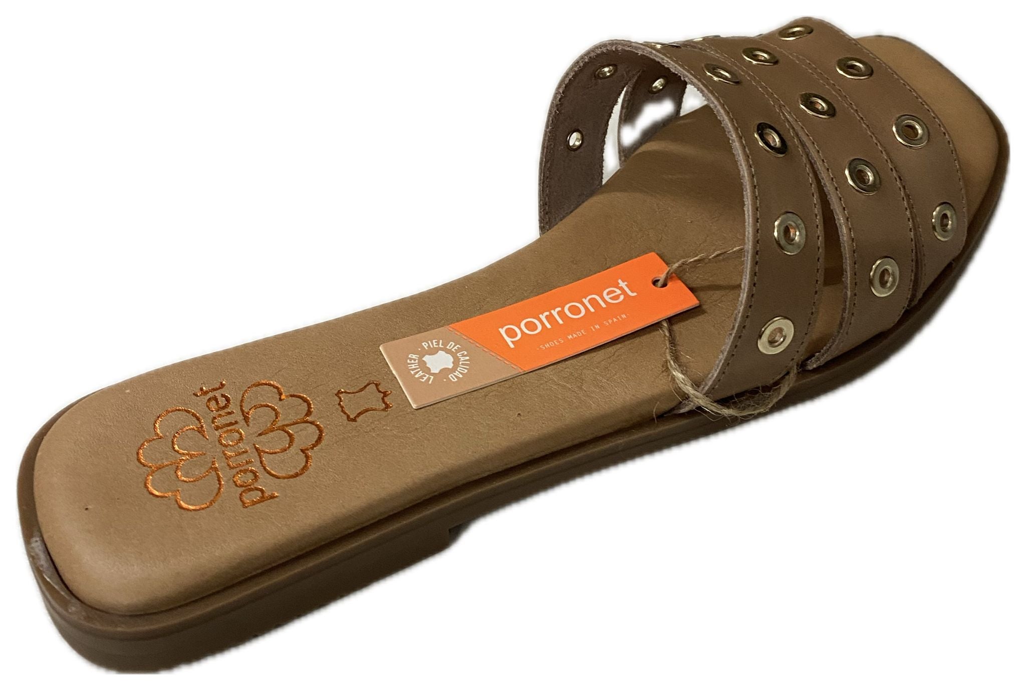 El corte de la sandalia está confeccionado en piel de alta calidad, en un tono taupe que aporta versatilidad y elegancia a cualquier conjunto. La pala, formada por tiras finas, está adornada con tachuelas metalizadas que aportan un toque de personalidad sin recargar el diseño. Este detalle no solo añade un punto de estilo, sino que también refleja la atención al detalle que caracteriza a la marca Porronet.