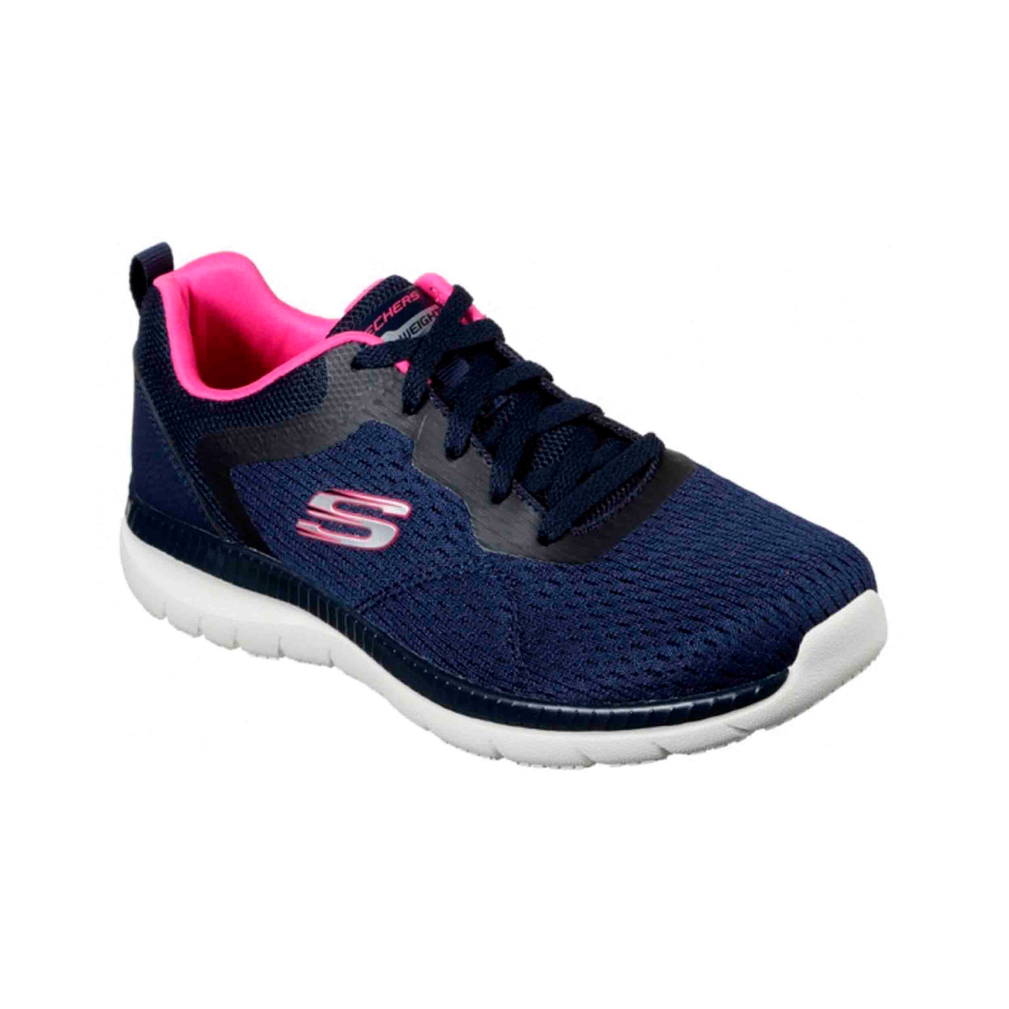 Tu Skechers Bountiful – Quick Path (referencia 12607‑NVHP) en combinación Navy / Hot Pink está pensada para mujer, con un diseño contemporáneo que combina estilo y rendimiento para quienes buscan confort en su día a día. La parte superior de suave malla knit permite una gran flexibilidad y ventilación, mientras que las capas sintéticas lisas añaden estructura y durabilidad.