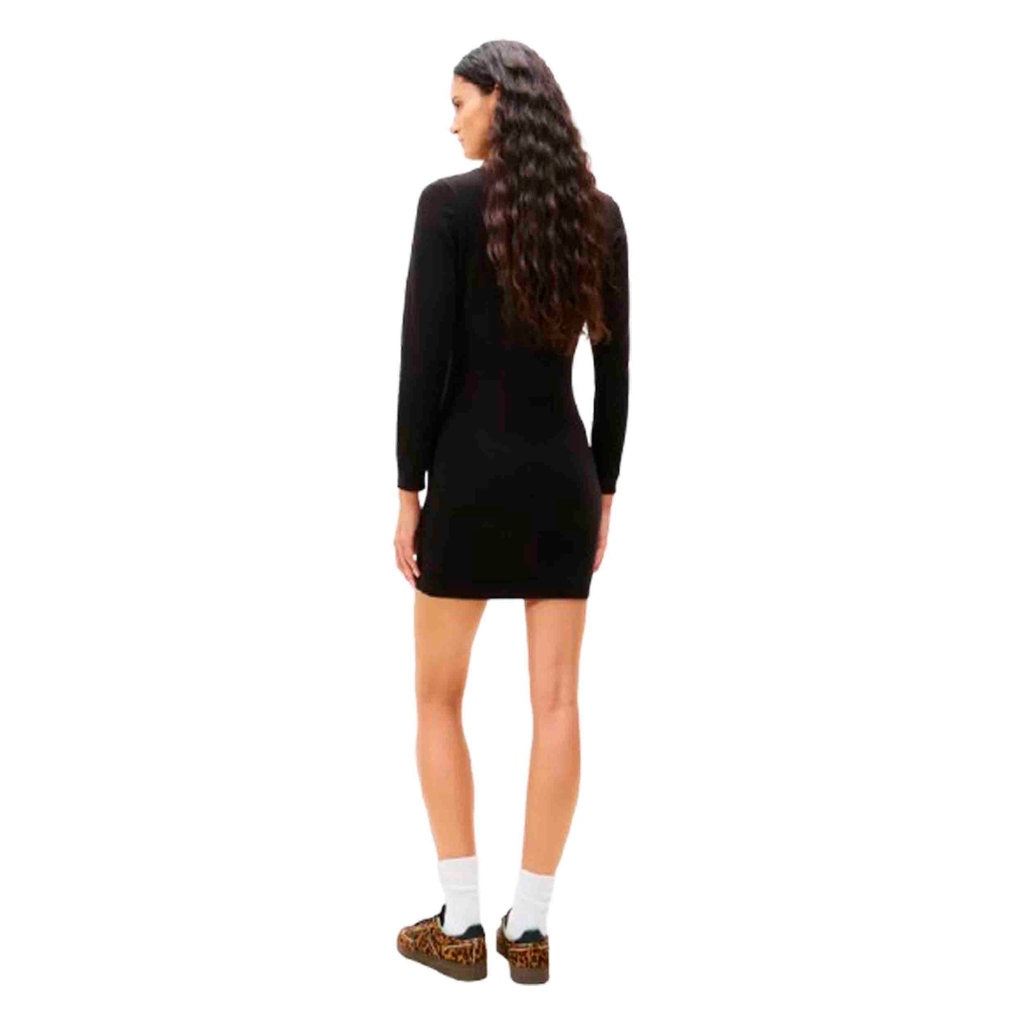 Su diseño presenta un corte ajustado (bodycon) que resalta la silueta femenina, mientras que el cuello vuelto proporciona un toque de sofisticación y calidez, ideal para los días más frescos. Las mangas largas y el largo por encima de la rodilla completan su estilo minimalista y versátil.