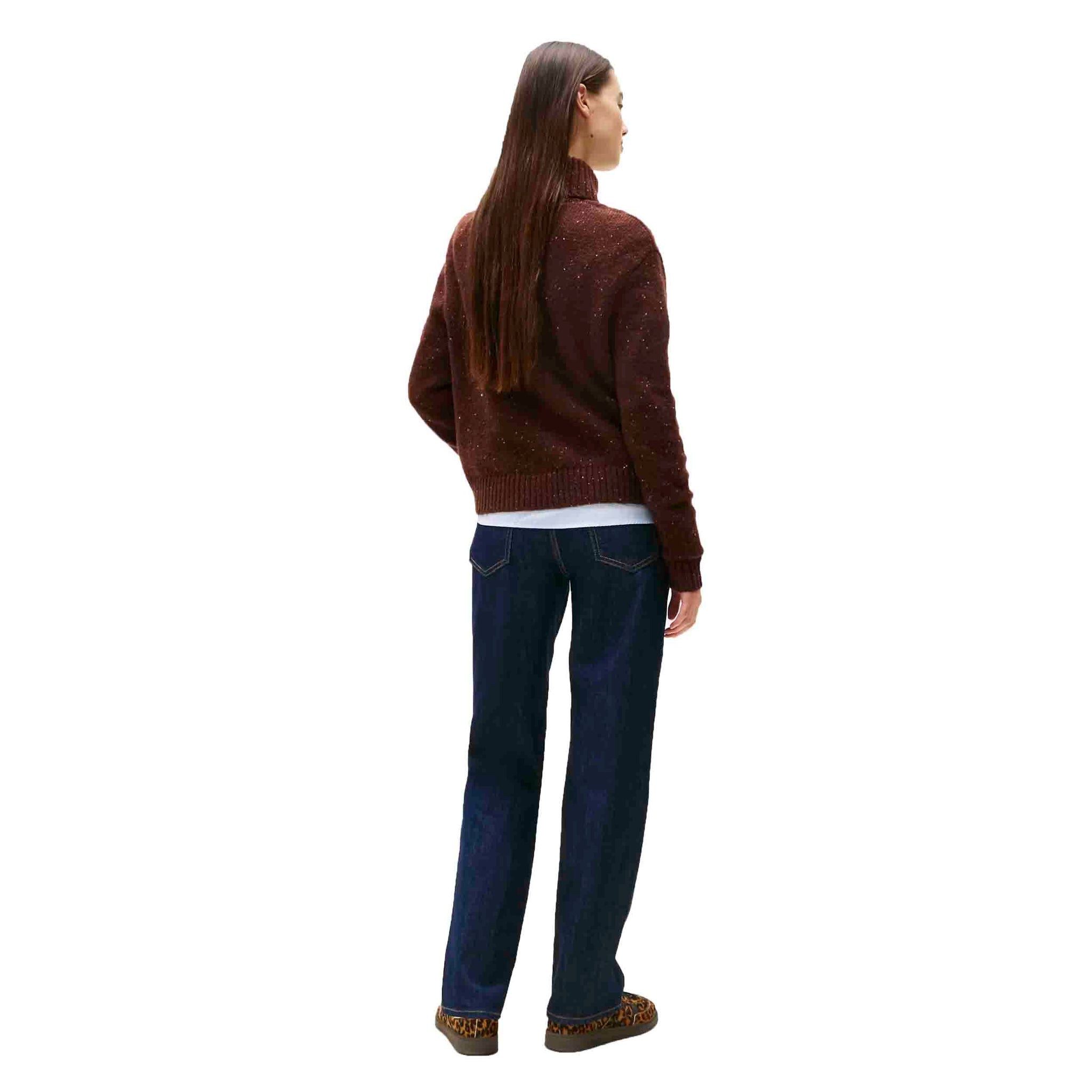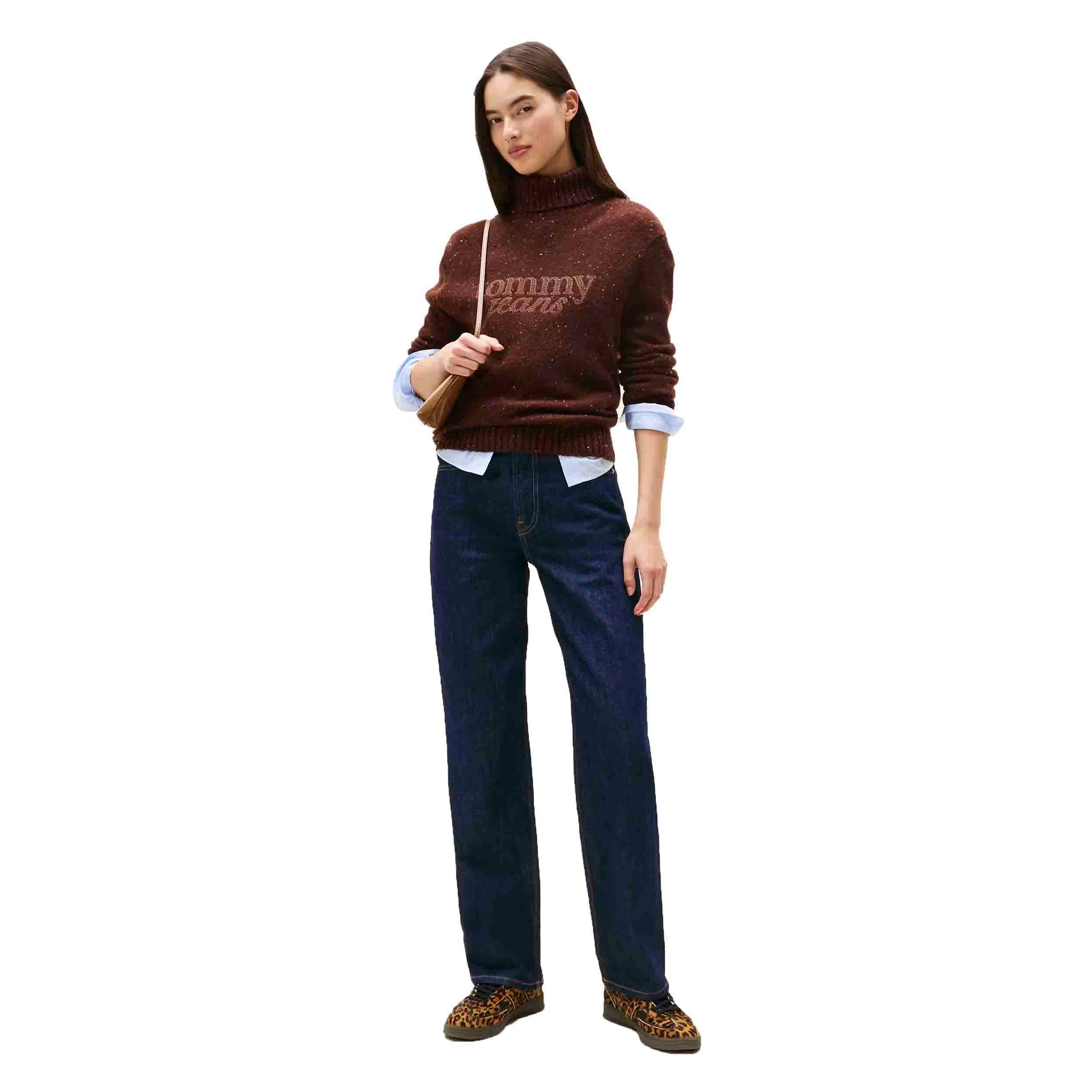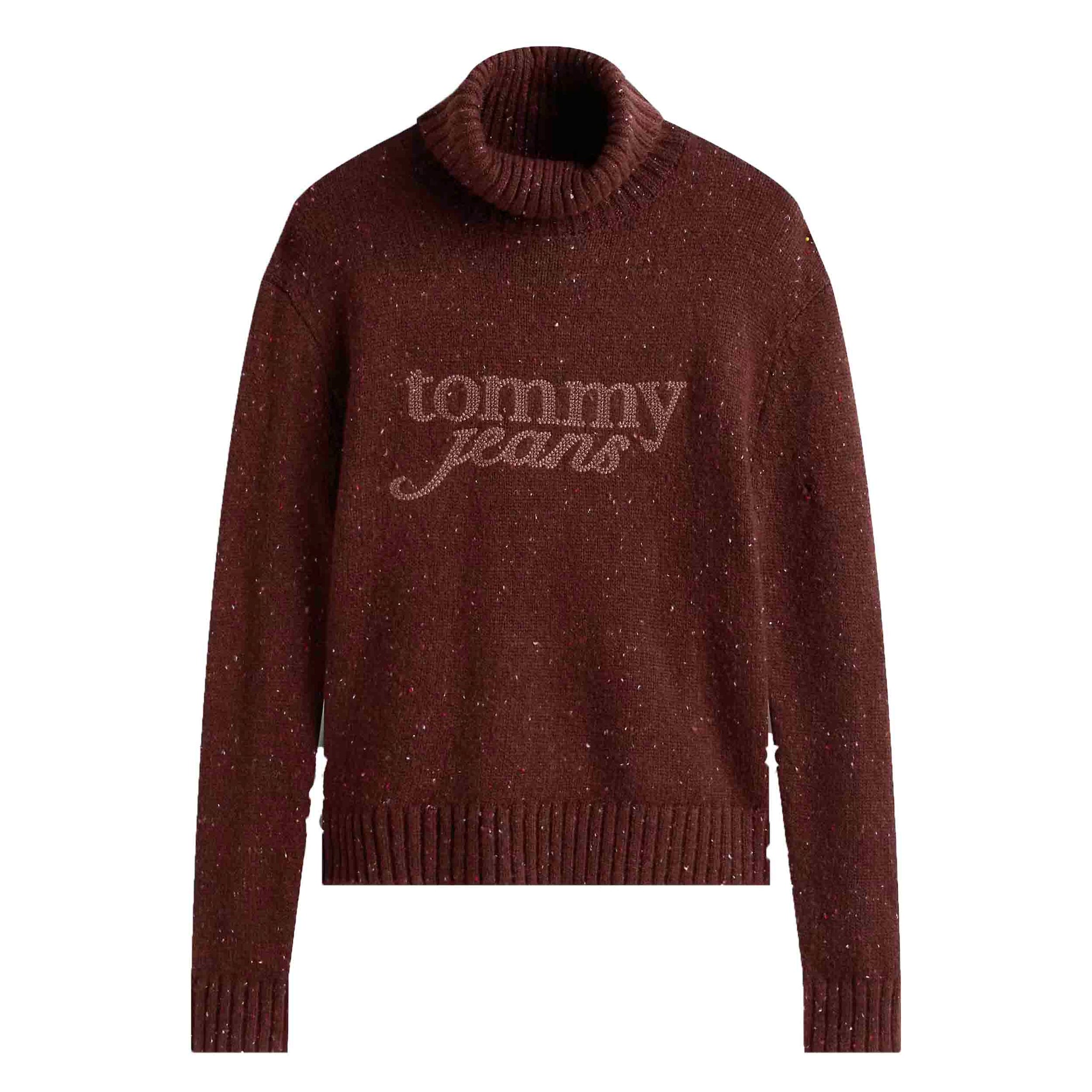 Palabras clave long-tail integradas para SEO: jersey cuello alto algodón 100% mujer marrón, jersey Tommy Jeans cuello vuelto mujer, jersey punto nep marrón para combinar con zapatillas, jersey cuello vuelto casual para outfit con sneakers. Incluye en la ficha bullets claros: material, corte, tipo de cuello, cuidados y combinaciones sugeridas para mejorar CTR y conversiones.