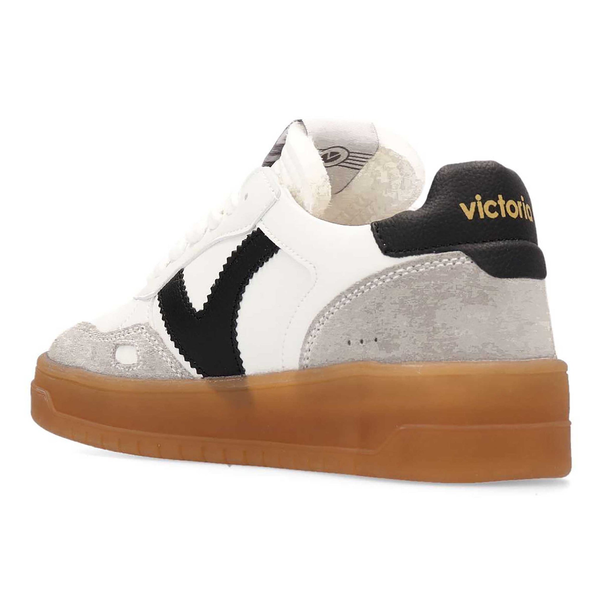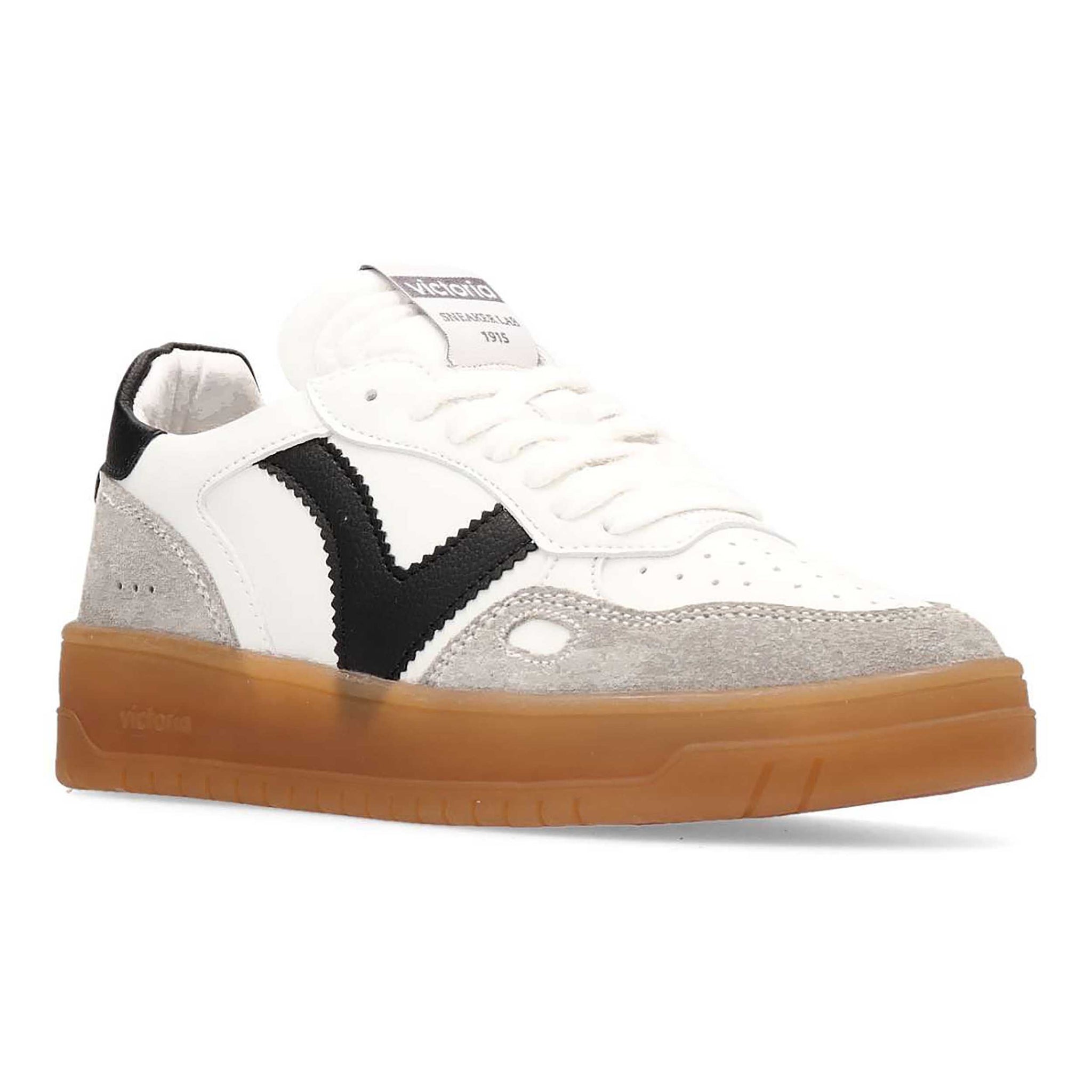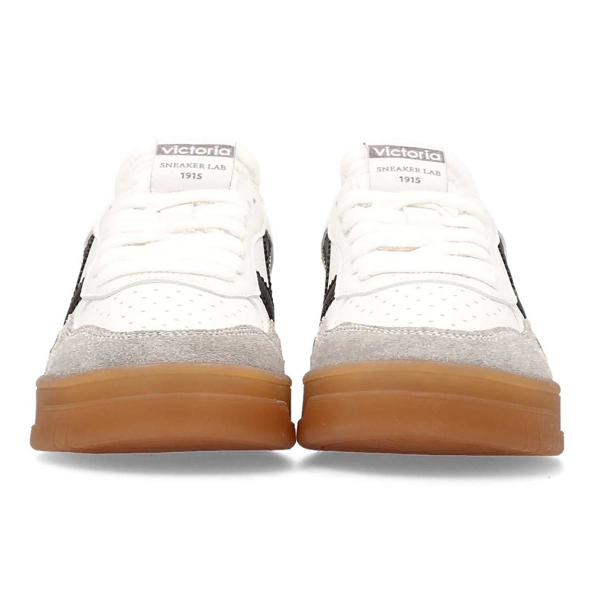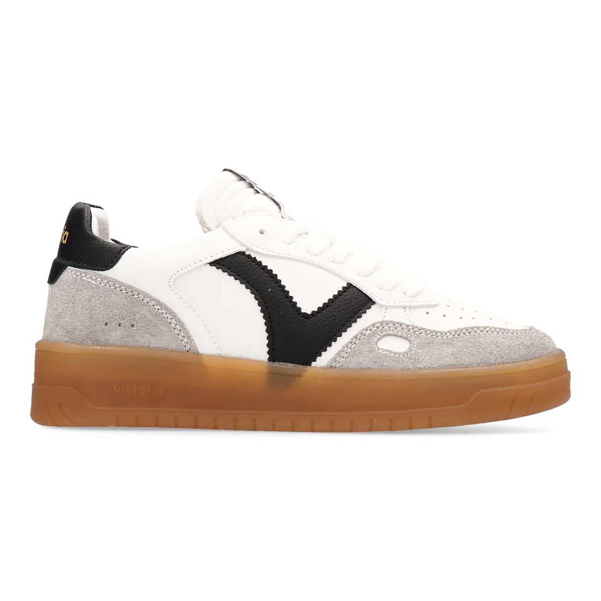 Zapatilla deportiva estilo casual. Sneakers cómodos, fabricados en piel y sintético, con suela de goma color caramelo. Plantilla acolchada y extraíble. Color blanco-negro. Silueta casual ideal para vestir sport con ropa urbana. Hecho en España.