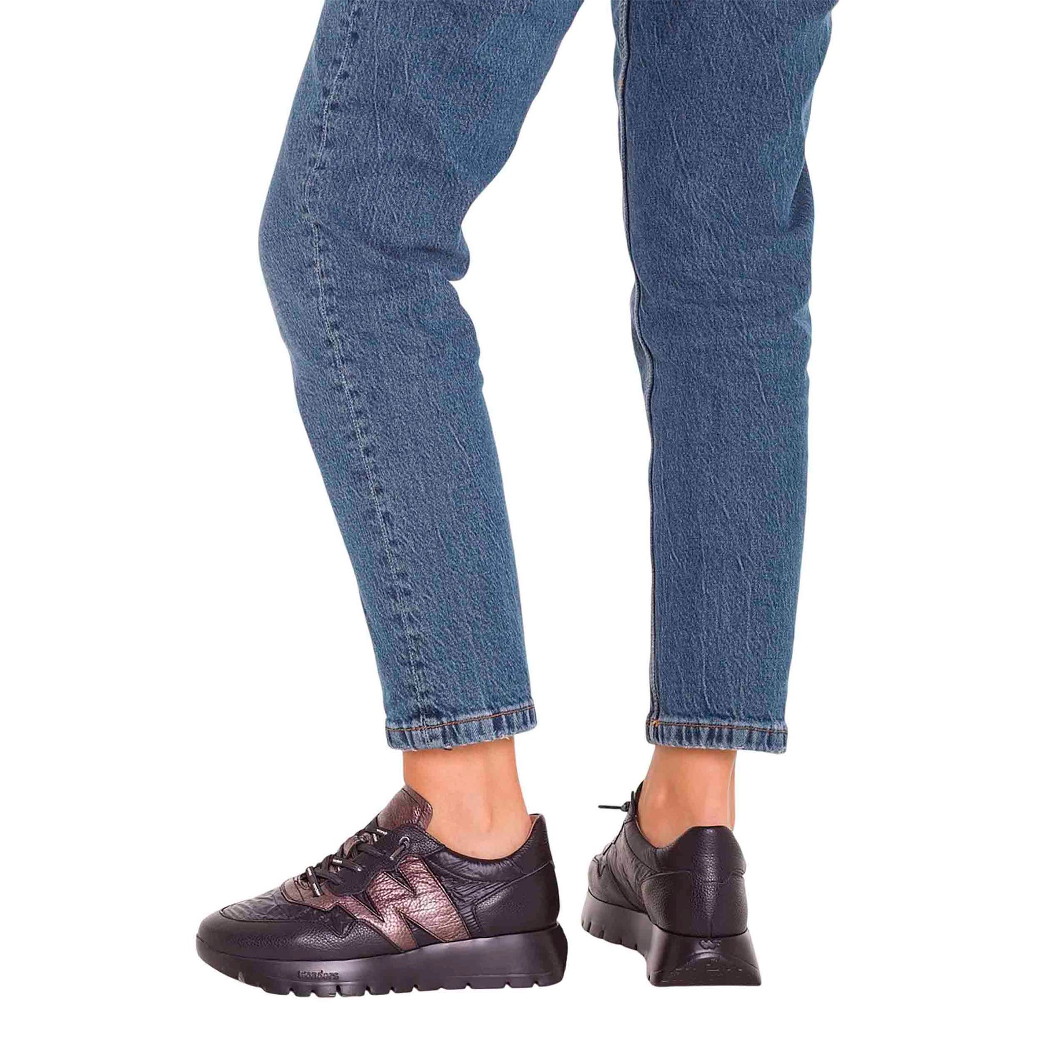 El diseño incorpora la emblemática “W” metálica en los laterales, creando contraste visual con el negro/oro y realzando ese aspecto premium que busca la mujer contemporánea. La combinación de materiales y tonos hace de Odisei 91 una pieza versátil: puedes integrarla con pantalones oscuros, looks monótonos o con acentos dorados sin perder coherencia estética. Su construcción incluye asimismo una fabricación responsable certificada por Leatherworking Group, respaldando calidad y sostenibilidad.